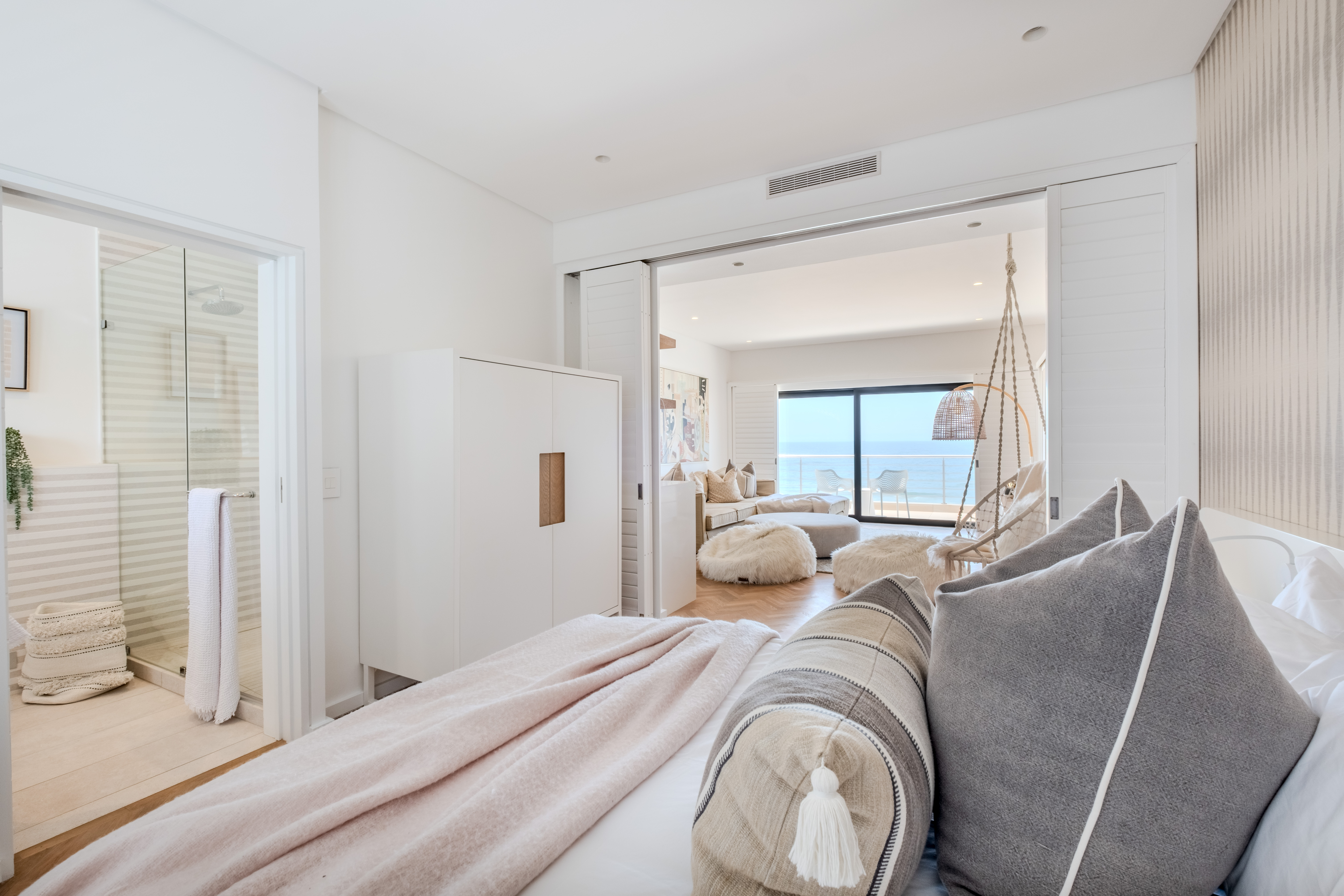The third level opens to a stylish slipper lounge with balcony access and uninterrupted sea views. This inviting space includes an integrated bar fridge and a sleek mini bar/coffee station. A second master suite, discreetly set behind decorative screening, offers an en-suite with shower, vanity, and WC. An additional bedroom with a four-poster bed opens directly onto the balcony, complemented by a full family bathroom with bath, extra-length shower, vanity, and WC