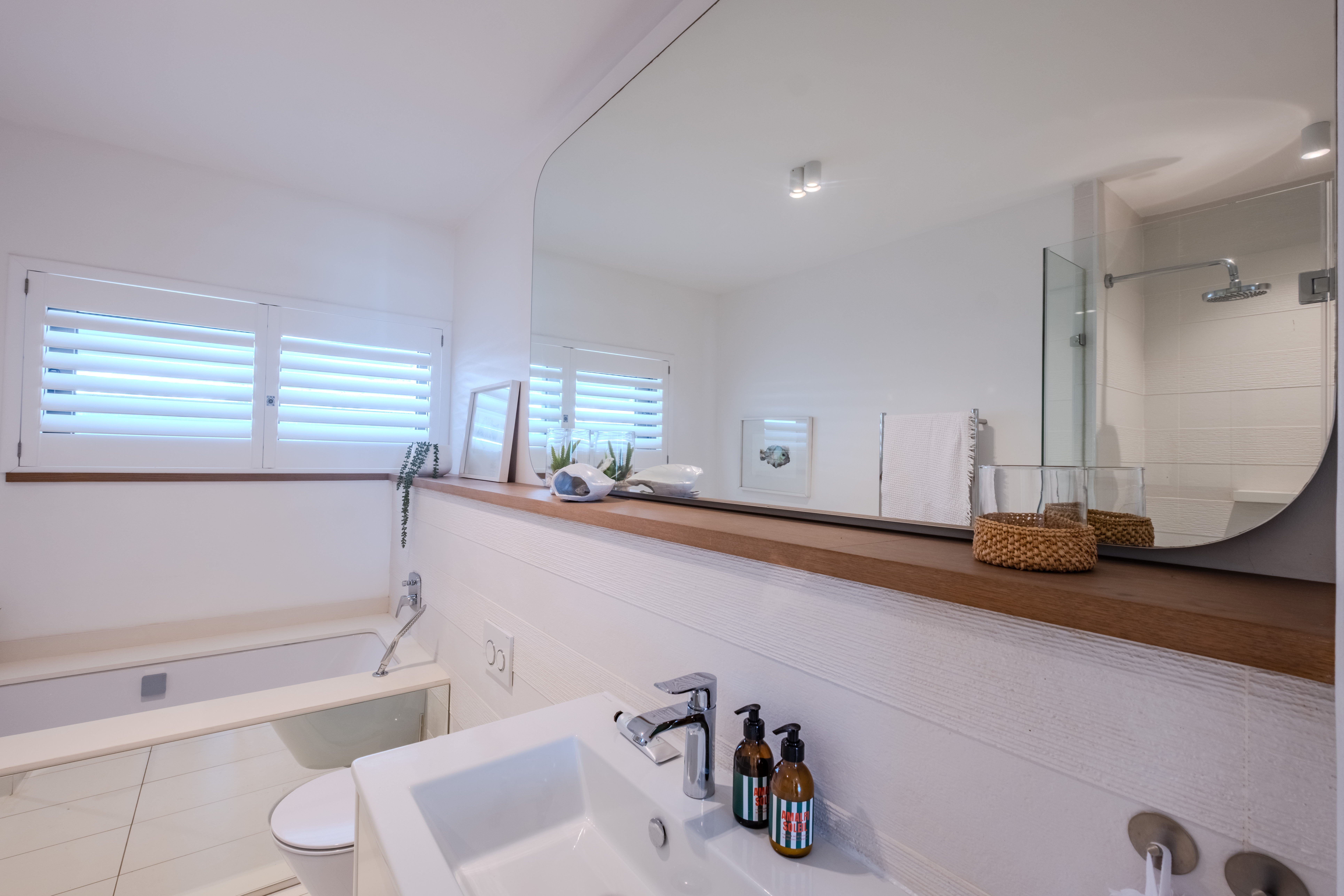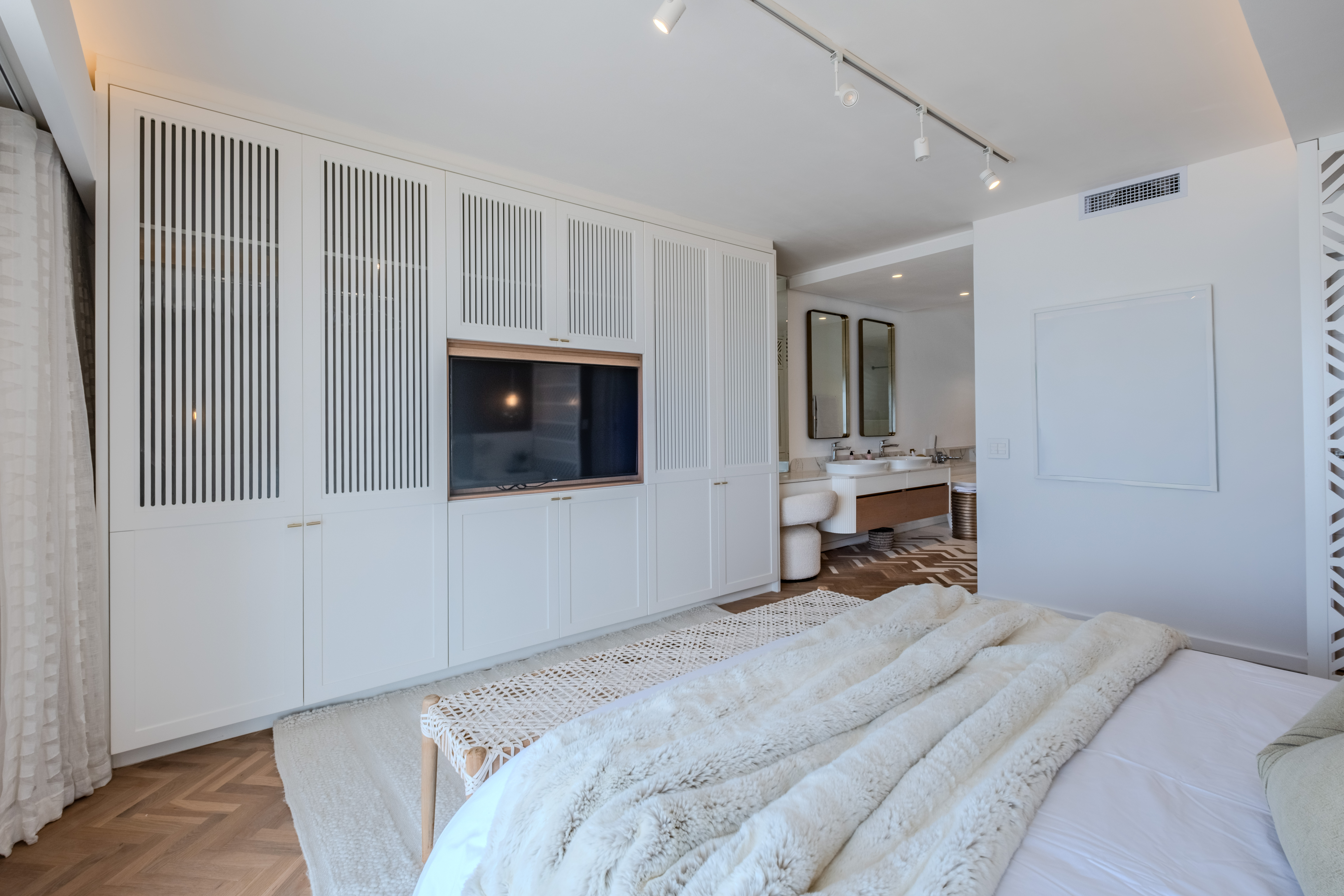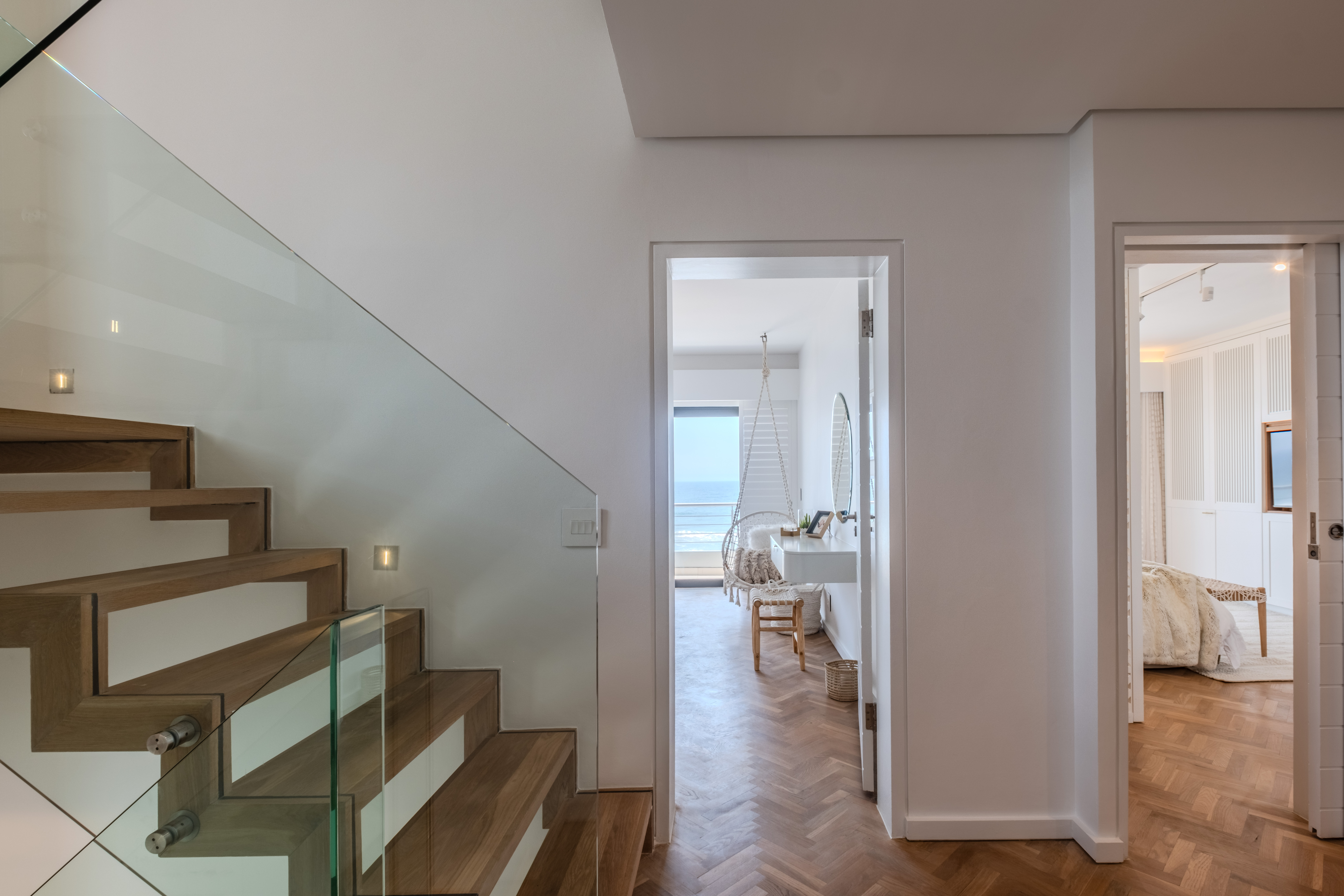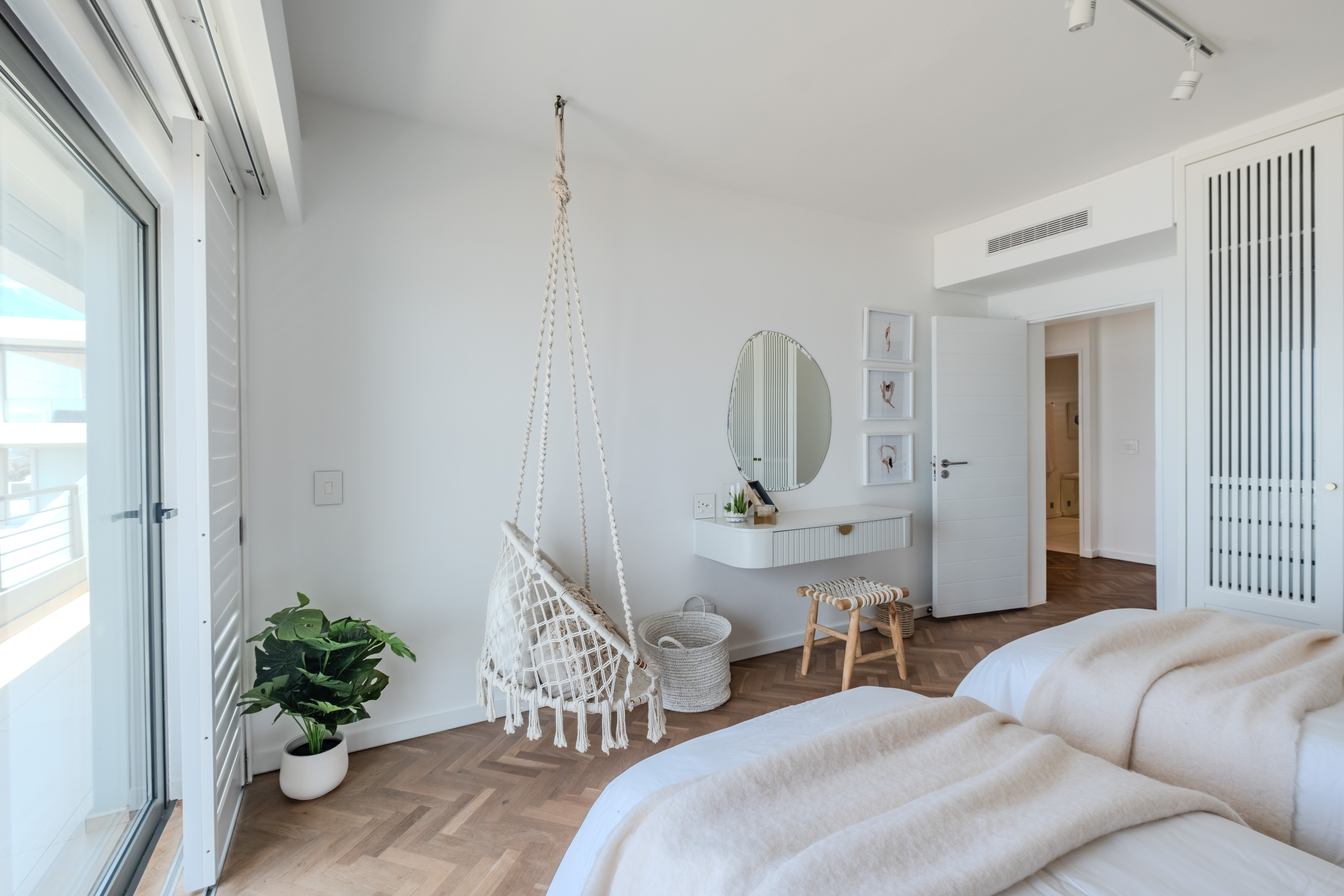 The second floor hosts three bedrooms and two bathrooms, including the primary suite — a serene retreat boasting balcony access, captivating sea views, a walk-through wardrobe, and a full en-suite bathroom with double vanity, freestanding bath, extra-length shower, and WC. The family bathroom also offers a full suite of amenities. The twin-bedded bedroom enjoys balcony access and breathtaking ocean vistas, while the third bedroom features a convenient pull-out bed. Imported double-glazed windowpanes from Greece ensure tranquillity, muting the rhythm of the waves, and the illuminated wardrobes add a touch of luxury and practicality.