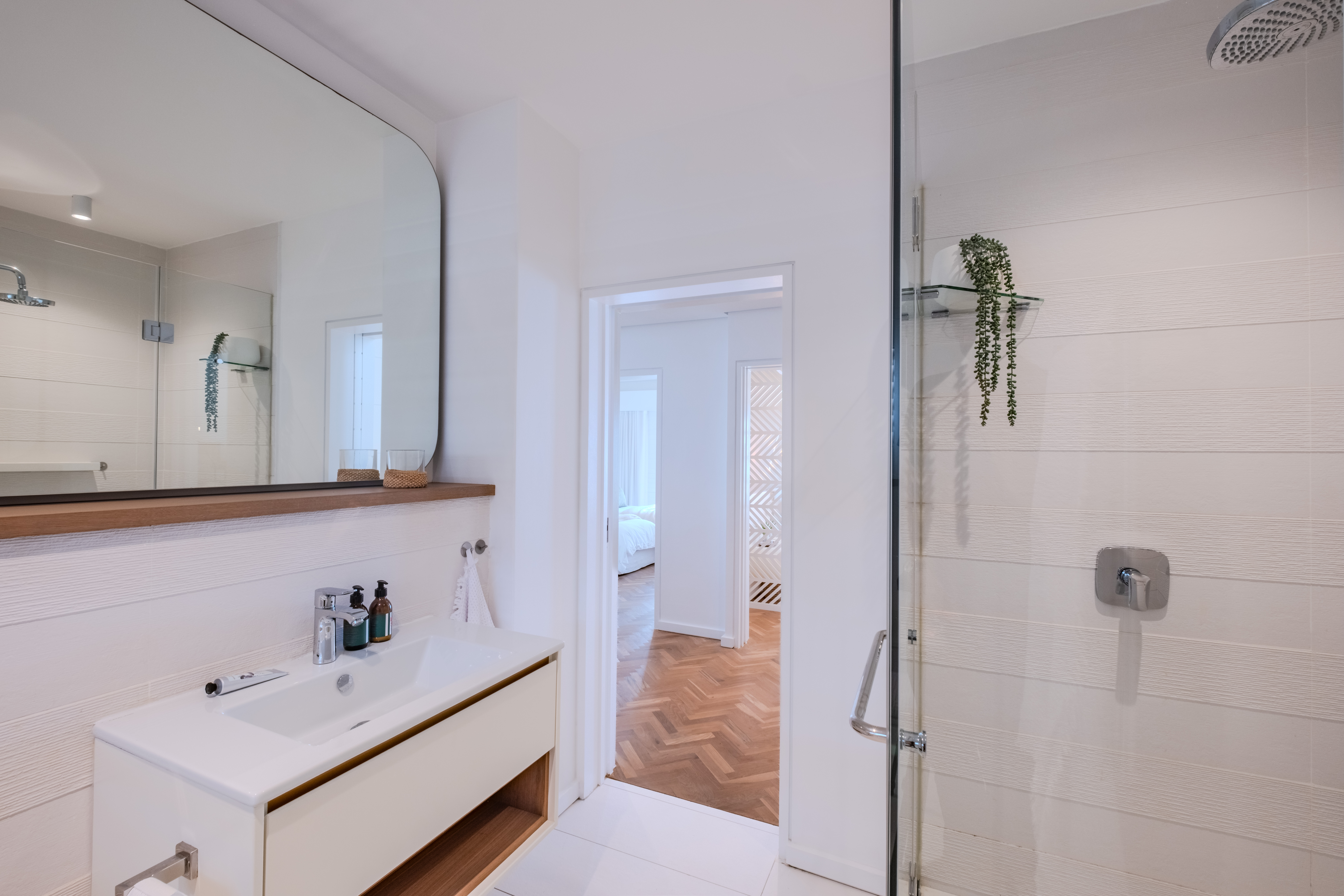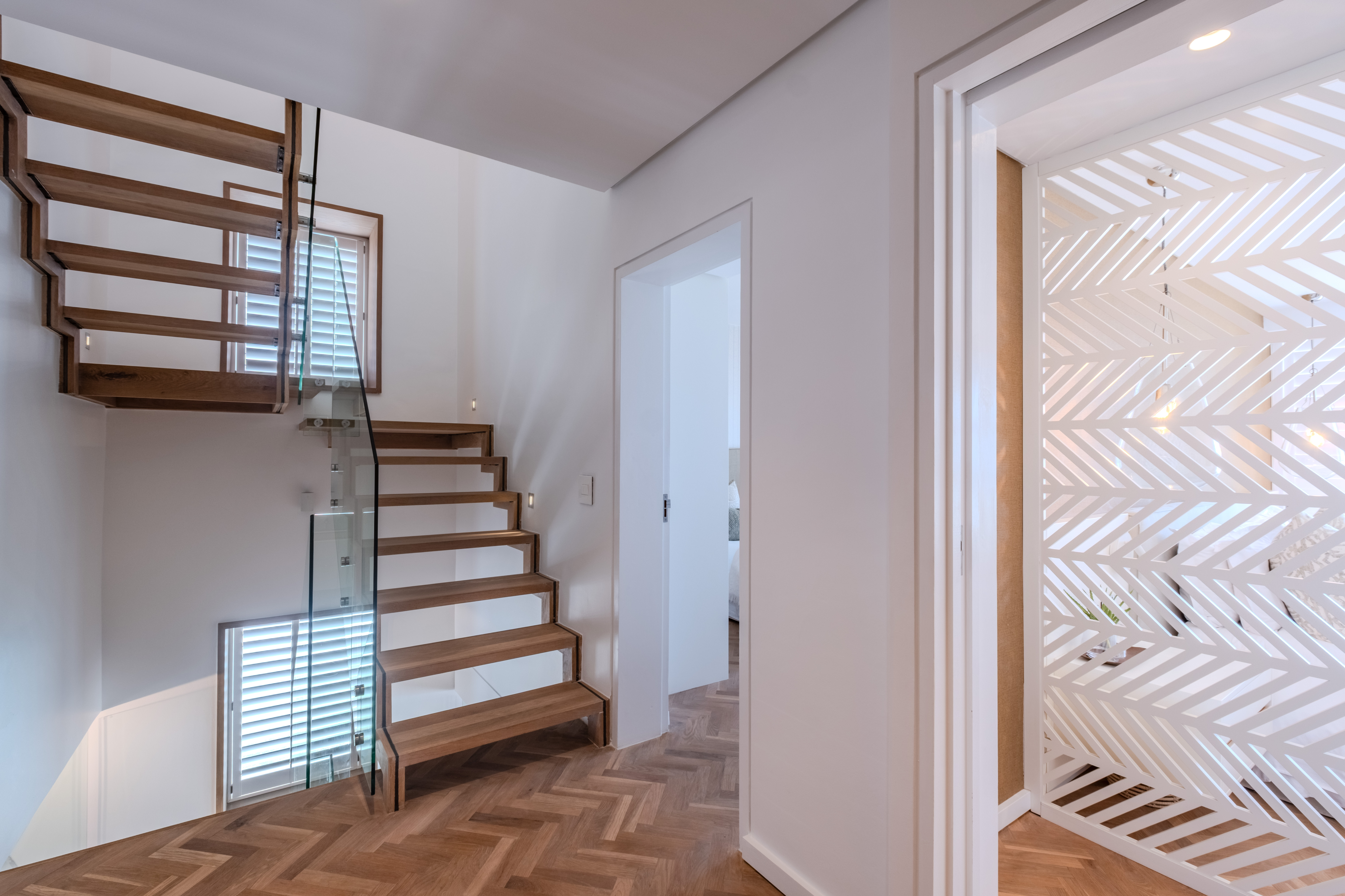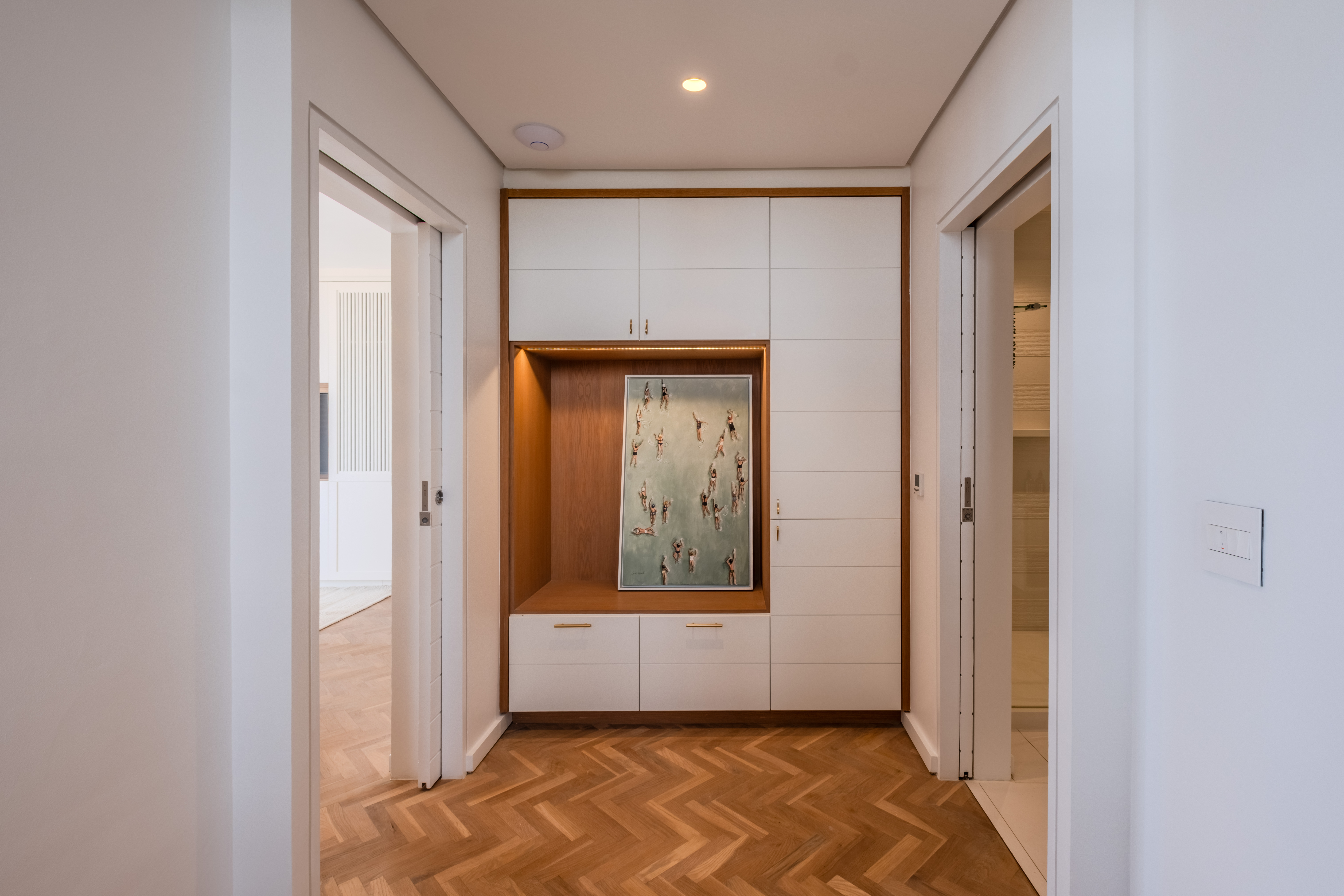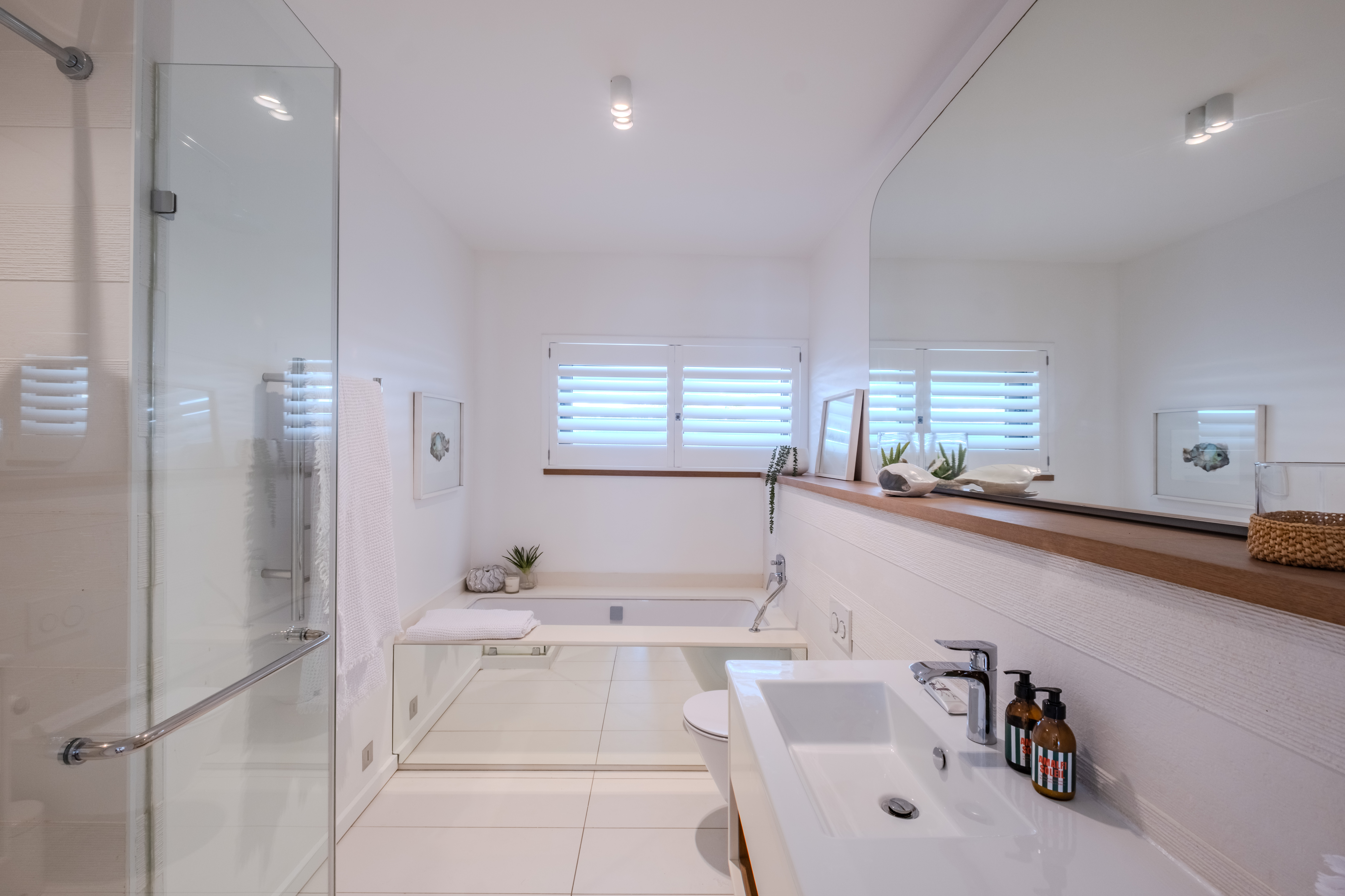 The second floor hosts three bedrooms and two bathrooms, including the primary suite — a serene retreat boasting balcony access, captivating sea views, a walk-through wardrobe, and a full en-suite bathroom with double vanity, freestanding bath, extra-length shower, and WC. The family bathroom also offers a full suite of amenities. The twin-bedded bedroom enjoys balcony access and breathtaking ocean vistas, while the third bedroom features a convenient pull-out bed. Imported double-glazed windowpanes from Greece ensure tranquillity, muting the rhythm of the waves, and the illuminated wardrobes add a touch of luxury and practicality.