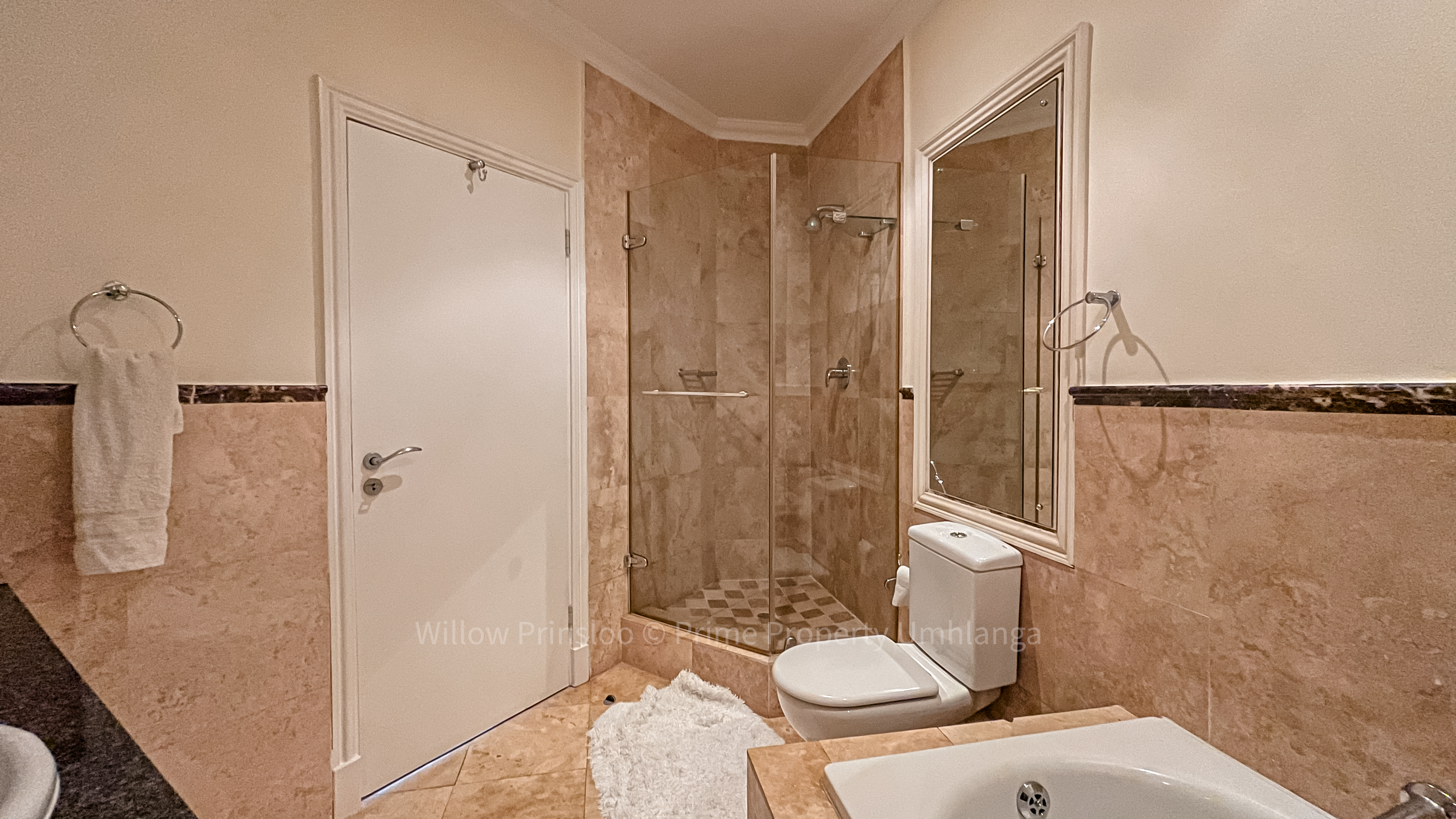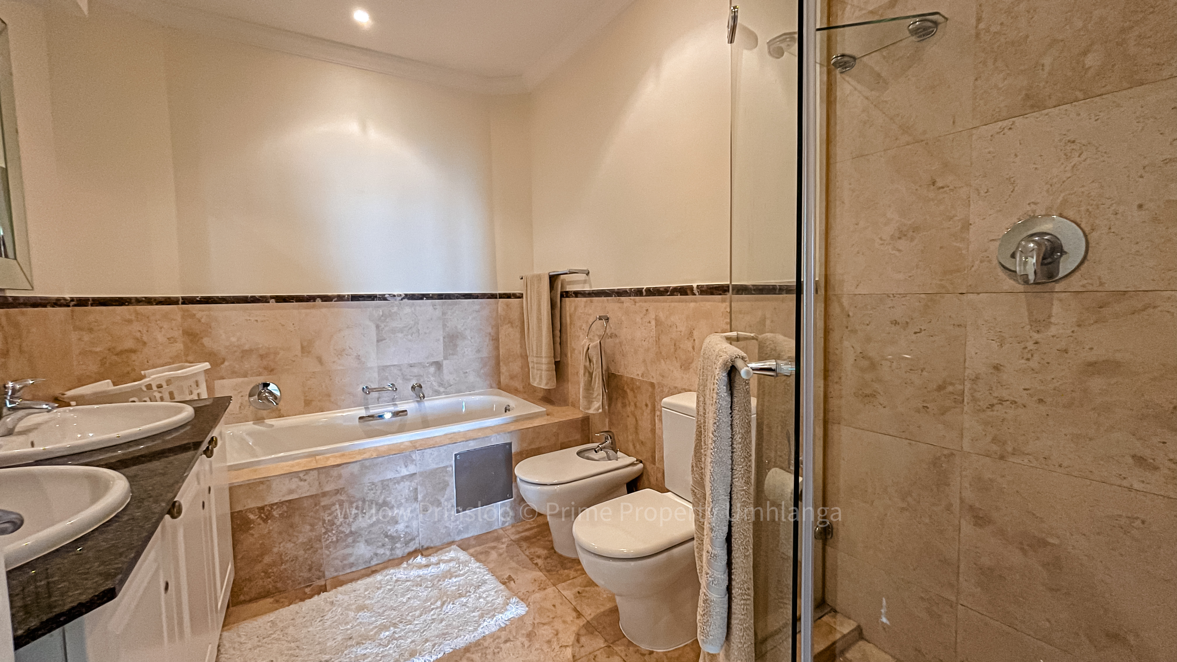 The master bedroom exudes opulence, with an en-suite bathroom adorned with marble finishes and a large soaking tub, perfect for unwinding after a long day.