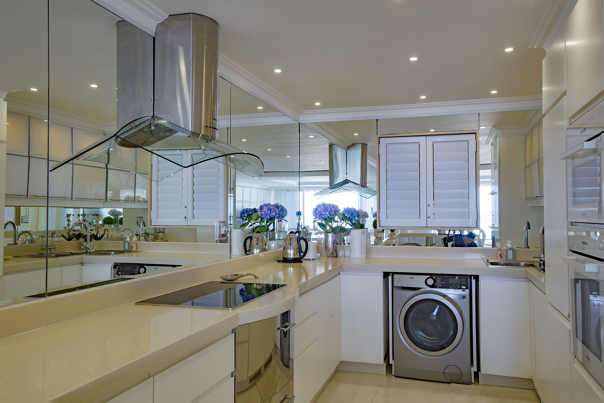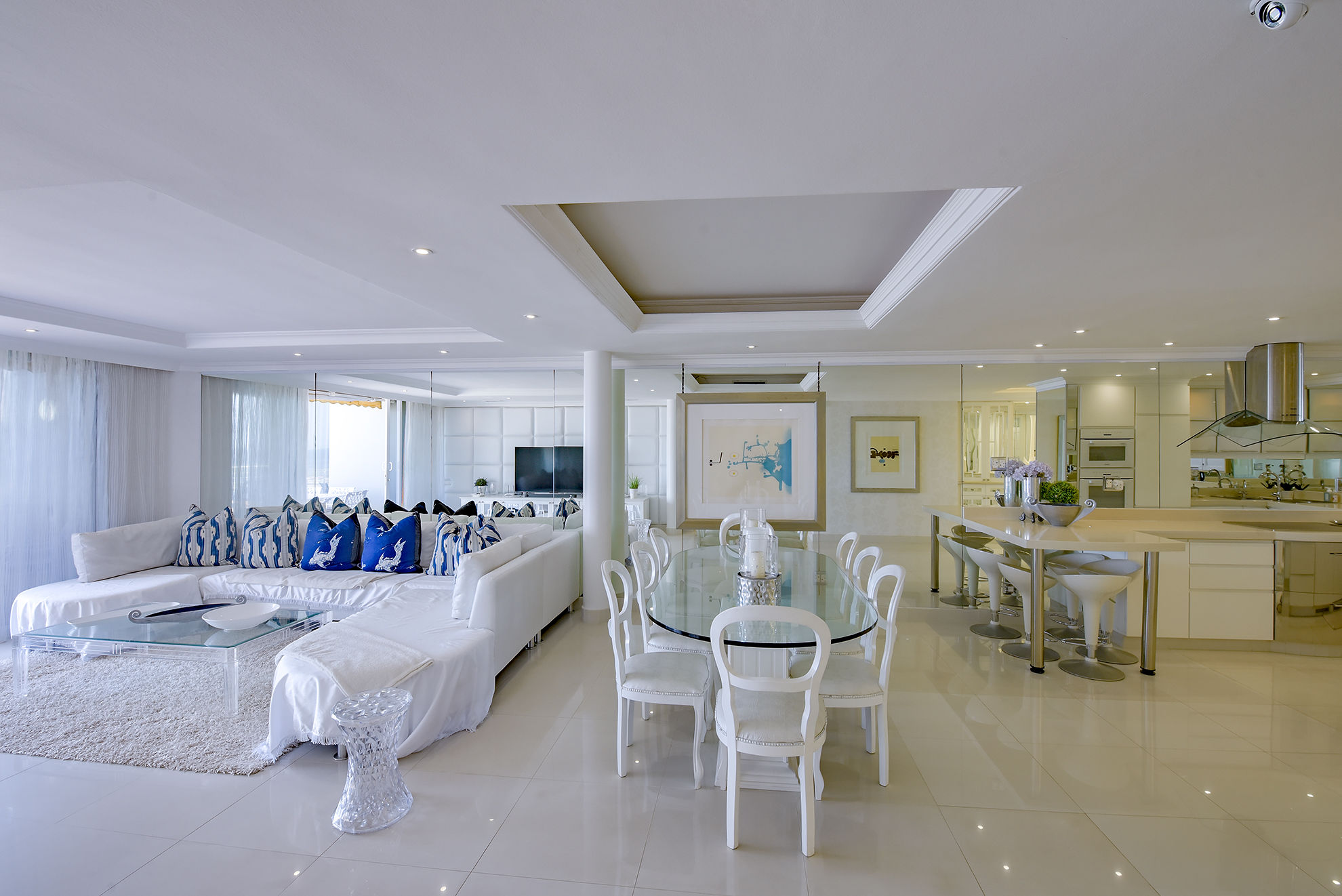 The modern kitchen is equipped with premium finishes and ample storage, while large windows allow natural light to flood the apartment.