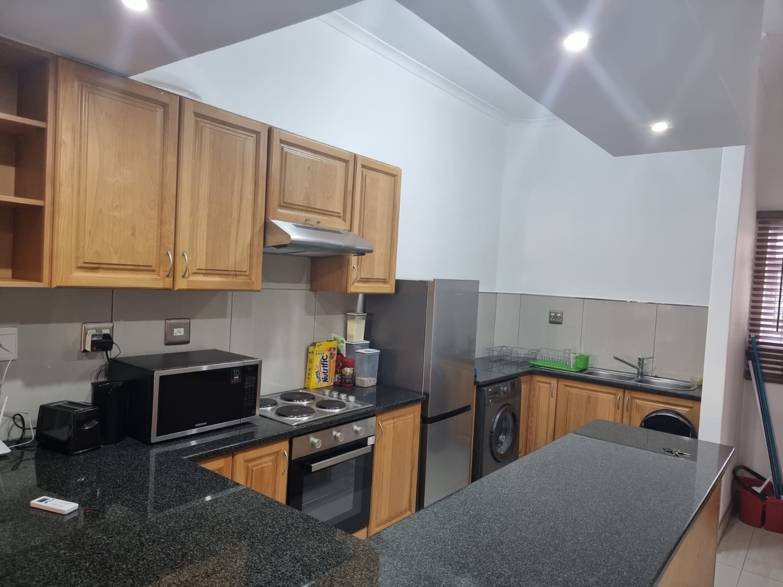 Step into a light-filled open-plan living space where sleek contemporary design meets comfort. Open plan kitchen with fully fitted cupboards, lounge and dining area.