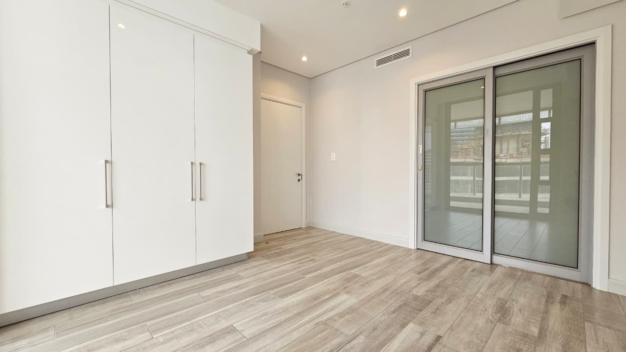 The bedroom is well-sized with built-in cupboards, while the bathroom is beautifully designed with modern, high-quality fittings.