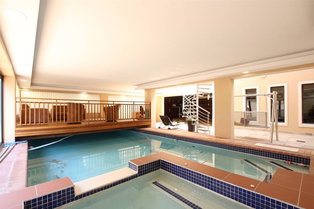 Clean, chic and spacious. One enters onto an open plan reception area which flows seamlessly onto the first of 3 lounges and the massive gourmet kitchen with separate scullery and high end appliances. Let your inner foodie run wild in this cooks play ground! On the same floor just off the lounge is the first bedroom which is airconditioned and has its own bathroom. There is also a home office or study and a glorious indoor pool complete with a decked lounging area, steam shower and indoor courtyard that is showered in sunlight through the large skylight allowing you to entertain in style rain or shine.