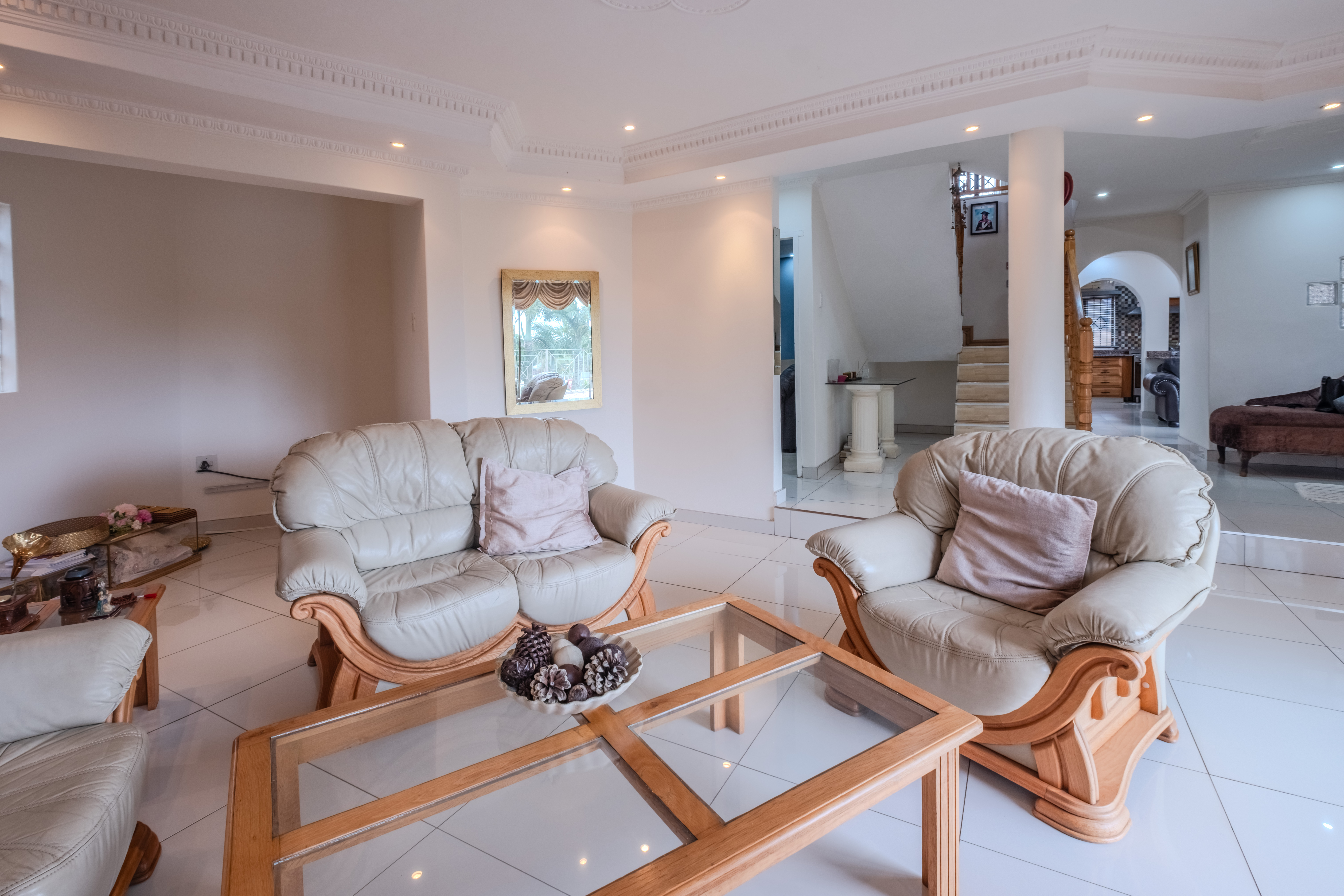 The open-plan lounge, dining area, and spacious kitchen with Caesarstone countertops and a separate scullery form the heart of this inviting home. The well-designed layout also includes a second TV lounge, plus a study.