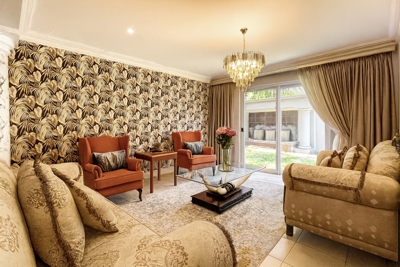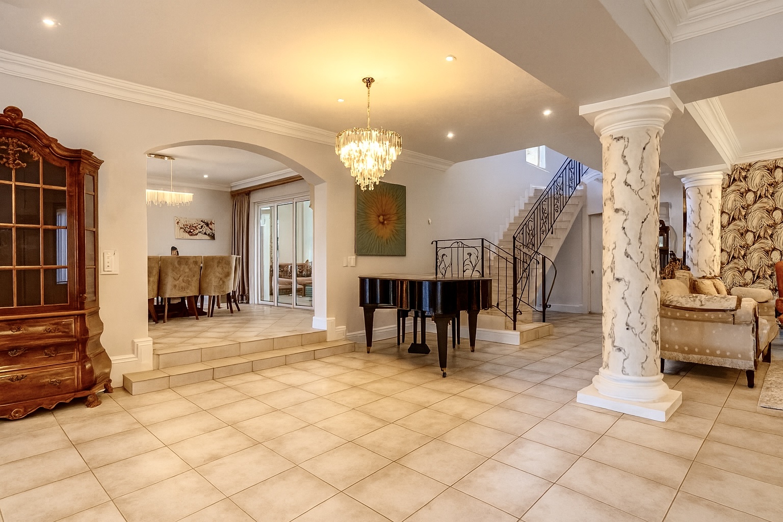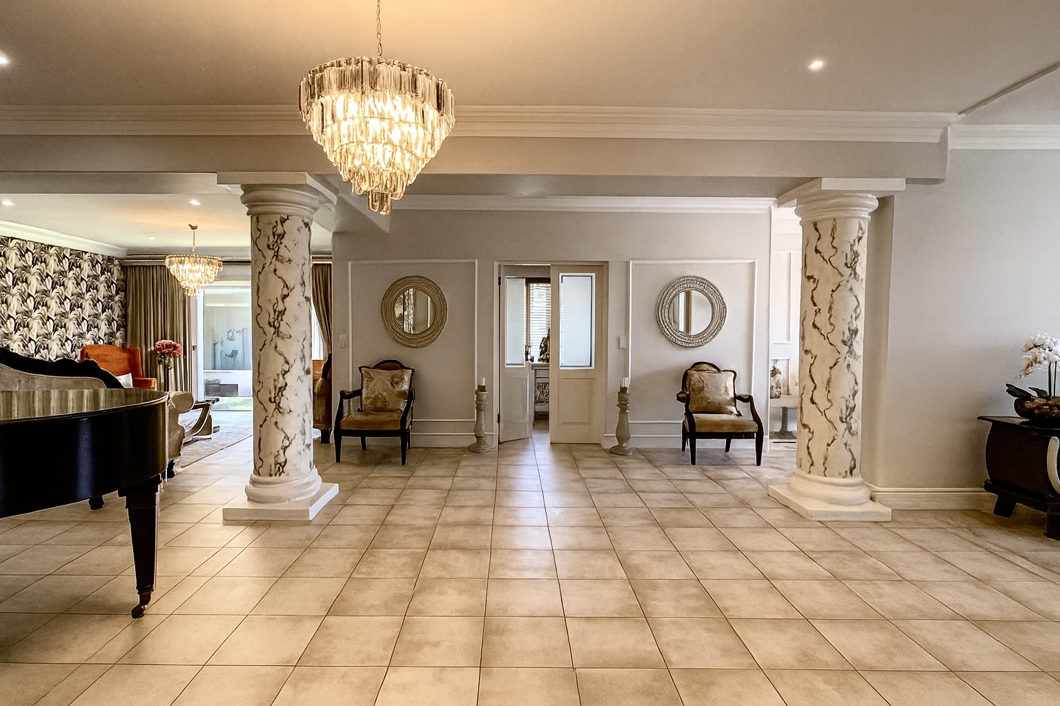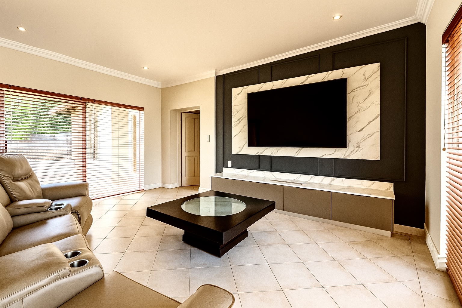 The Tuscan-inspired design extends to the outdoor spaces, featuring a sparkling pool, a covered entertainment patio with a built-in braai, and a beautifully landscaped garden. Perfect for summer evenings and al fresco dining.