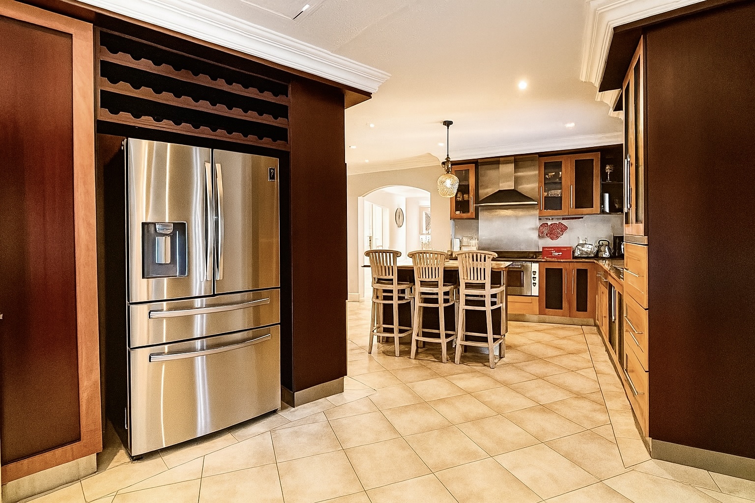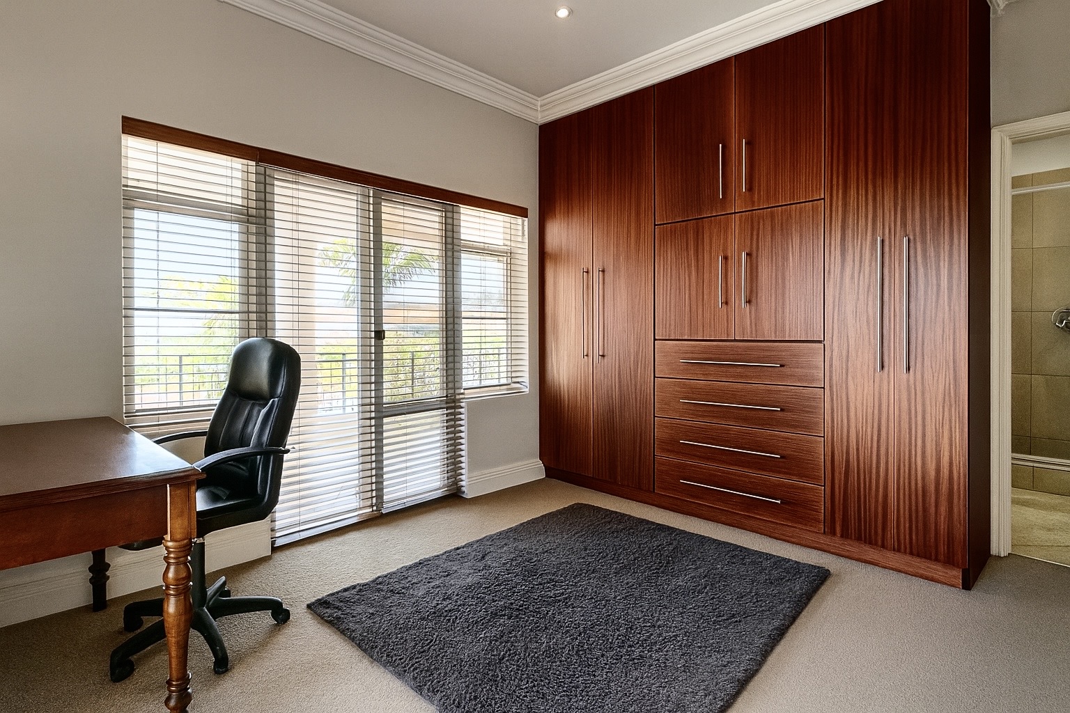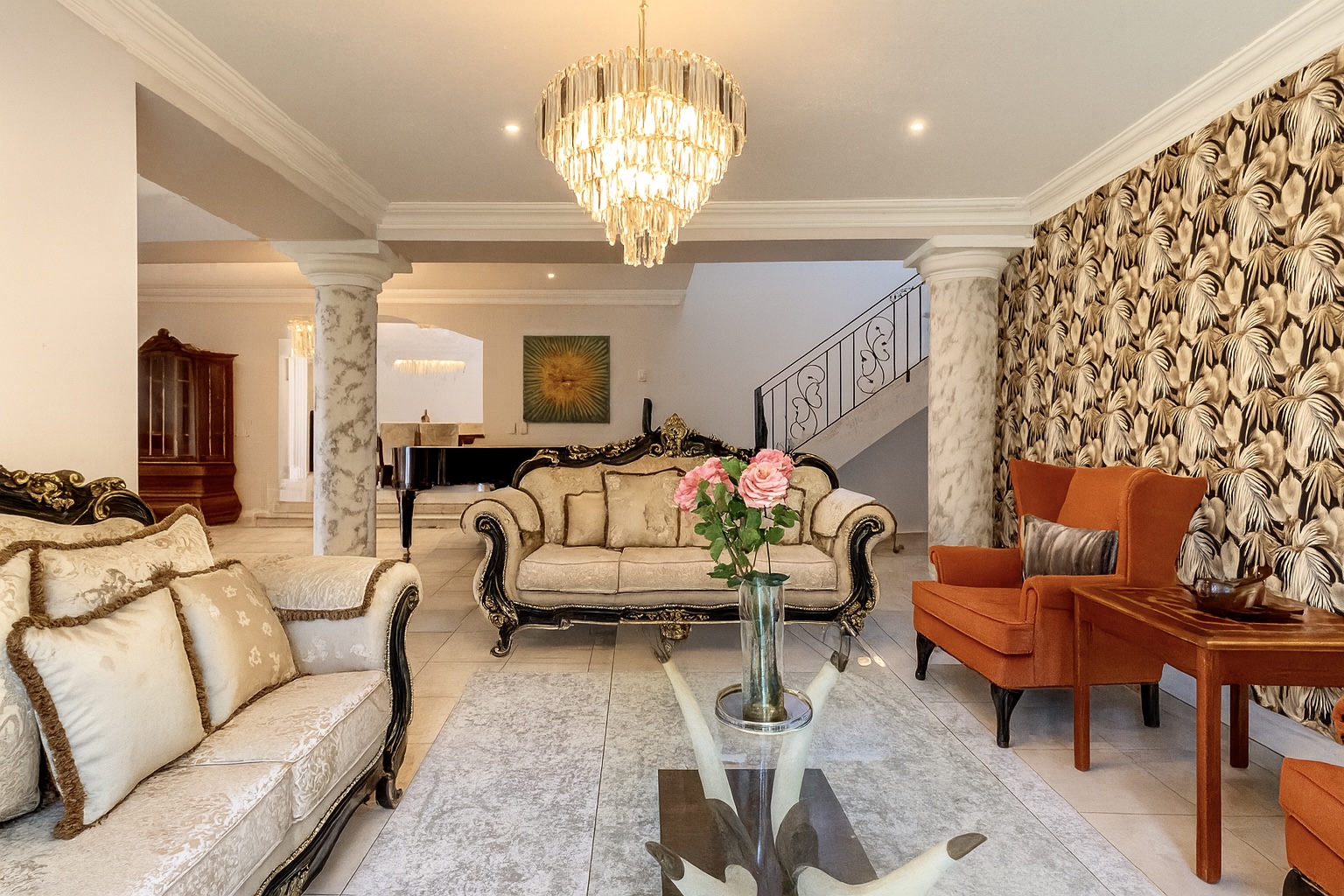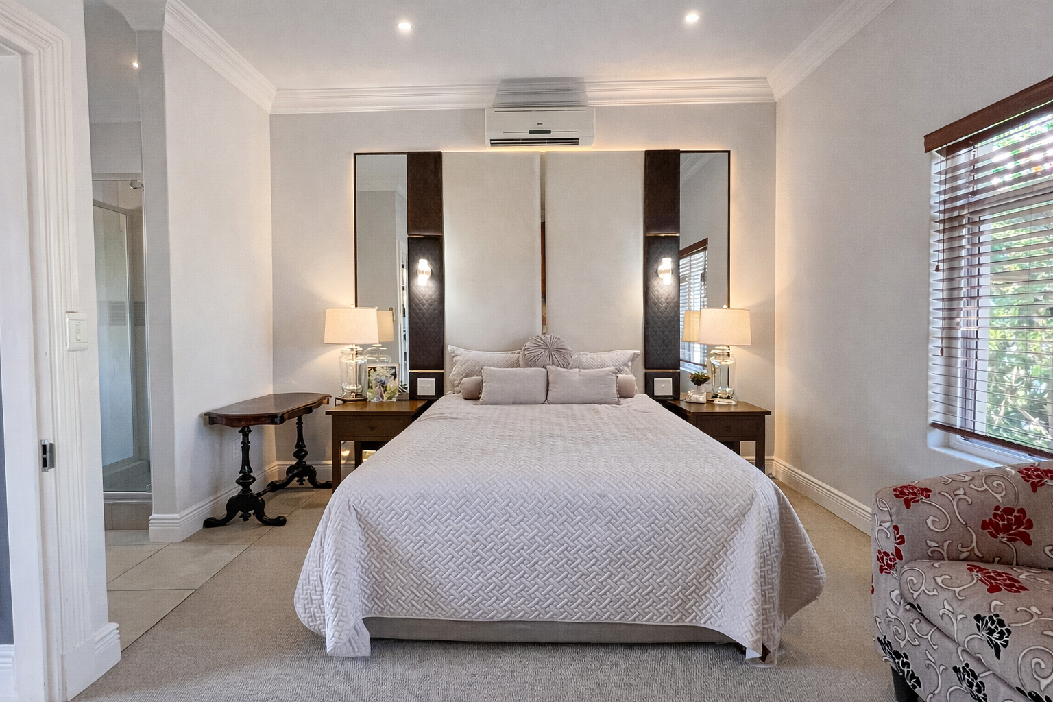 The Tuscan-inspired design extends to the outdoor spaces, featuring a sparkling pool, a covered entertainment patio with a built-in braai, and a beautifully landscaped garden. Perfect for summer evenings and al fresco dining.