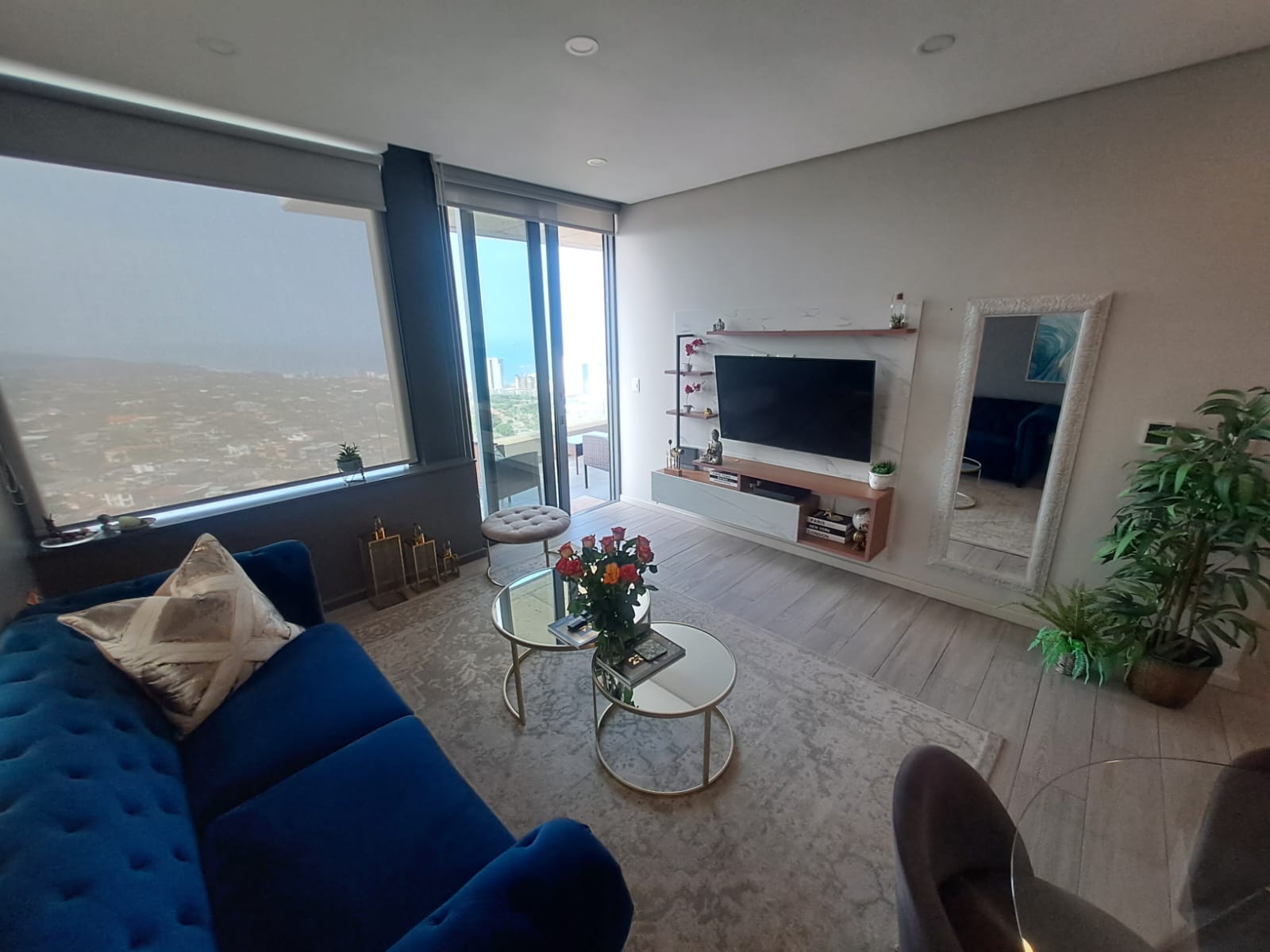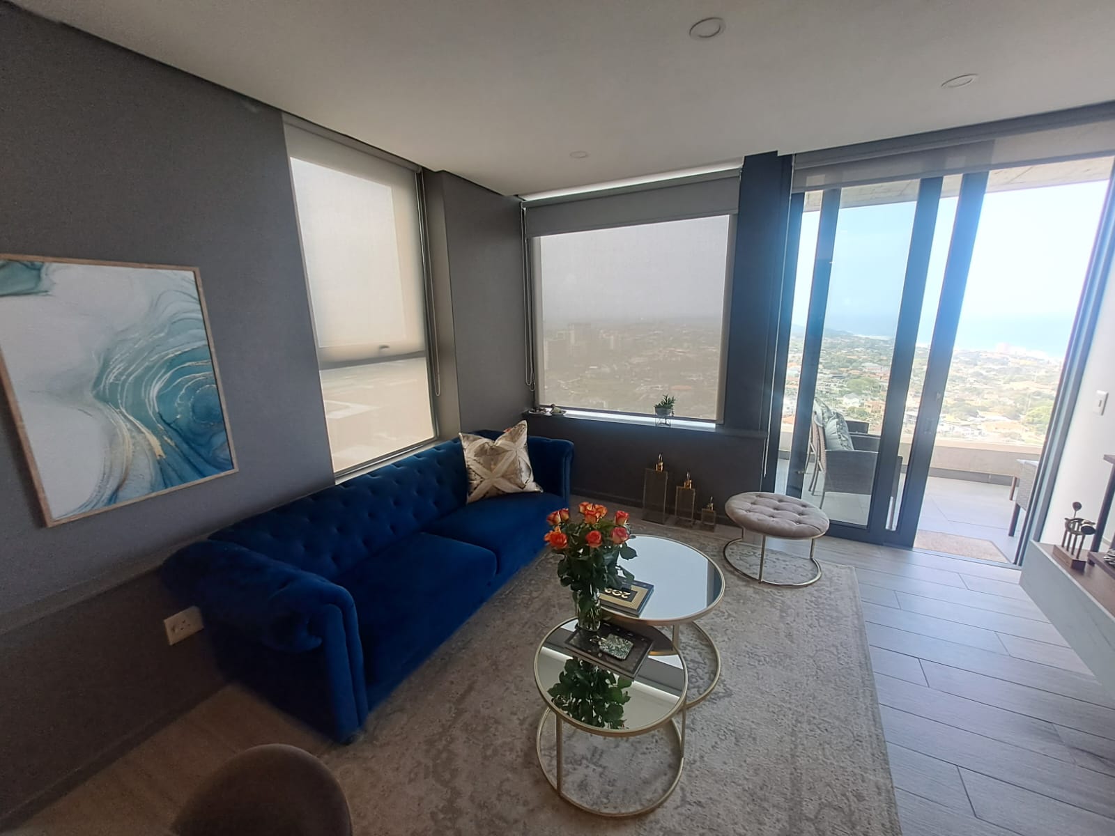 Open-plan lounge leading to a spacious balcony with sea views