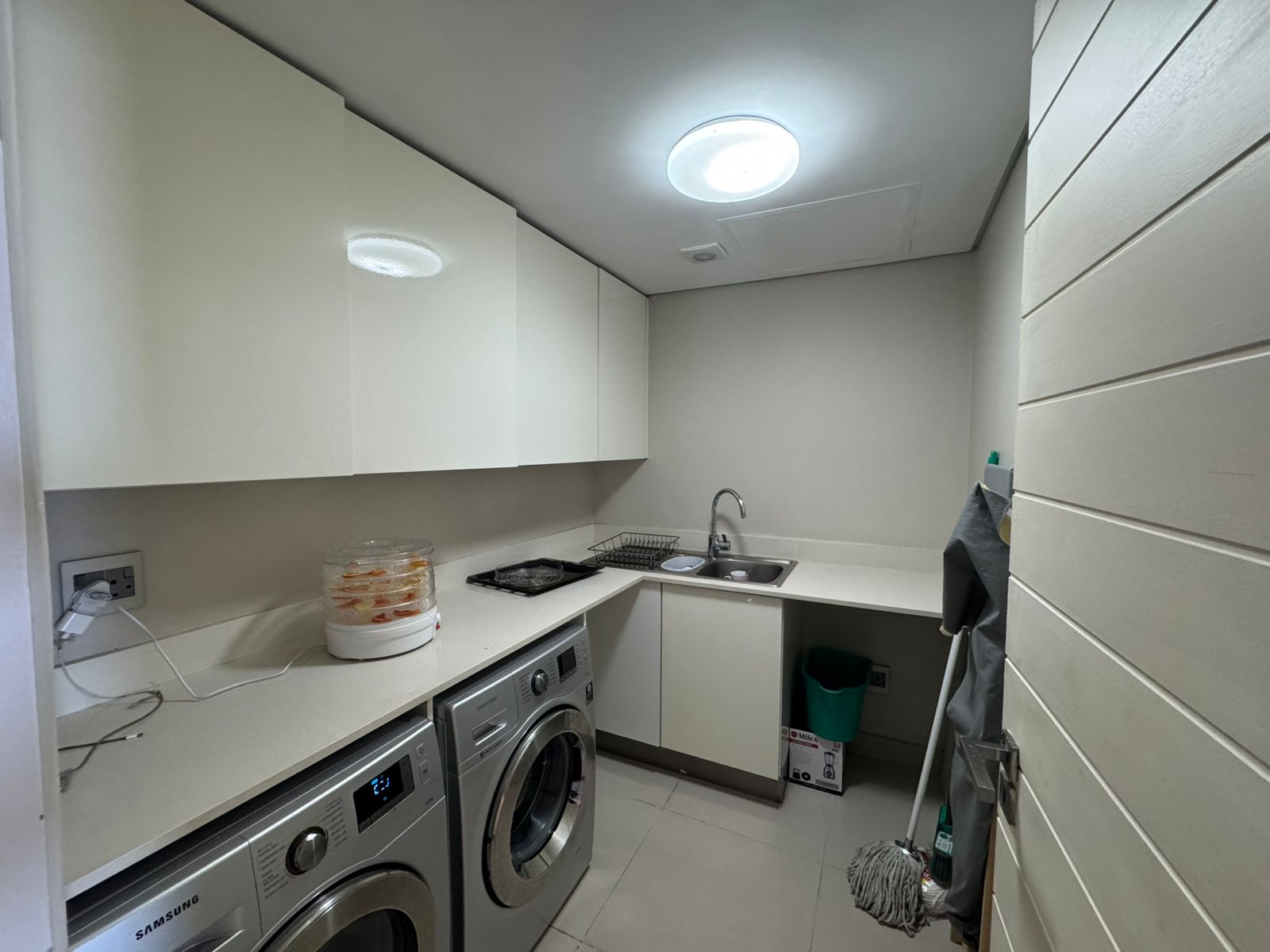Fitted with appliances, kitchen scullery and elegant pendant lighting, the kitchen seamlessly flows into the living area, creating a bright and inviting space. High-gloss tiled floors and neutral tones enhance the sense of space and style.