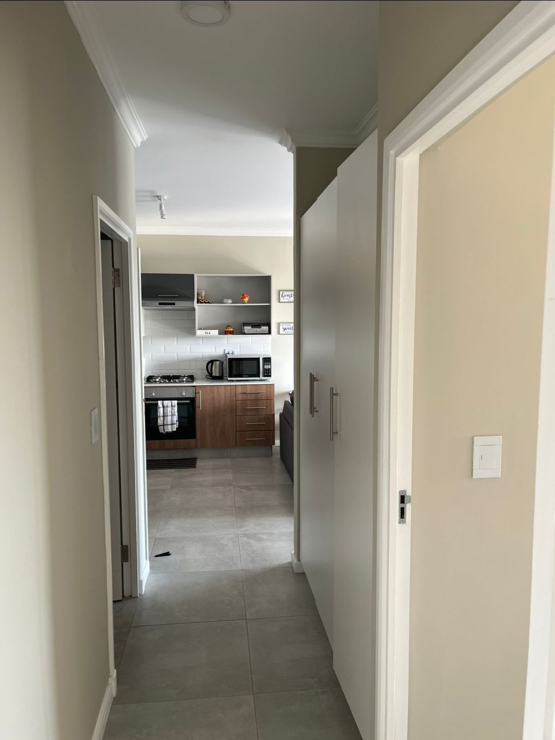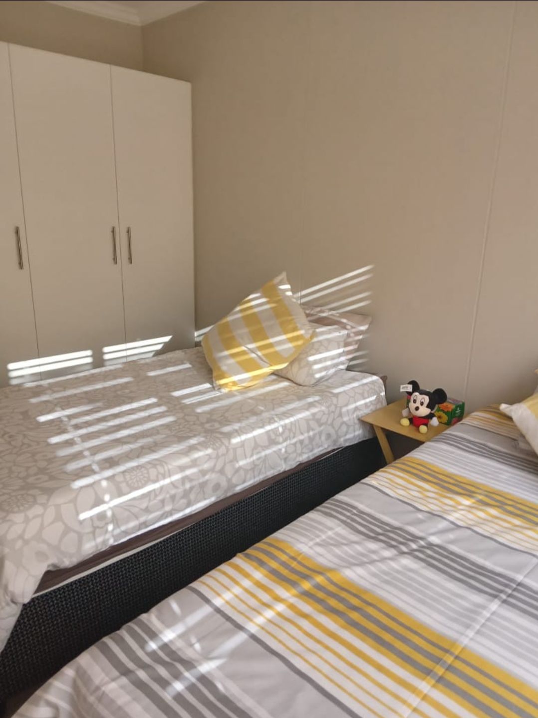 The apartment features an open-plan kitchen and living area, designed for easy flow and everyday comfort. Both bedrooms are well-sized with built-in cupboards, while the main bedroom includes an en-suite bathroom. The second bathroom is stylish and conveniently located for guests or family.