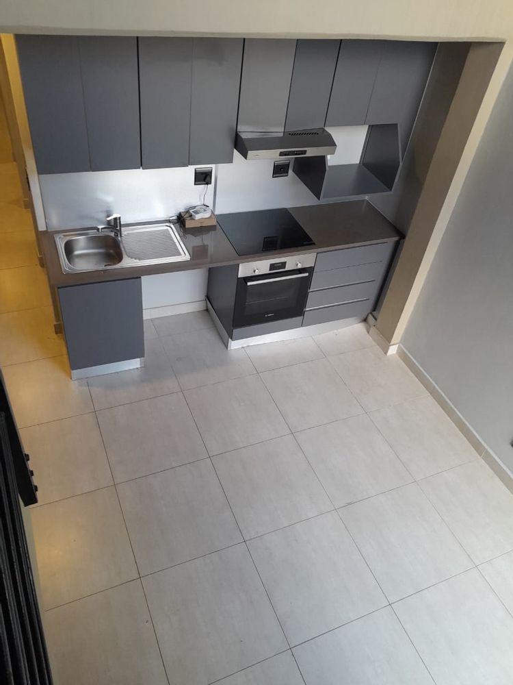 The kitchen is fitted with modern finishes and ample cupboard space, seamlessly flowing into the living area.