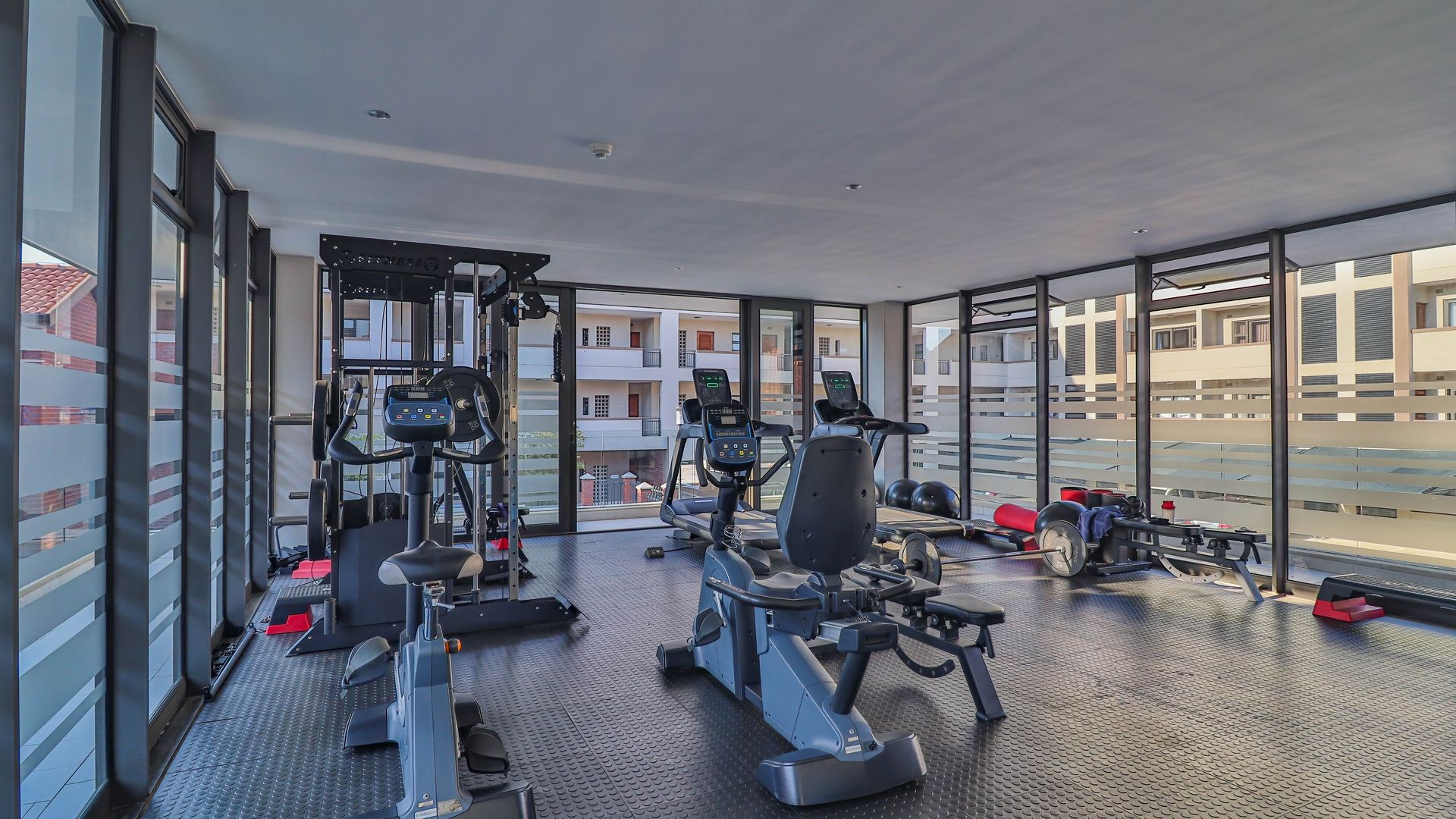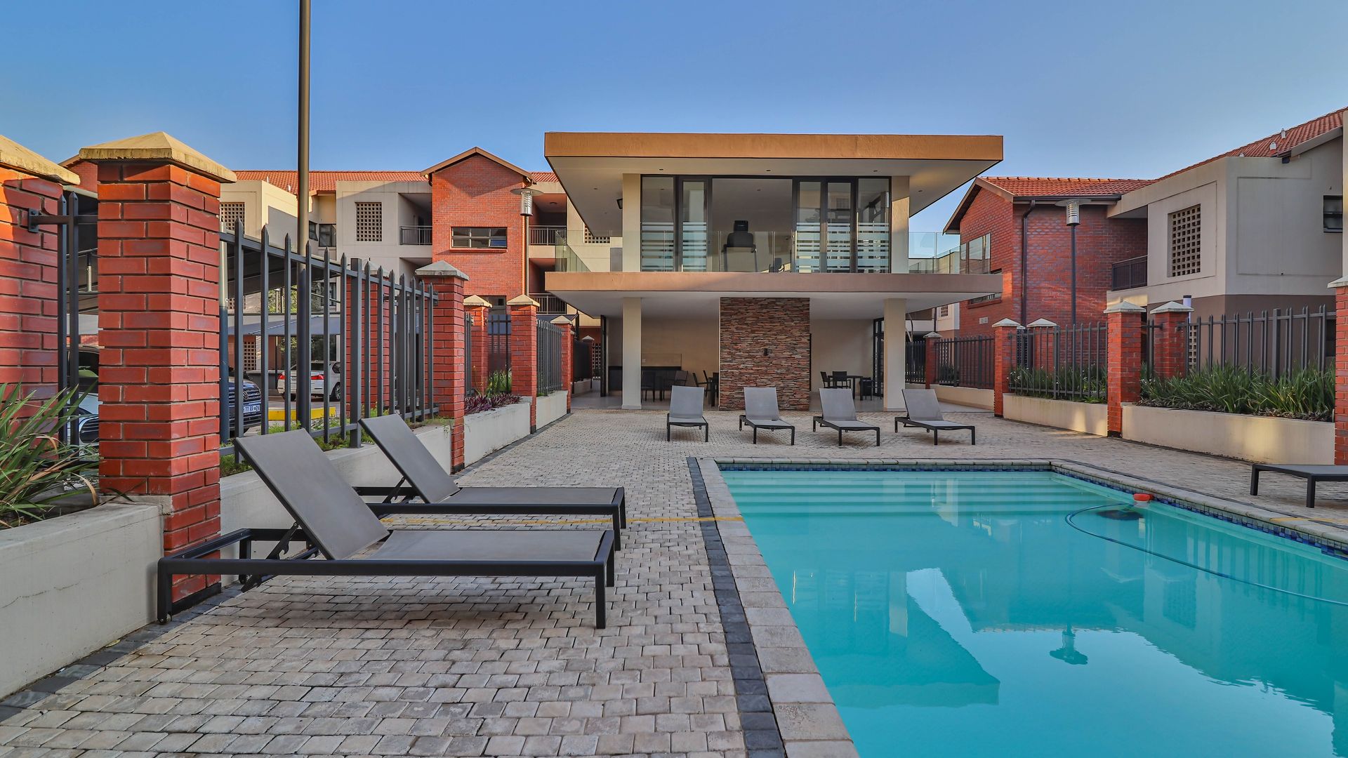 Pool and gym in the complex.