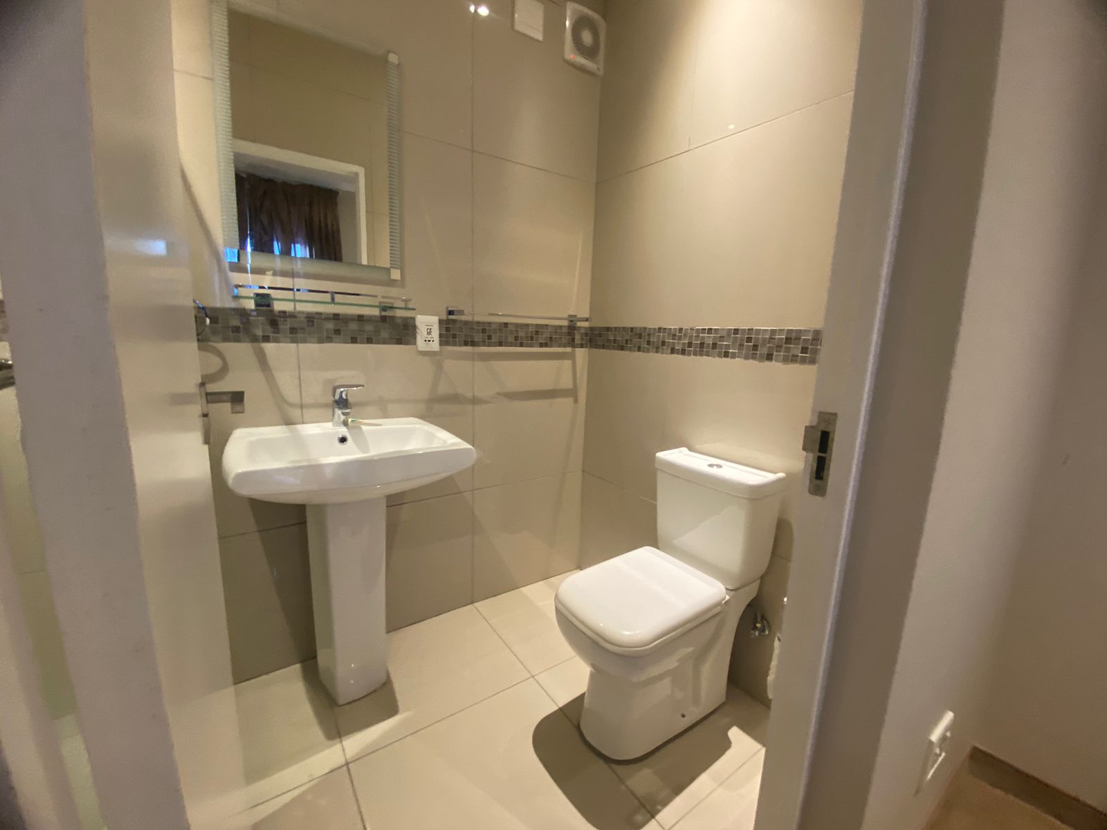 -Bathroom with basin, shower, toilet and tiled floors