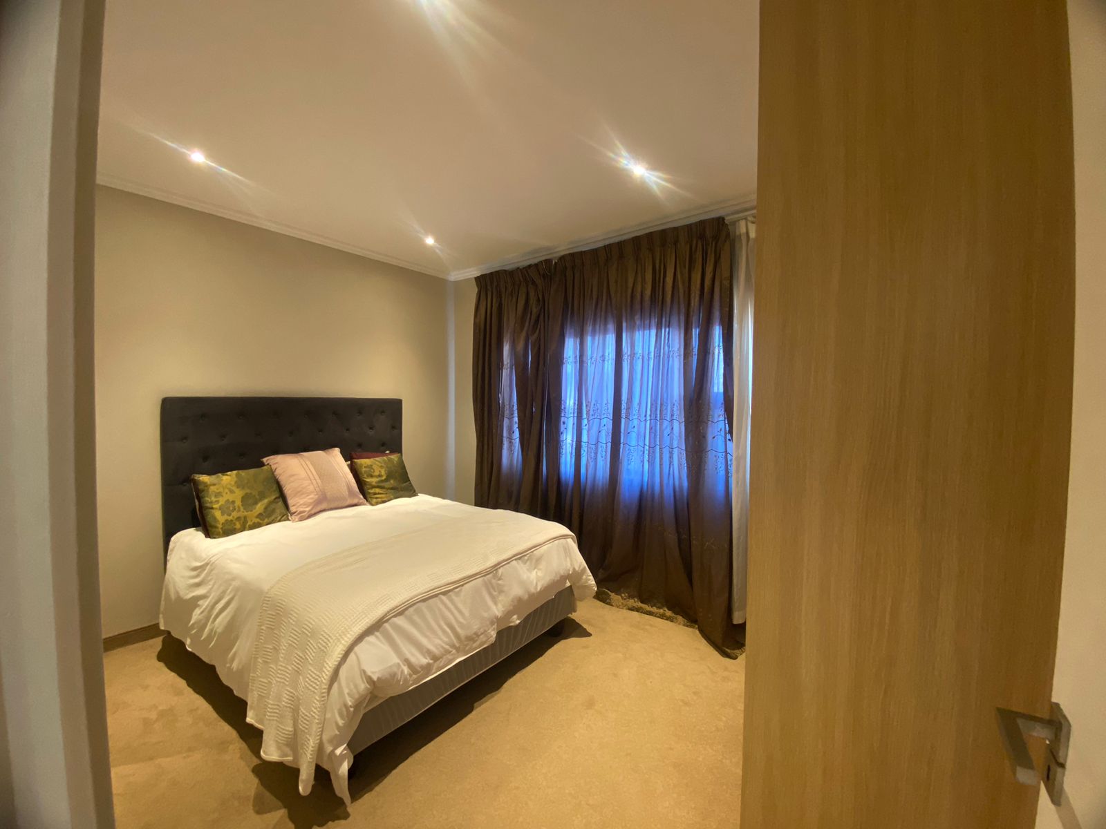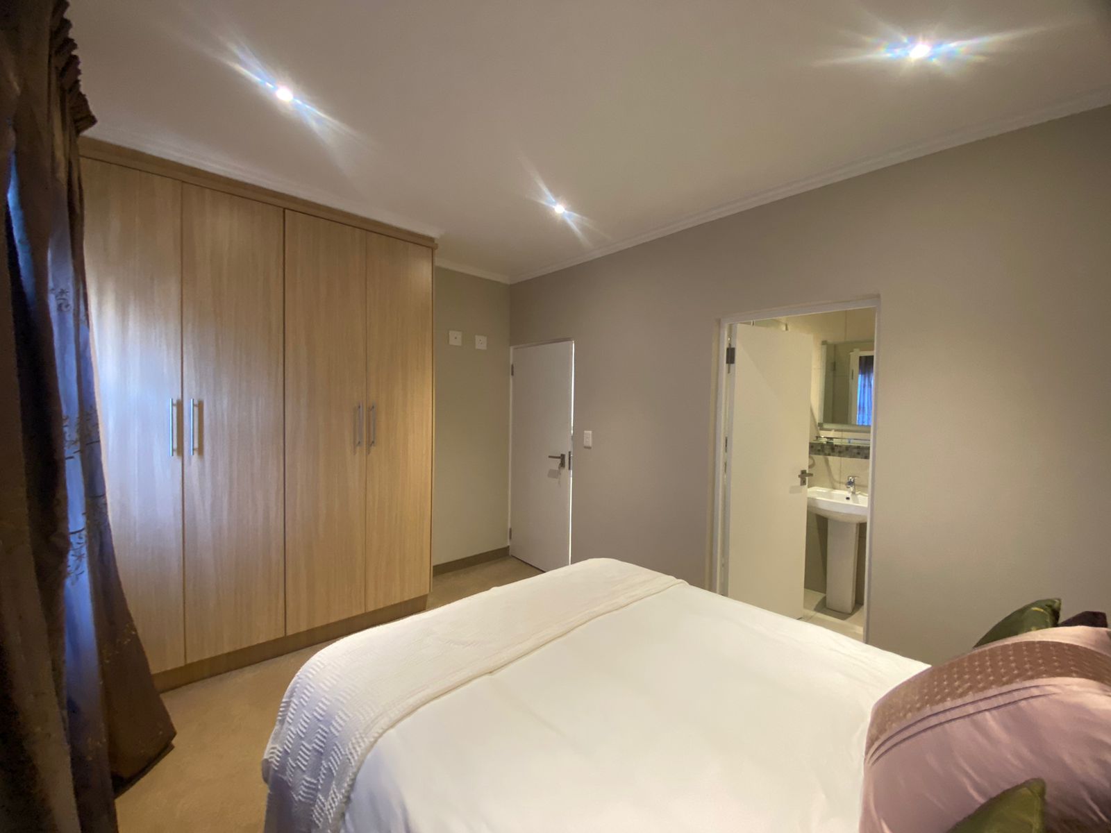 -Main bedroom with blinds, built-in cupboards and tiled floors