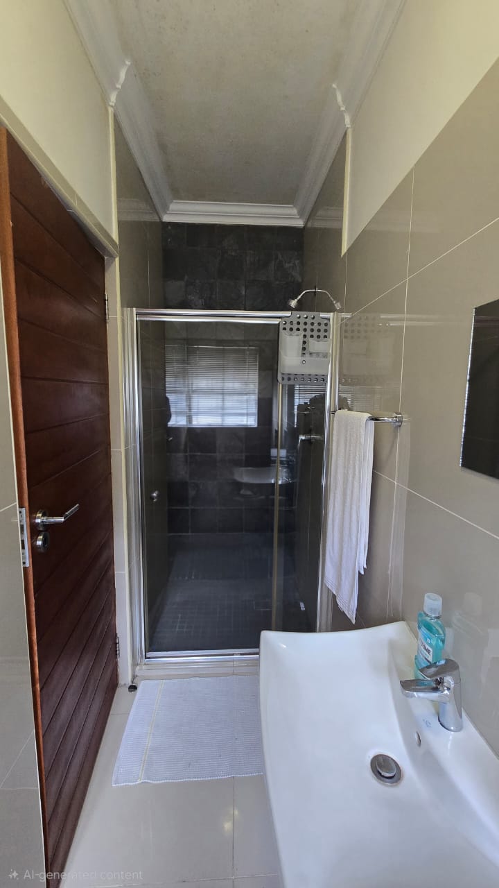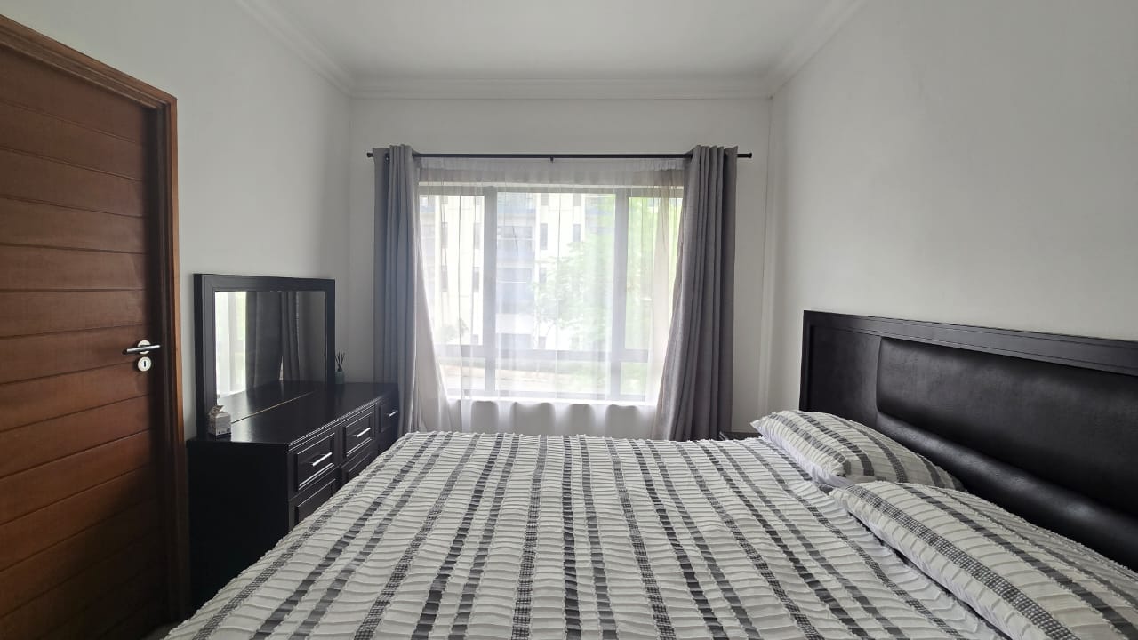 Both bedrooms are generously sized and come fully equipped with beds, side tables, and built-in cupboards. The main bedroom features an en-suite bathroom, while the second bathroom serves guests or the second bedroom with equal style.