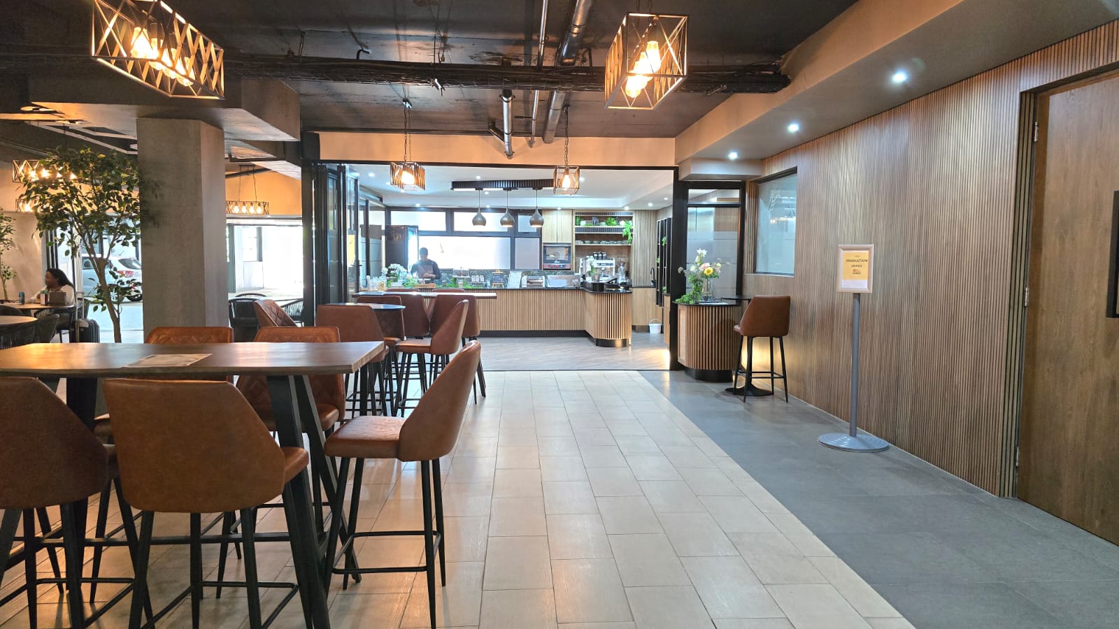 The lounge features a cozy seating area and TV, while the dining nook creates an inviting space for meals or work.