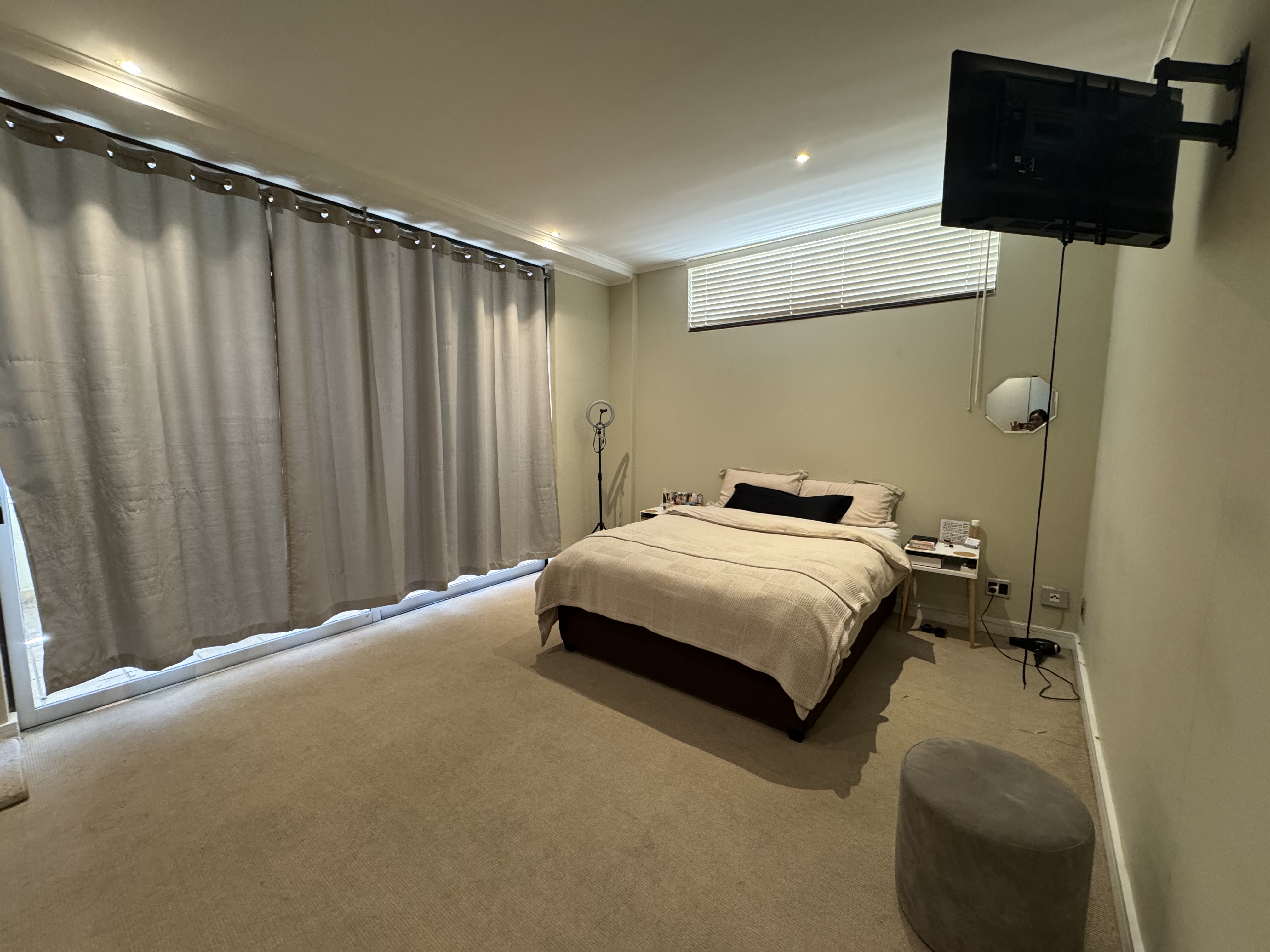 The bedroom is well-sized with built-in cupboards, while the bathroom is neat and modern with a bathtub and shower. Large sliding doors lead directly onto a private patio, allowing for plenty of natural light and fresh air to flow into the room.