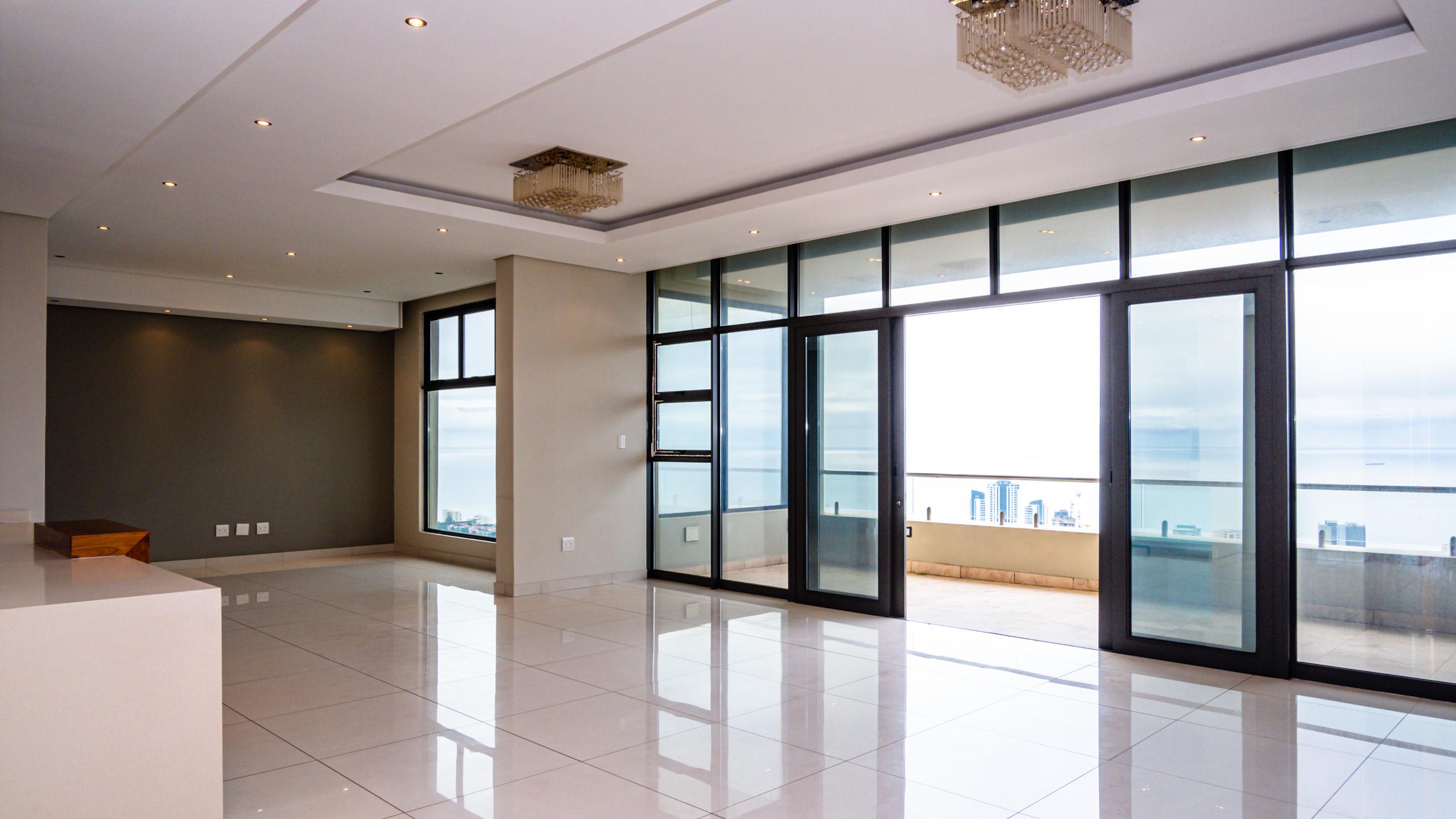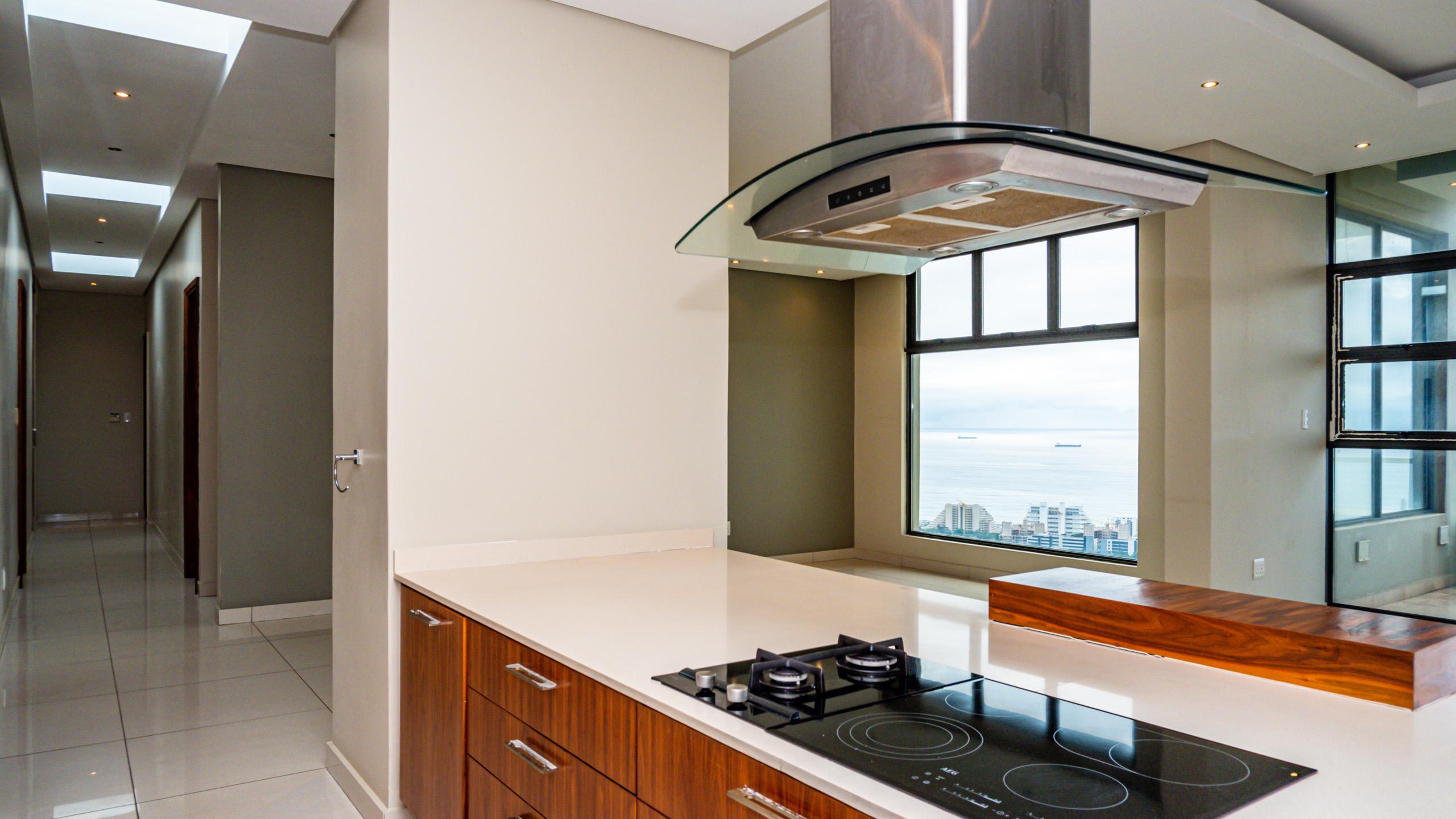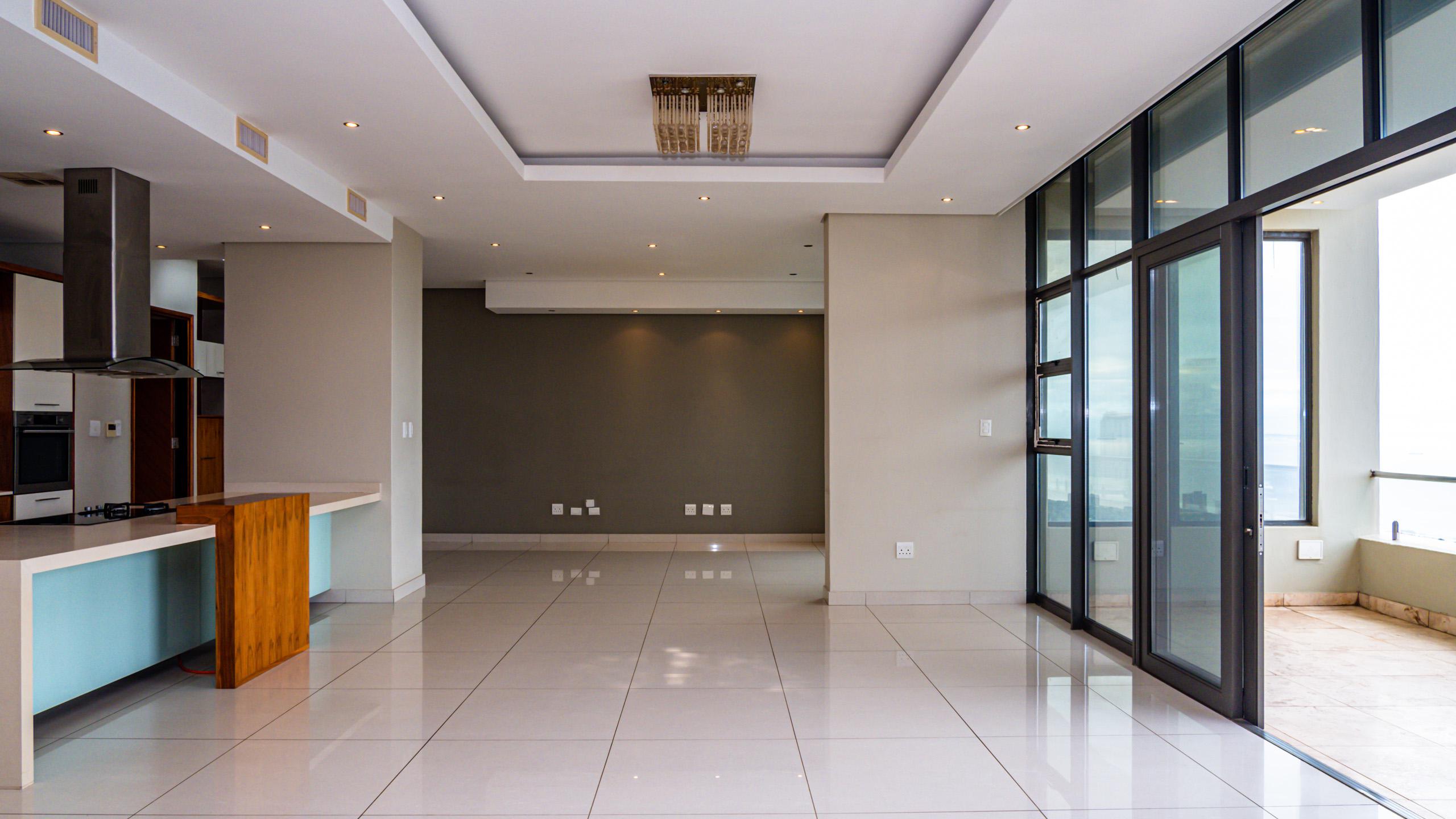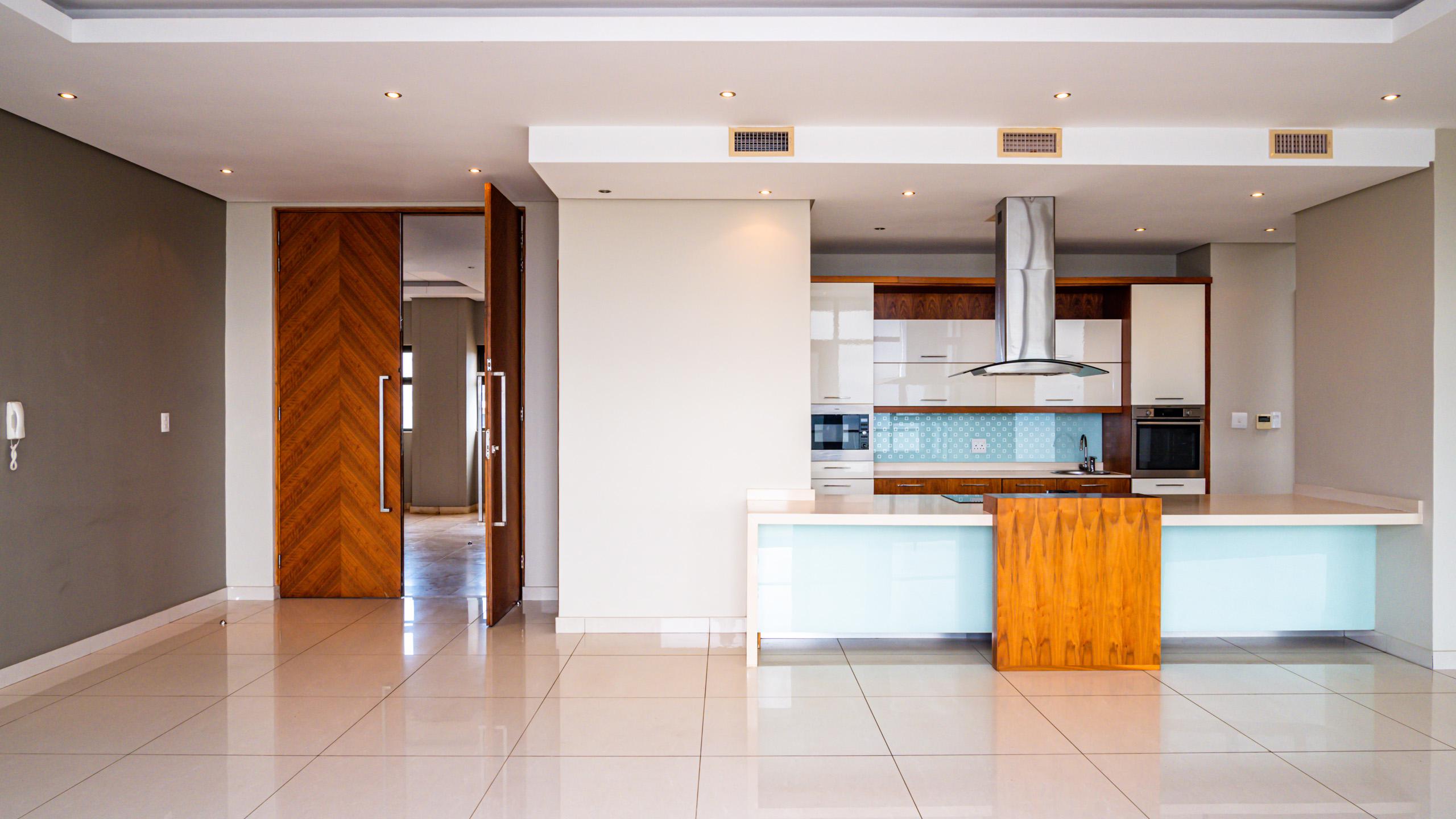 The open plan living area is light and airy and has sliding doors which open onto a covered balcony from which the extensive sea views can be admired. The ultra-modern kitchen is integrated with the living area and features built in cupboards, granite tops and a large breakfast bar. The home also contains a separate scullery and an office area. The apartment is situated within a secure development and two lock-up garages, two parking bays and maids quarters in the building, as well as the communal pool, are available for the use of the residents of the apartment. The development is nearby to all local amenities and is available to rent, unfurnished.