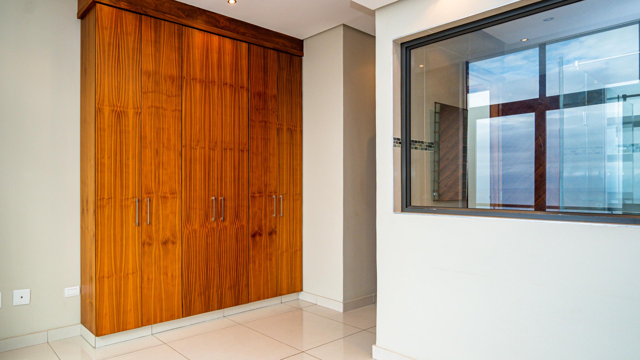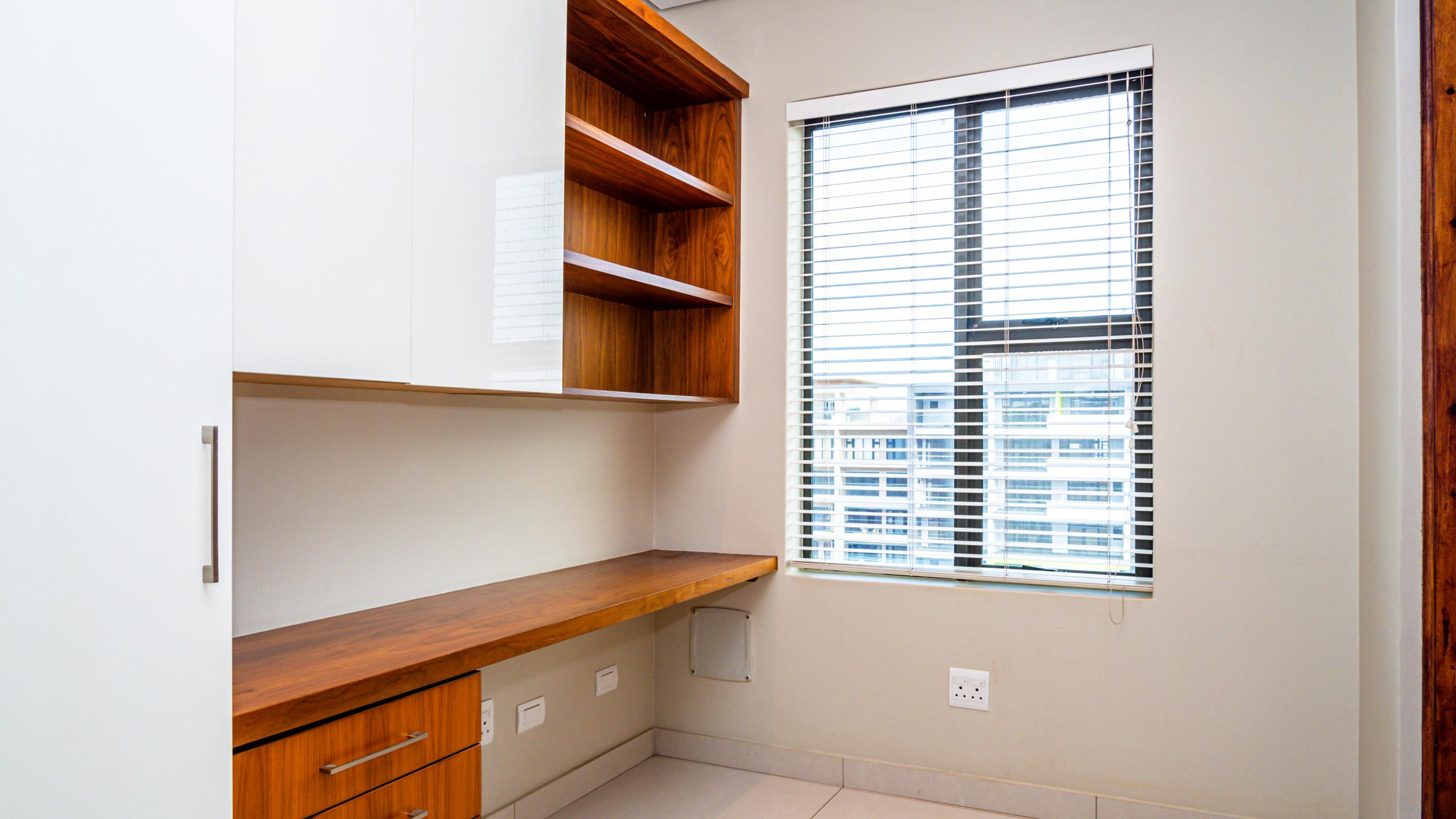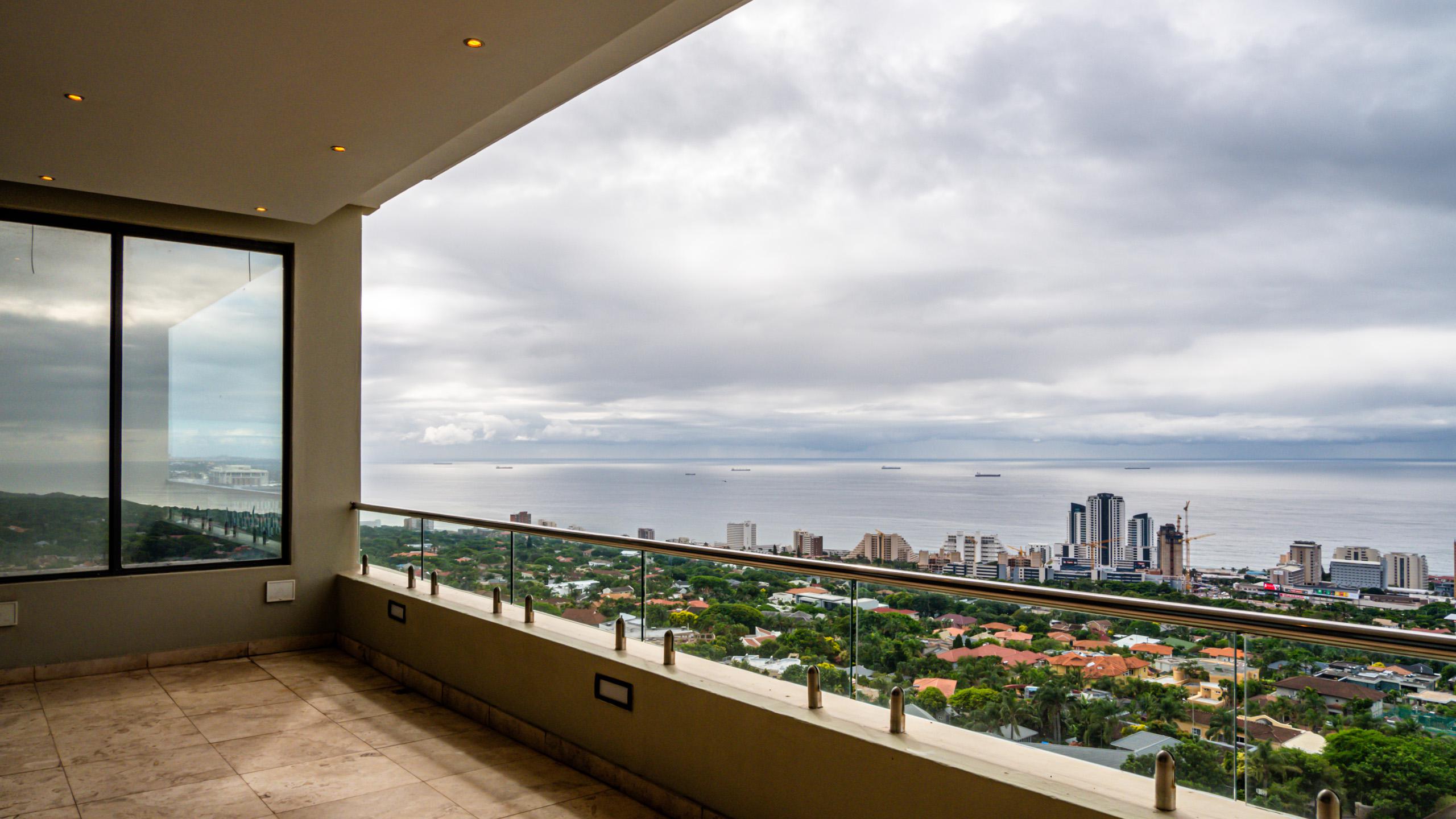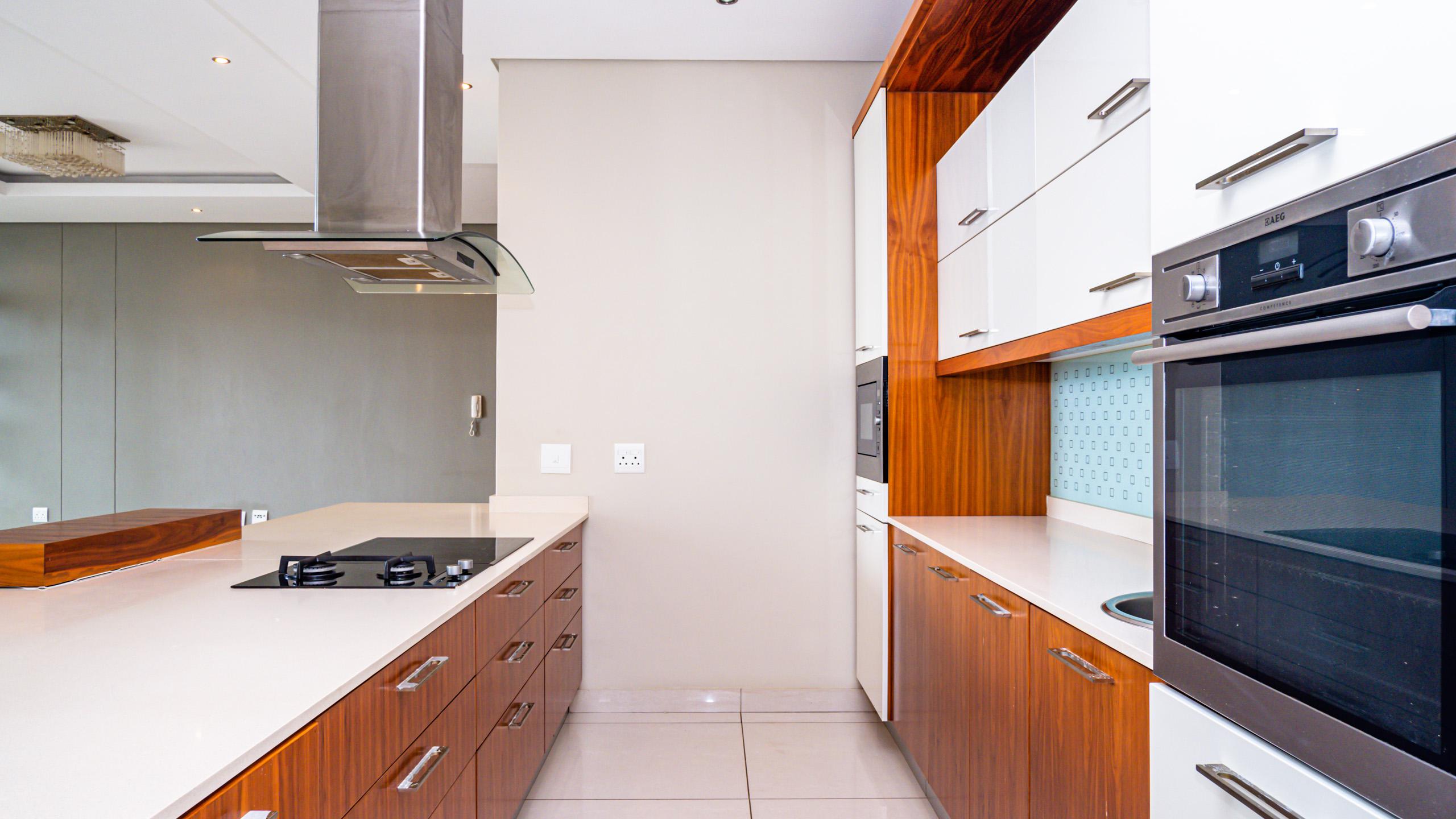 The open plan living area is light and airy and has sliding doors which open onto a covered balcony from which the extensive sea views can be admired. The ultra-modern kitchen is integrated with the living area and features built in cupboards, granite tops and a large breakfast bar. The home also contains a separate scullery and an office area. The apartment is situated within a secure development and two lock-up garages, two parking bays and maids quarters in the building, as well as the communal pool, are available for the use of the residents of the apartment. The development is nearby to all local amenities and is available to rent, unfurnished.