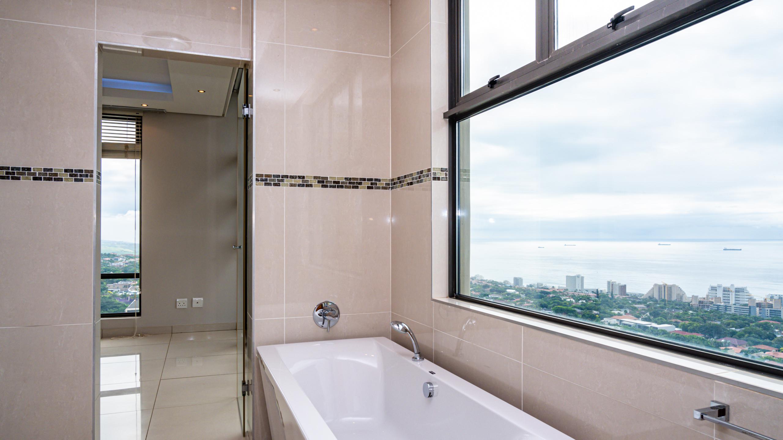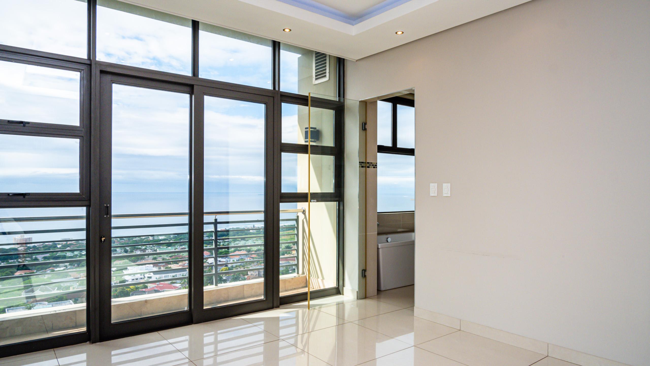 This stunning and spacious Penthouse apartment is situated in a secure development in the Umhlanga Ridge area. Tiled floors, ducted air-conditioning and modern light fittings are found throughout the home which comprises three bedrooms, three bathrooms, a guest WC, an open plan living room, study area, kitchen and scullery. The master and first bedroom open onto private balconies, with all three bedrooms benefiting built in cupboards and en-suite bathrooms, the master en-suite being full with both a bath and shower suite, while the second and third en-suite bathrooms contain shower units.
