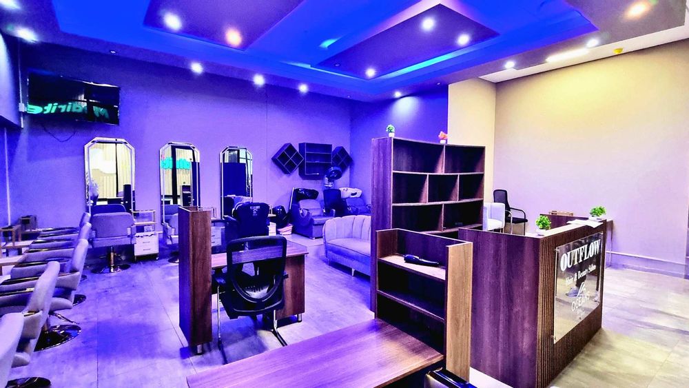 Currently configured with salon-style fittings including styling stations, ambient lighting, and a back-of-house waterpoint utility zone.