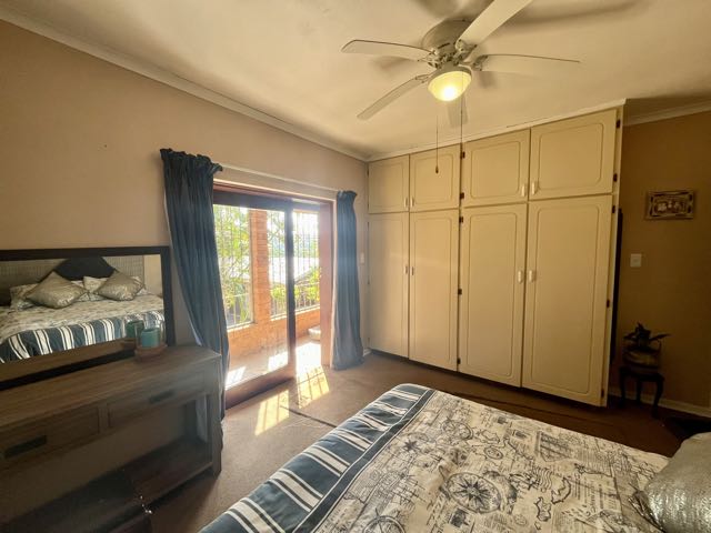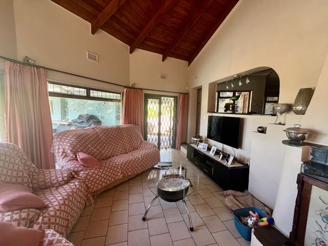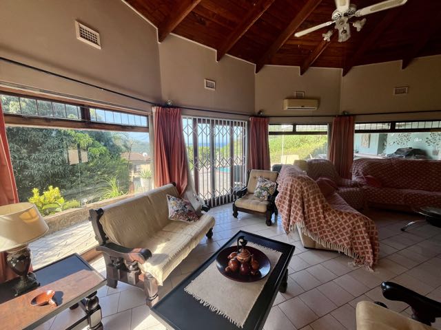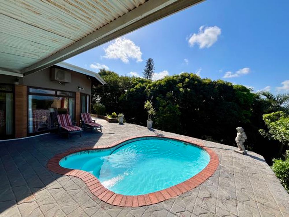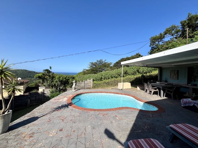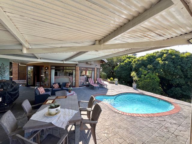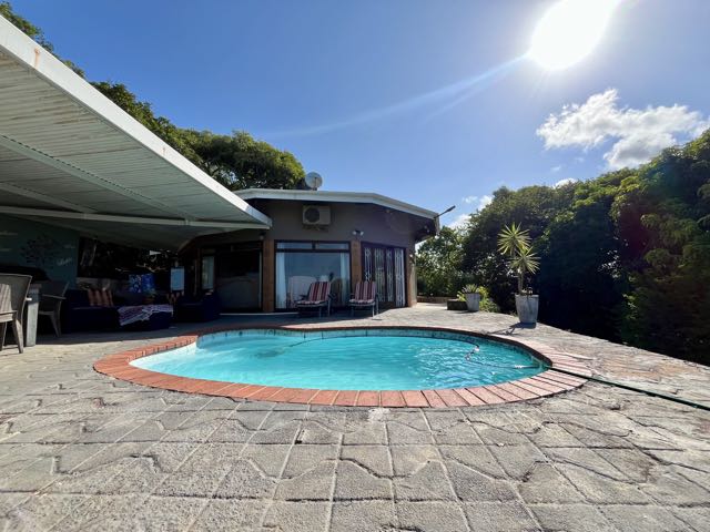 The house itself consists of 2 bathrooms and 3 bedrooms, which are well sized, have curtains, tiled, built in cupboards, fans and burglar bars. The kitchen is spacious and has a neat modern look to it. The lounge has beautiful wooden ceilings and leads out to the veranda where you can enjoy the pool while watching the stunning river and sea views.