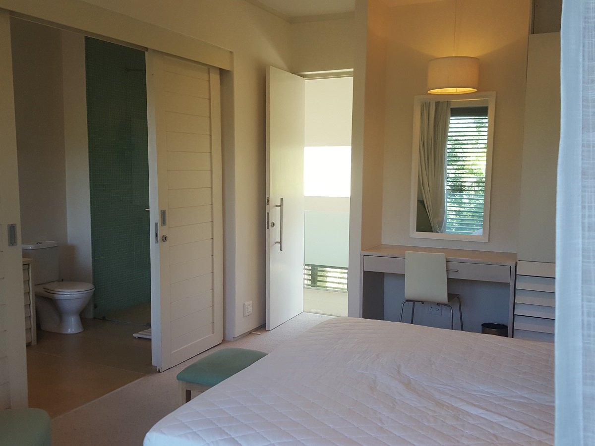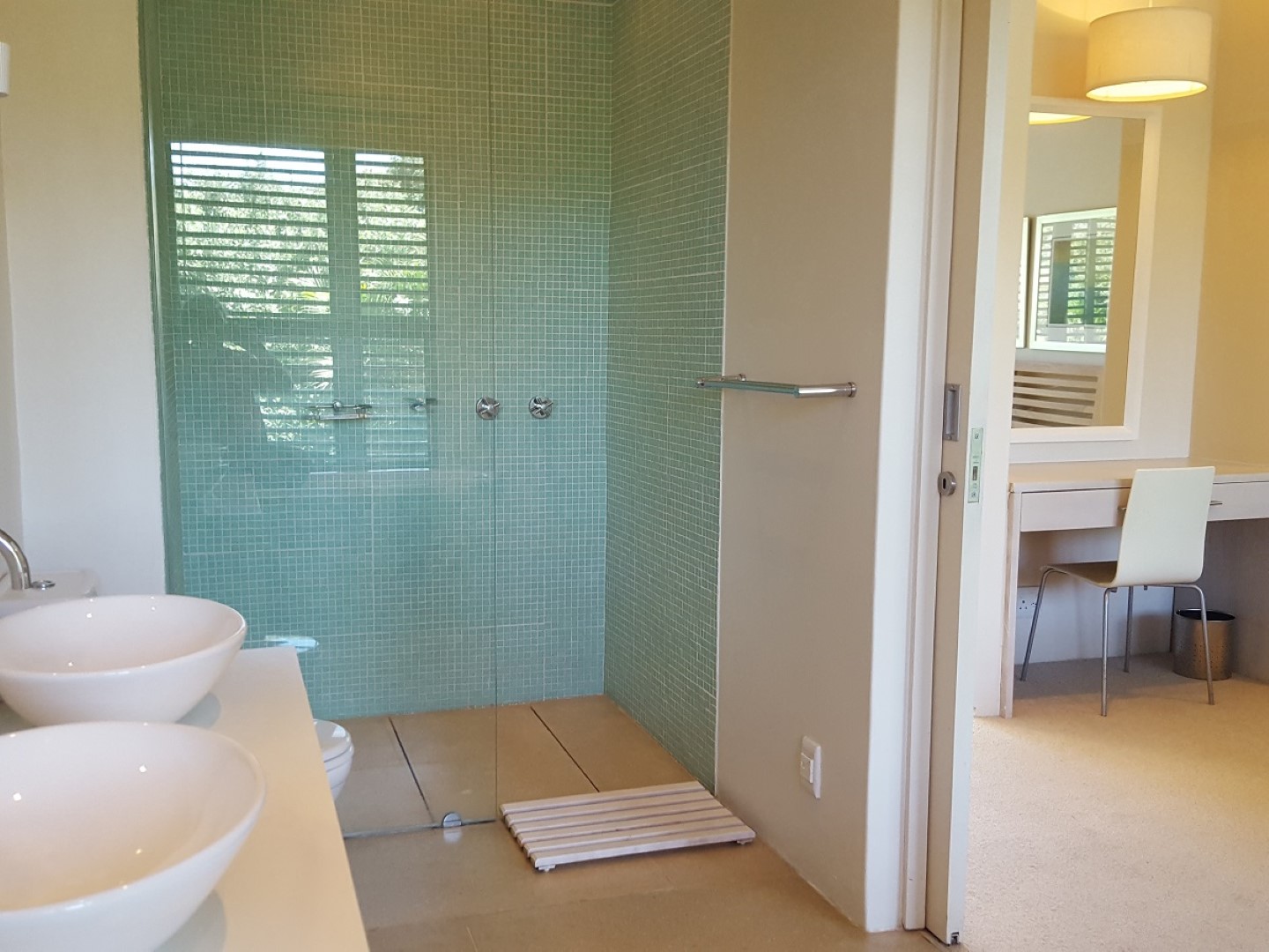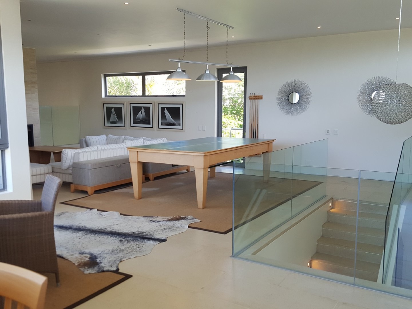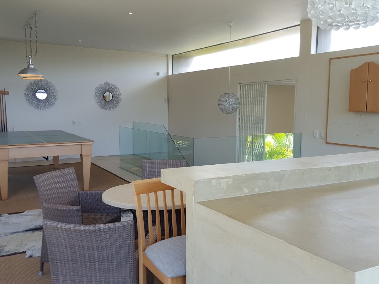 The upper level sports a bar with ocean and garden views, an entertainment area and a pyjama lounge with fireplace that looks onto the downstairs family room. A passage off these living areas leads to the 2 other air-conditioned bedrooms both with full en-suite; main bedroom has a large walk in dressing area with built in cupboards, plus an adjoining room that could be used as a baby room/study or private lounge, en-suite is open plan and the room opens to balcony and views!