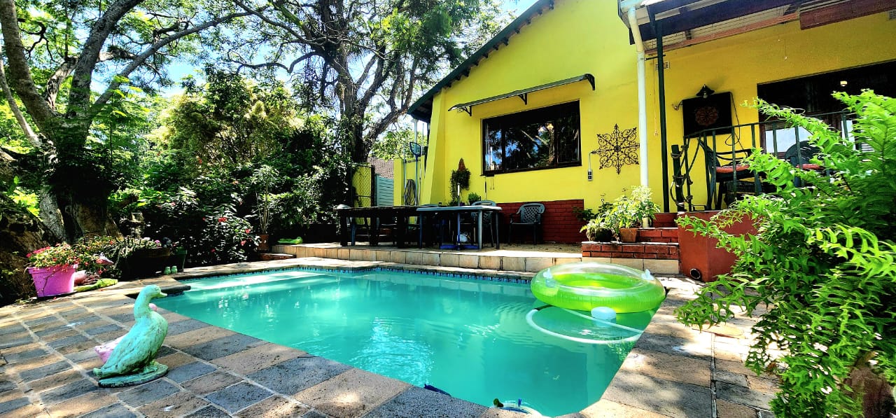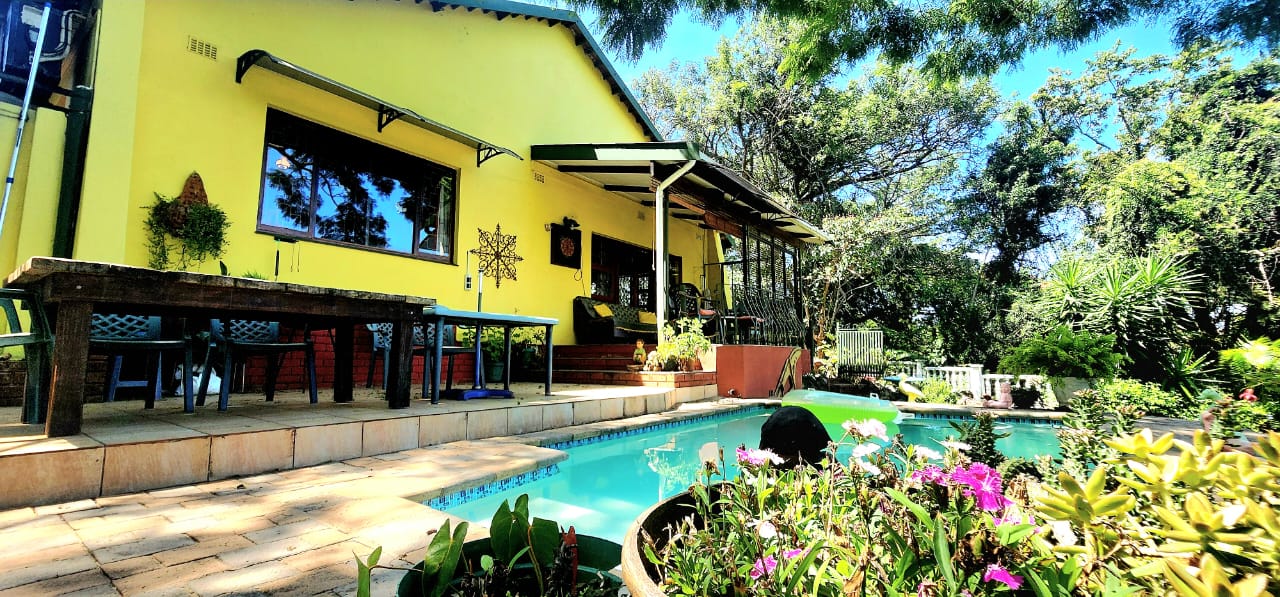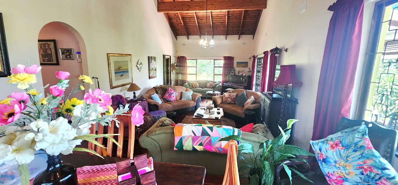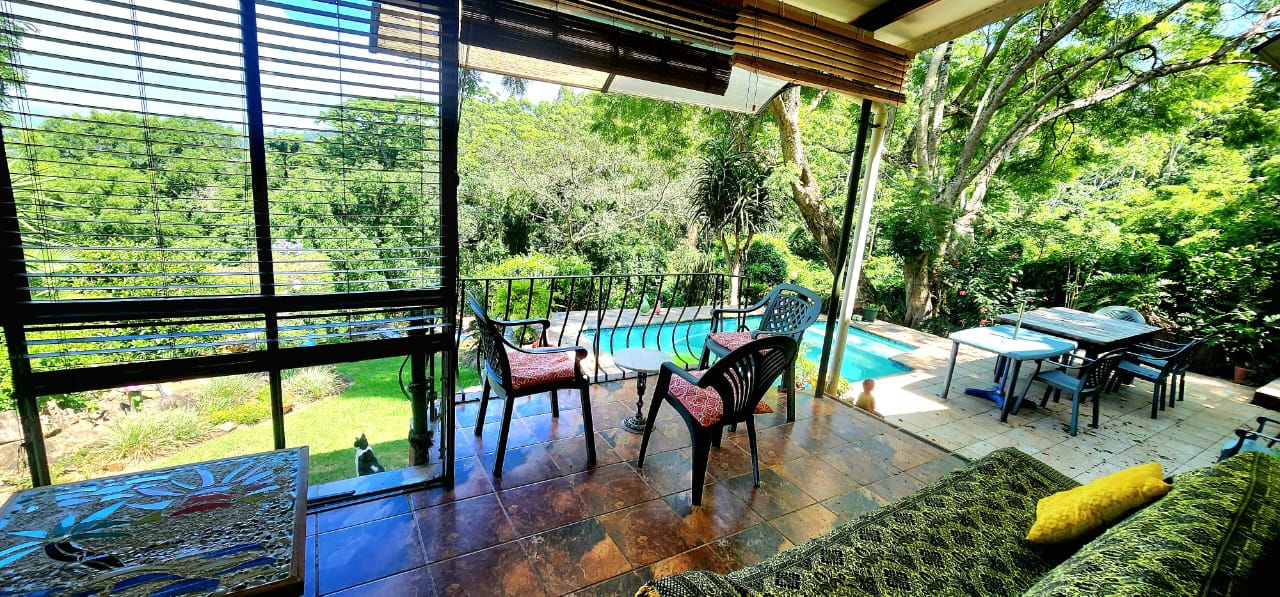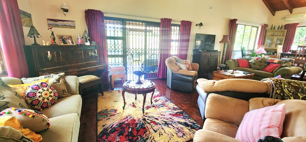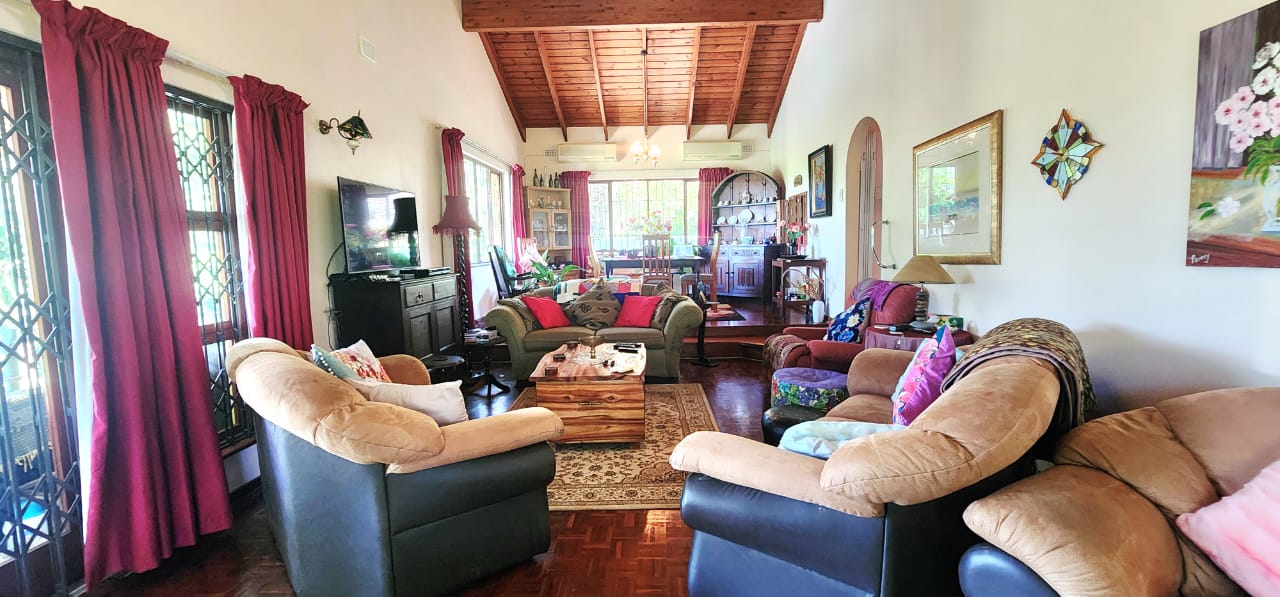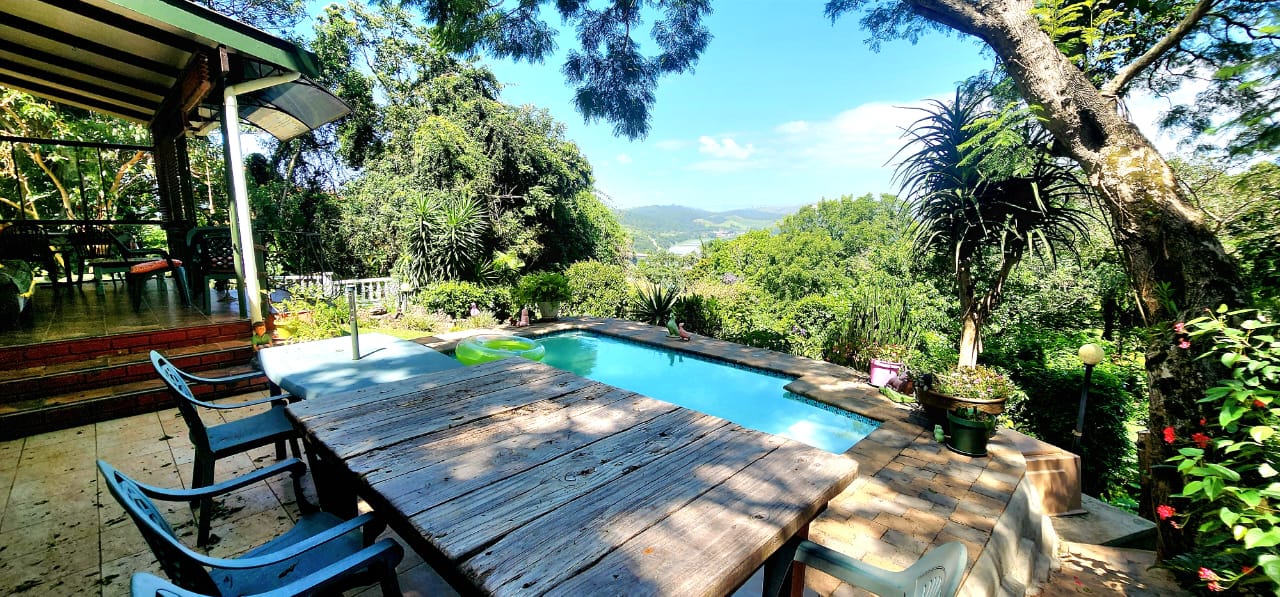 Situated in the upmarket village of Umtentweni, a short drive to Port Shepstone and the fabulous main beach. The home offers a large split level open plan lounge (sliding doors to the pool side covered patio, with amazing views of the valley and the mighty Umzimkulu river) and dining area, with stunning parquet flooring and vaulted ceilings, making it nice and cool in the summer months. The kitchen is separate, with a serving hatch to the dining area, it is farm style and has plenty of cupboard space and an abundance of natural light. There are 3 well sized bedrooms (one is used as a hobby room) two of them have doors to the front covered patio. The main is large and the room is filled with natural light through the 2 corner windows, there are plenty of cupboards and a full ensuite bathroom. The family bathroom consists of a bath, basin and toilet. Off the poolside patio is an open patio, overlooking the pool deck and 'the view', perfect for entertaining and admiring the abundant birdlife that frequent the tropical garden and large indigenous trees. There is a single garage plus 3 carports, all nice and secure with burglar bars and automated gate. water tanks take care of the dry days and there is a 3kw inverter taking care of power outages. An alarm system and beams , burglar guards and security gates takes care of the insecurities. This is an amazing, older home, solid as a rock, well maintained and oozing with serenity. Please contact us ANYTIME to chat further! Matriarch Real Estate powered by Mandated Property Group (Pty)Ltd