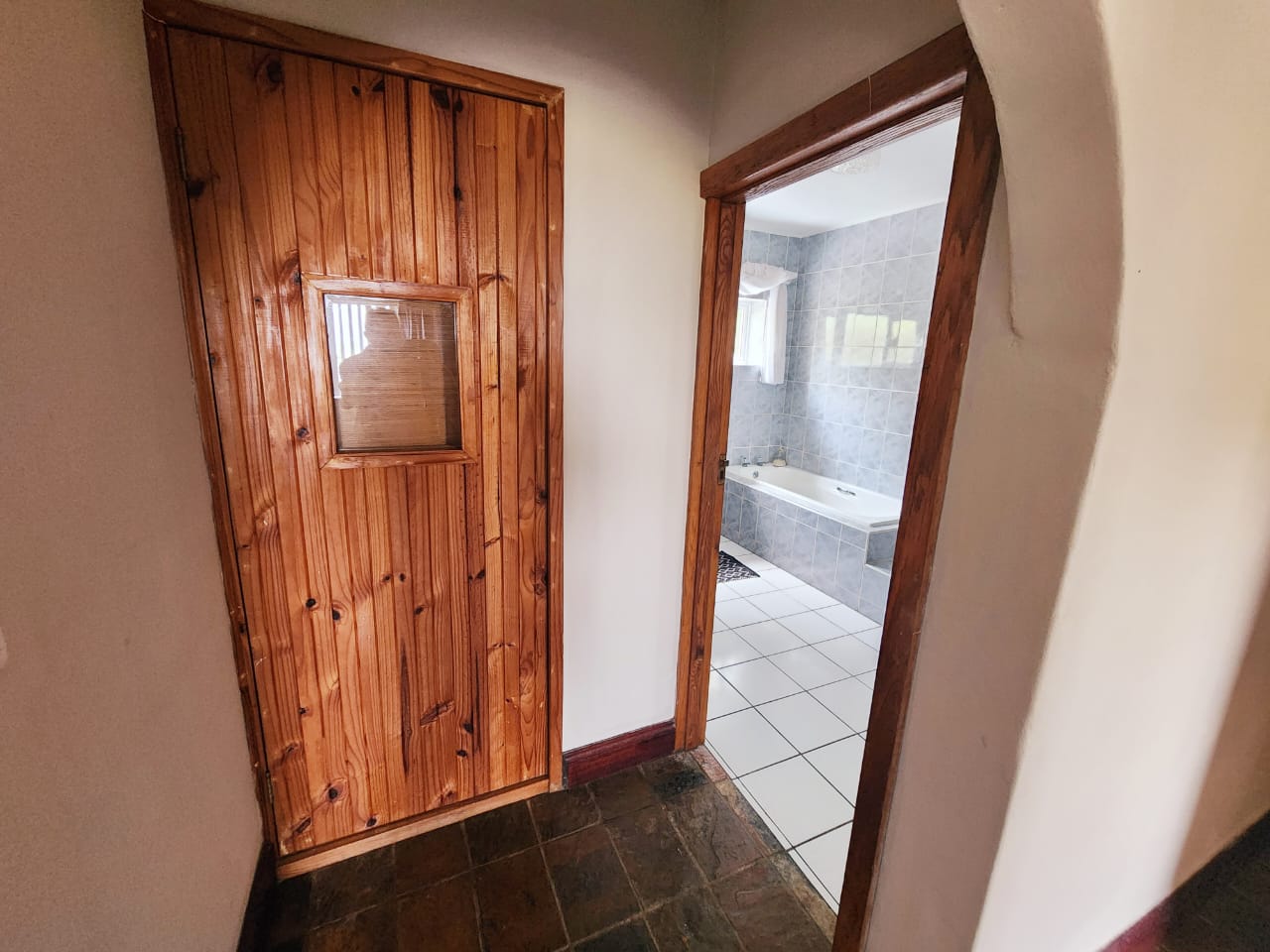A solid carved wooden door welcomes you to this majestic home, into the entrance hall, followed by the open living area consisting of the lounge with sliders to the covered patio and pool deck with an extra-large pool, dining area (vaulted ceilings with upstairs walkway) a large fully fitted pub with additional space for a pool table, it has a wine cellar as well. The kitchen has solid wood cabinetry, a breakfast bar and separate scullery/laundry. On this lower level is a large bedroom on the one wing with a bathroom, on the other wing is a large bedroom, lounge area (could also be changed to a bedroom) with space for a kitchenette, plus there is a bathroom and sauna, this wing could be changed into a separate suite.