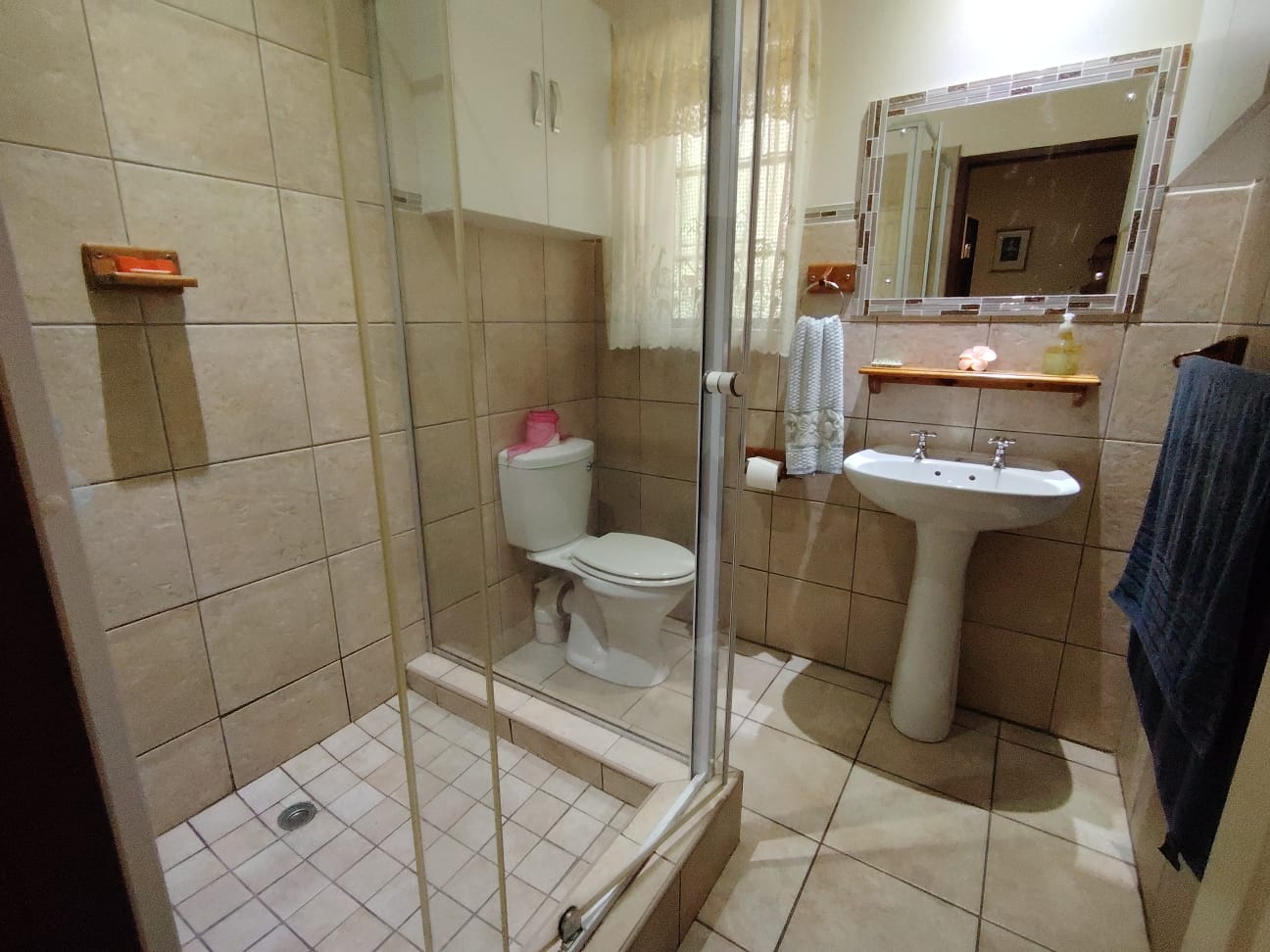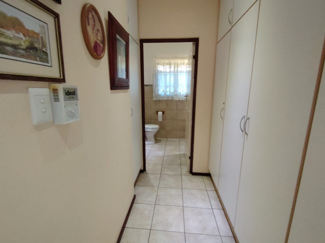 The layout of the home has been thoughtfully designed. To the right of the living area are two comfortably sized guest bedrooms that share a neat bathroom fitted with a shower, toilet and basin. On the opposite side of the home, the main suite enjoys added privacy and generous proportions, complete with ample cupboard and storage space and a full en-suite bathroom with bath, toilet and basin.