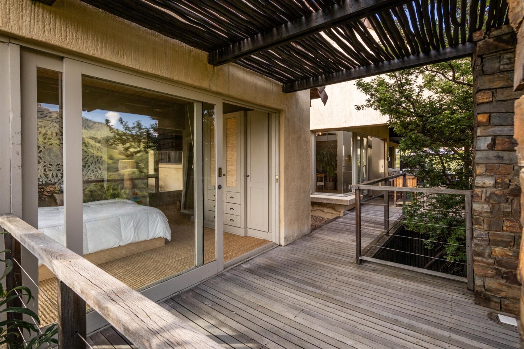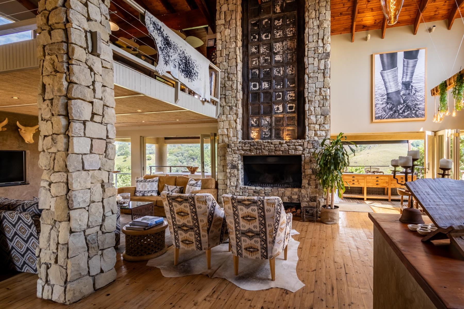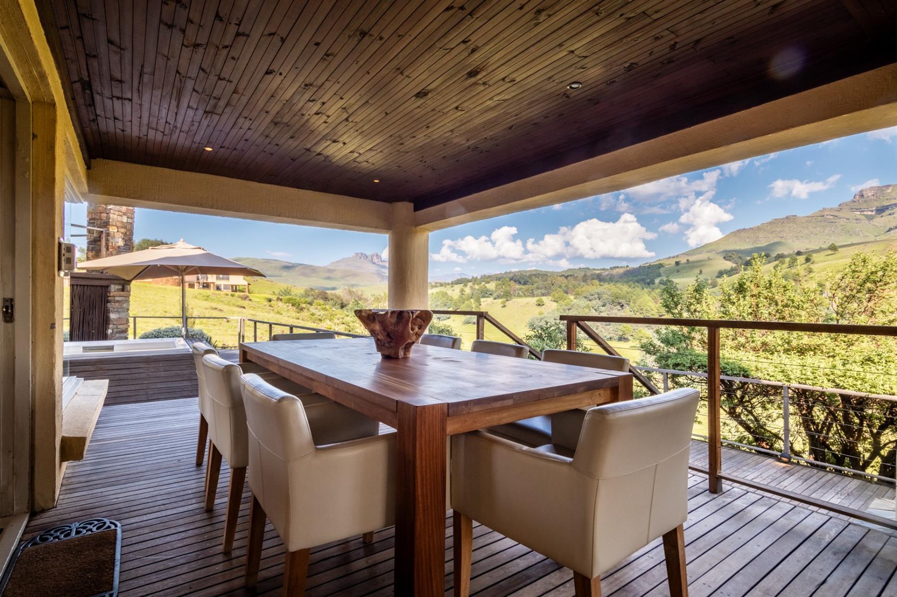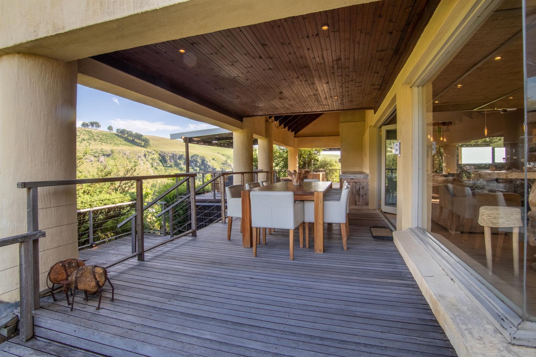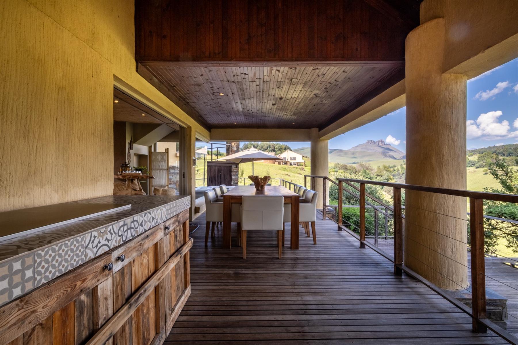Large entertainment decks overlook wide river and mountain views that stretch from sunrise to sunset over the Drakensberg. Alfresco dining features include a long dining table, built-in gas and lava barbeque counter, a jacuzzi deck, plus a fire pit deck, creating natural gathering spaces after a day outdoors. Wines can be chosen from the naturally seasoned wined cellar.