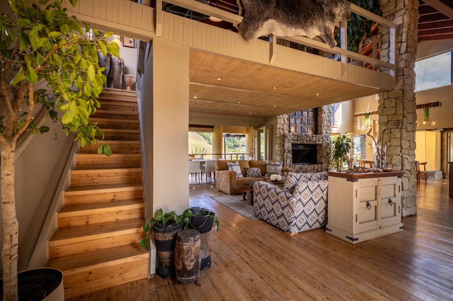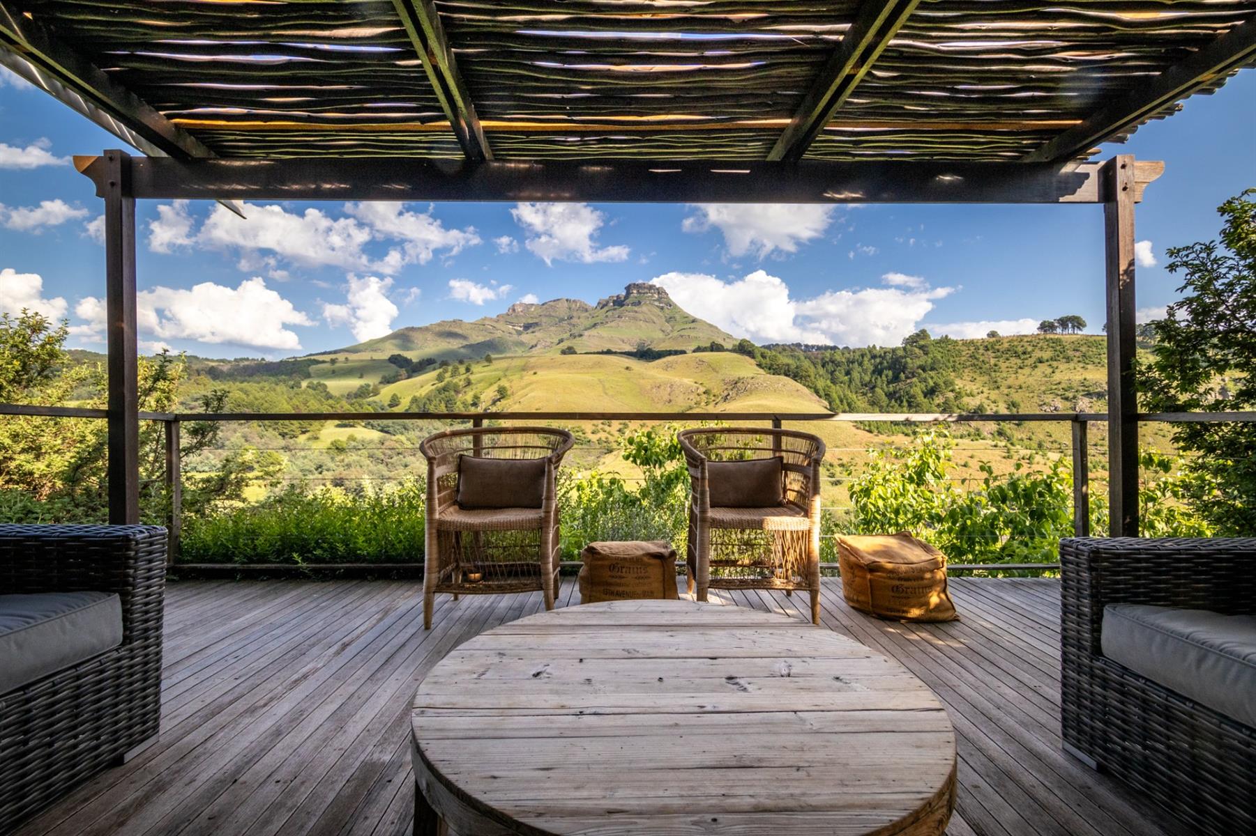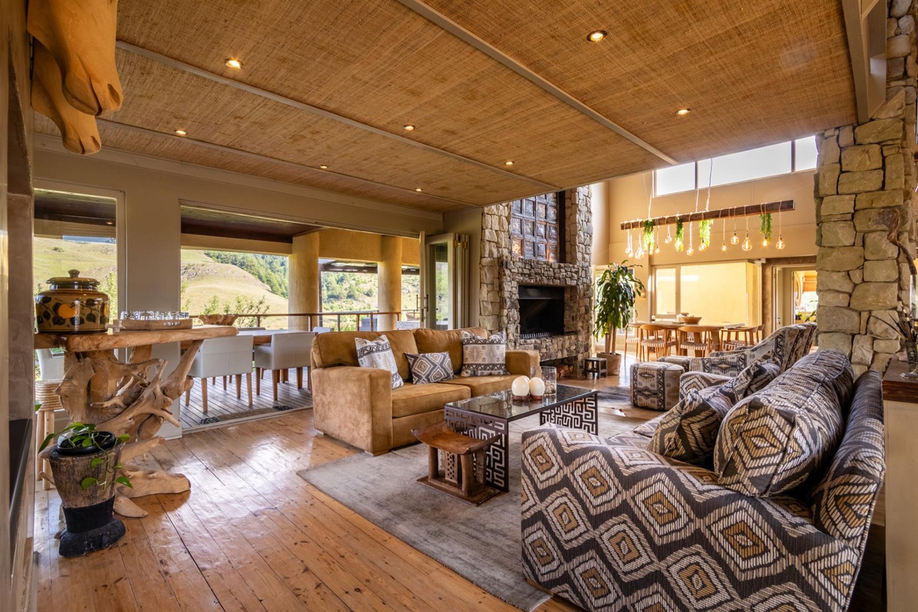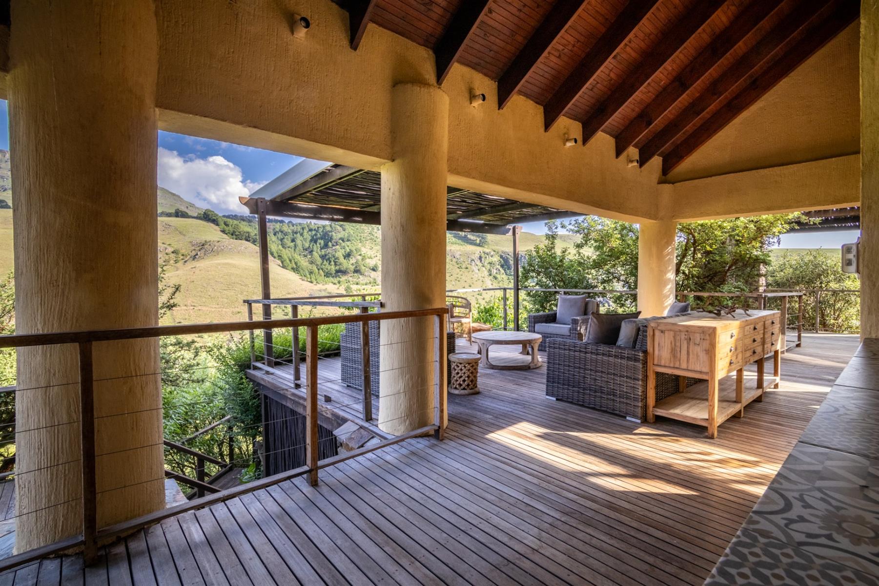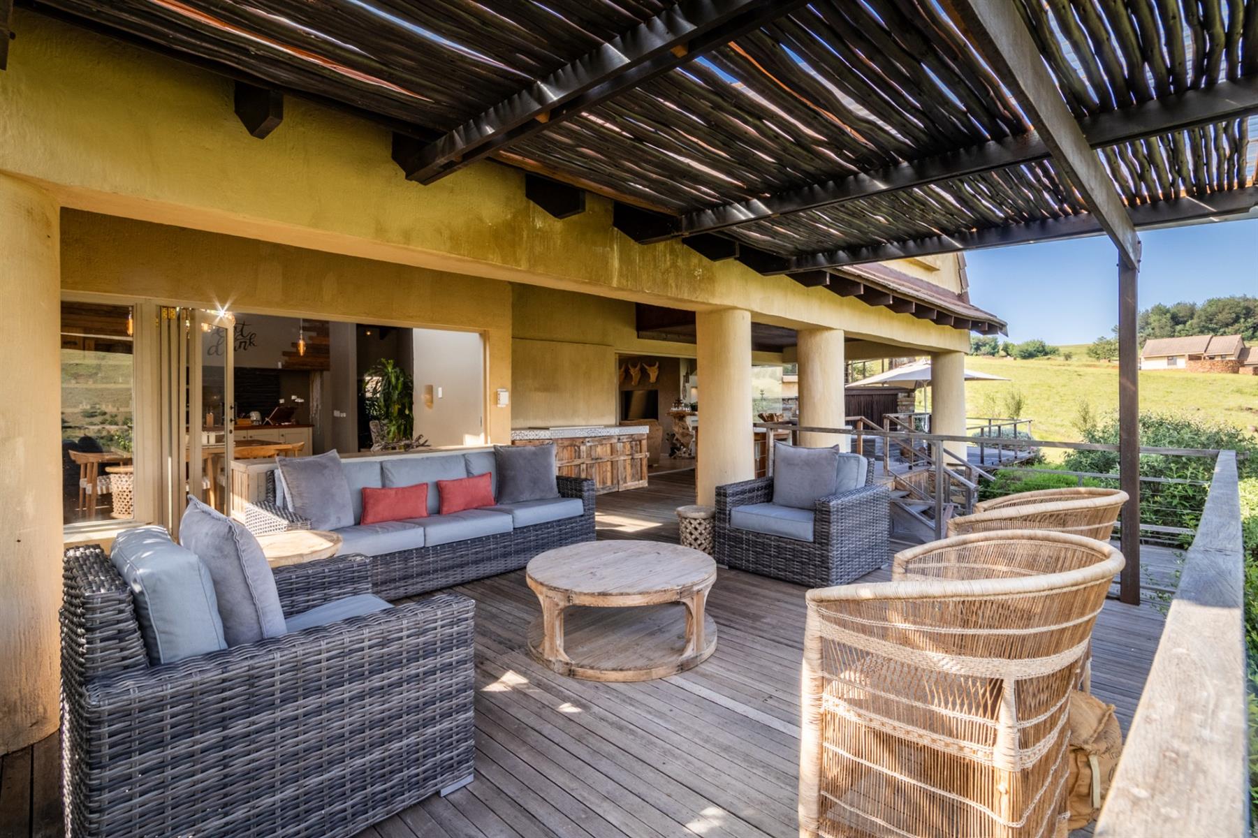 Large entertainment decks overlook wide river and mountain views that stretch from sunrise to sunset over the Drakensberg. Alfresco dining features include a long dining table, built-in gas and lava barbeque counter, a jacuzzi deck, plus a fire pit deck, creating natural gathering spaces after a day outdoors. Wines can be chosen from the naturally seasoned wined cellar.
