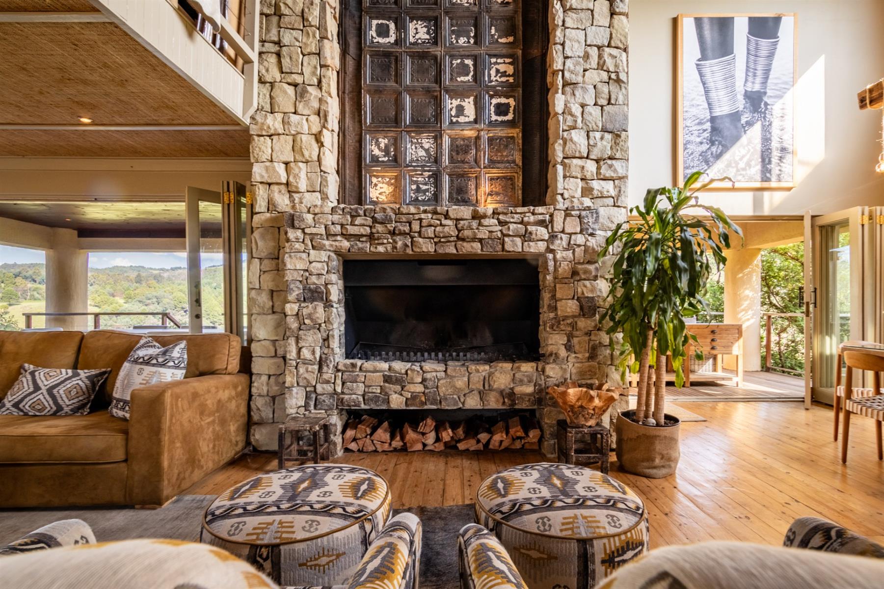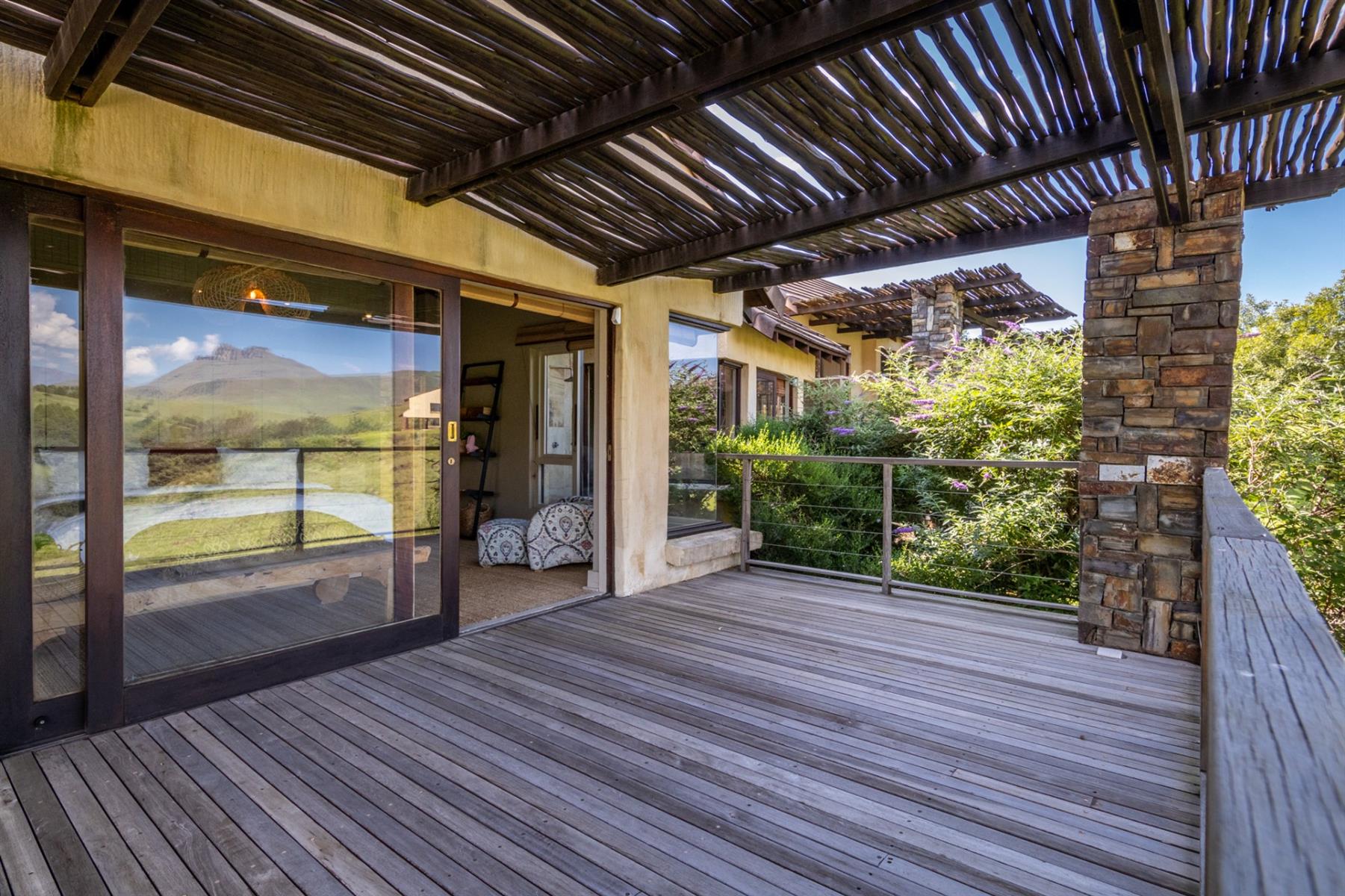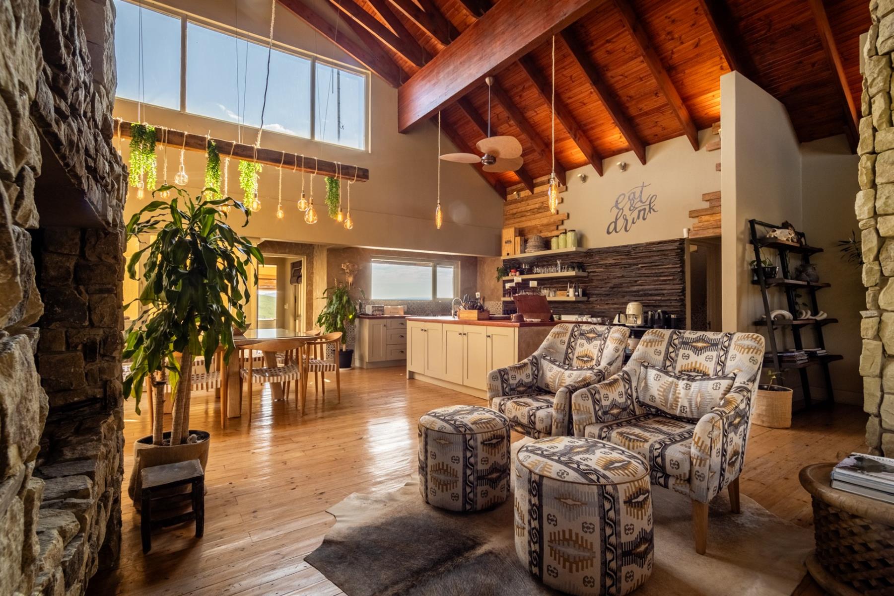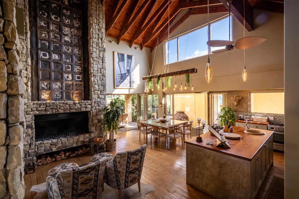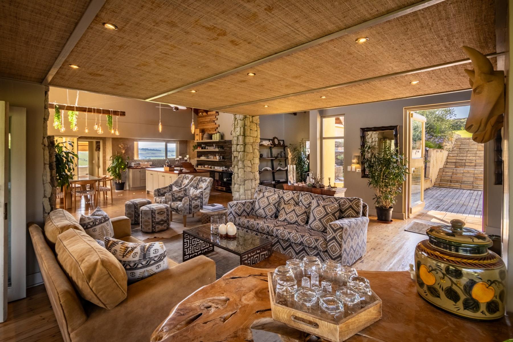 Large entertainment decks overlook wide river and mountain views that stretch from sunrise to sunset over the Drakensberg. Alfresco dining features include a long dining table, built-in gas and lava barbeque counter, a jacuzzi deck, plus a fire pit deck, creating natural gathering spaces after a day outdoors. Wines can be chosen from the naturally seasoned wined cellar.