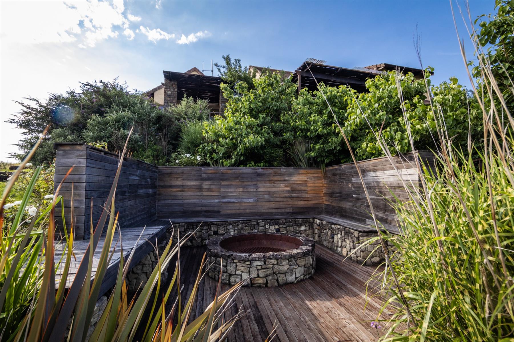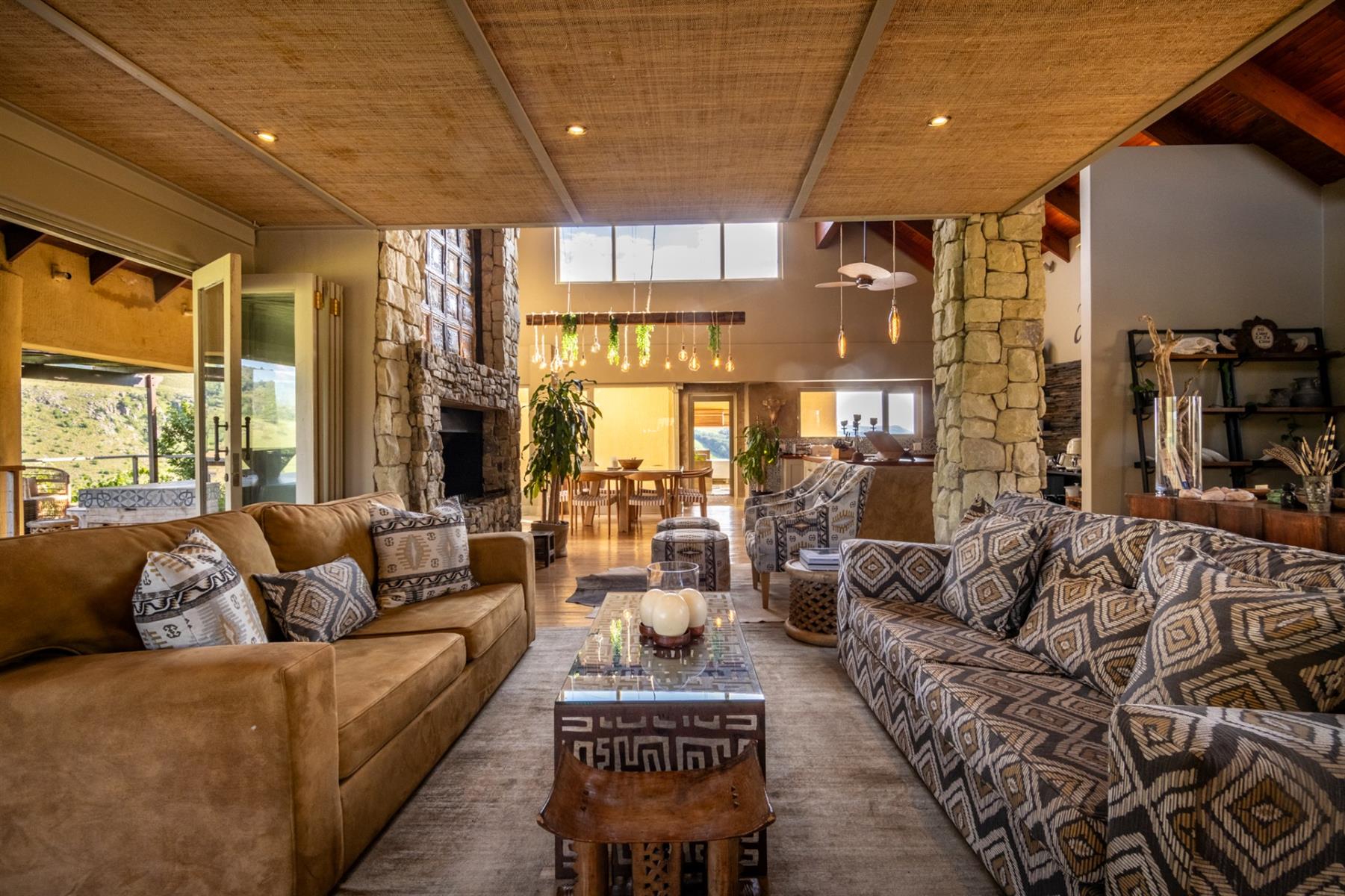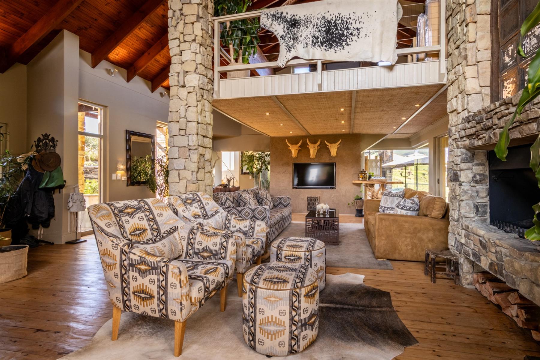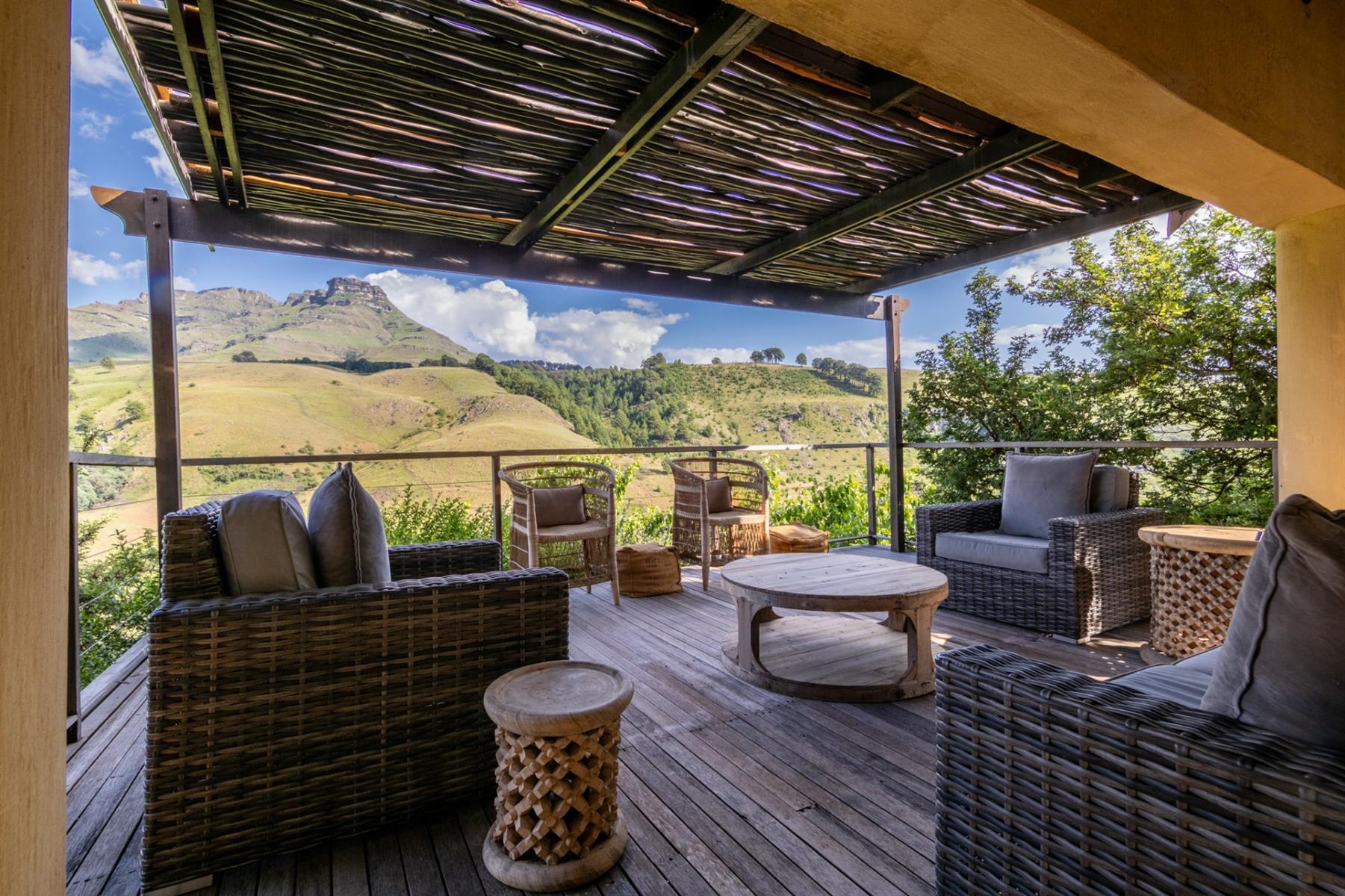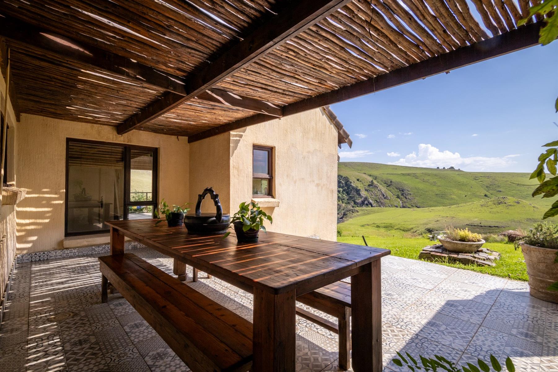 Large entertainment decks overlook wide river and mountain views that stretch from sunrise to sunset over the Drakensberg. Alfresco dining features include a long dining table, built-in gas and lava barbeque counter, a jacuzzi deck, plus a fire pit deck, creating natural gathering spaces after a day outdoors. Wines can be chosen from the naturally seasoned wined cellar.