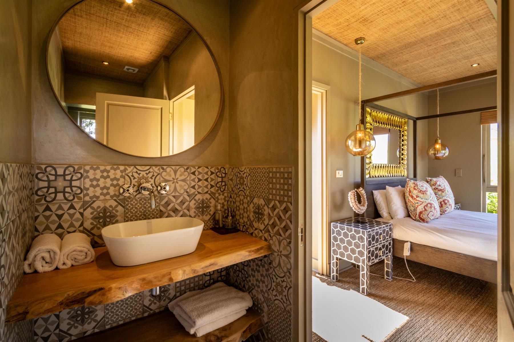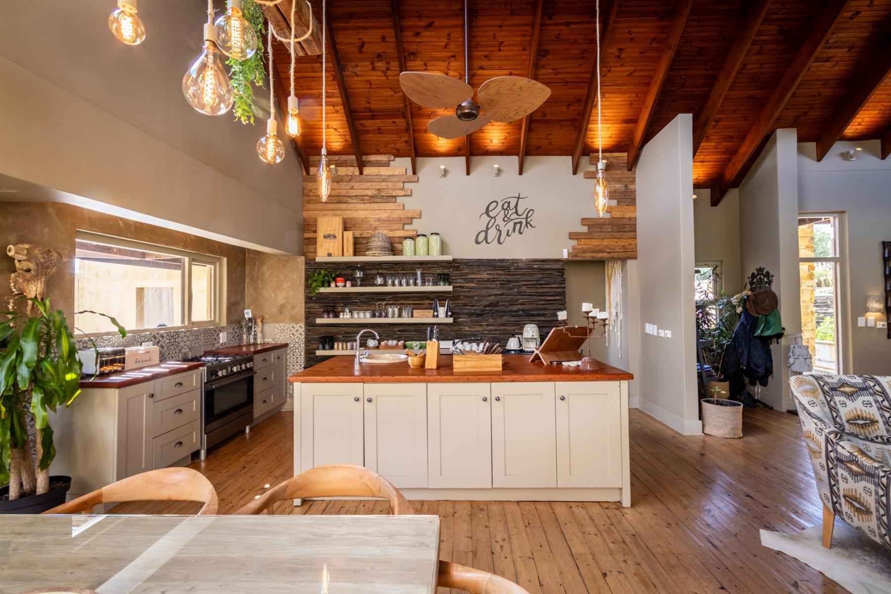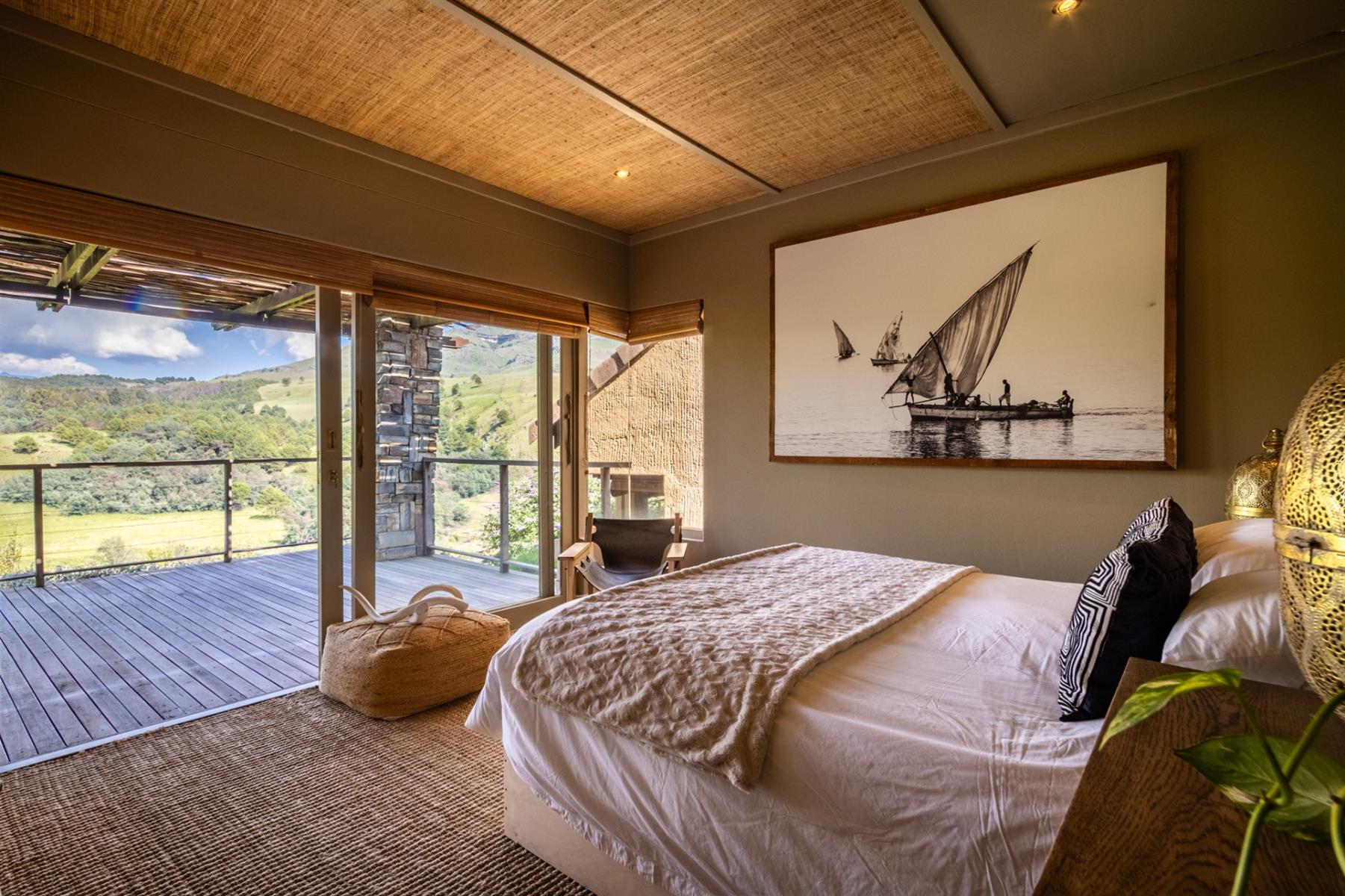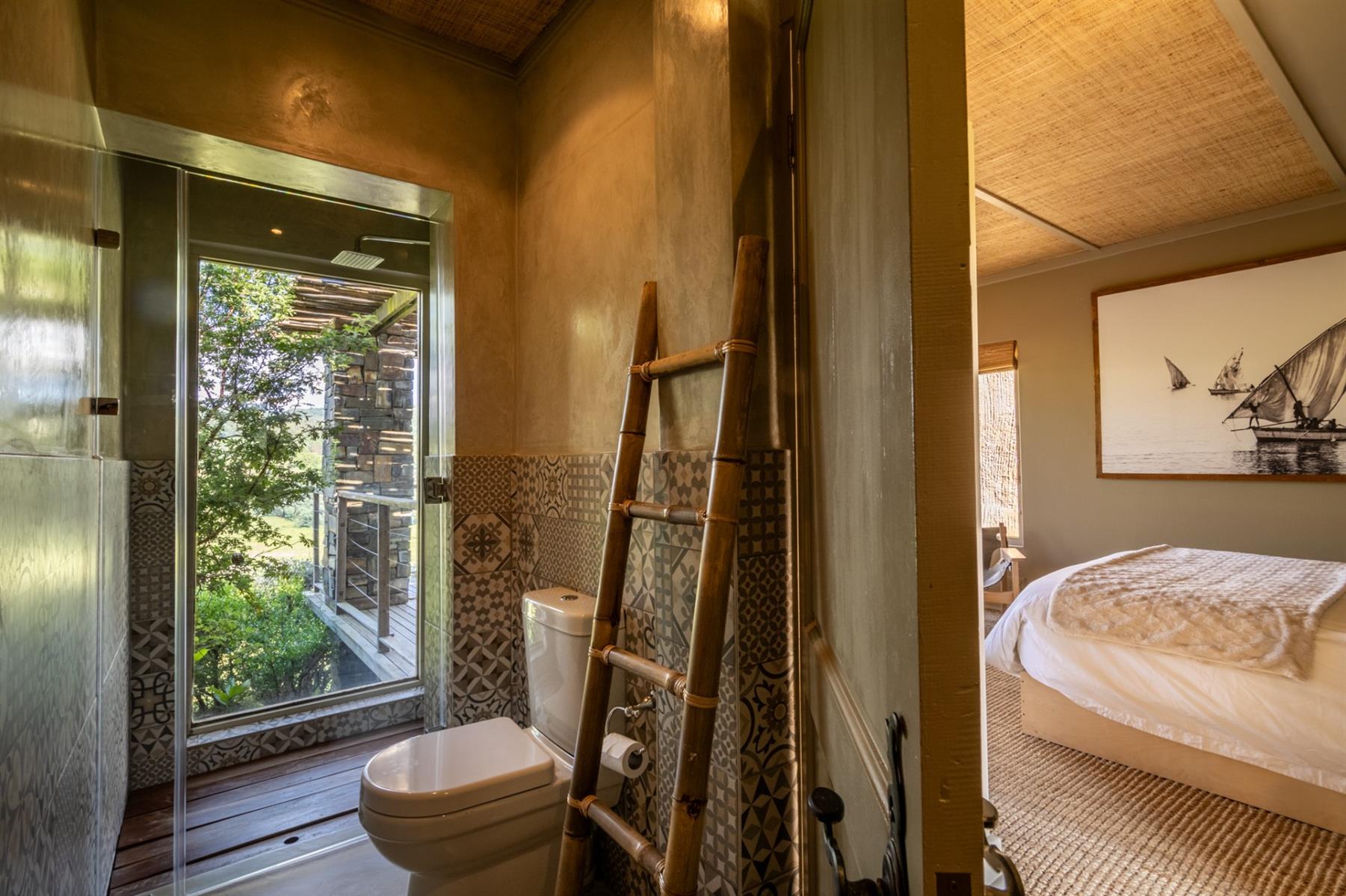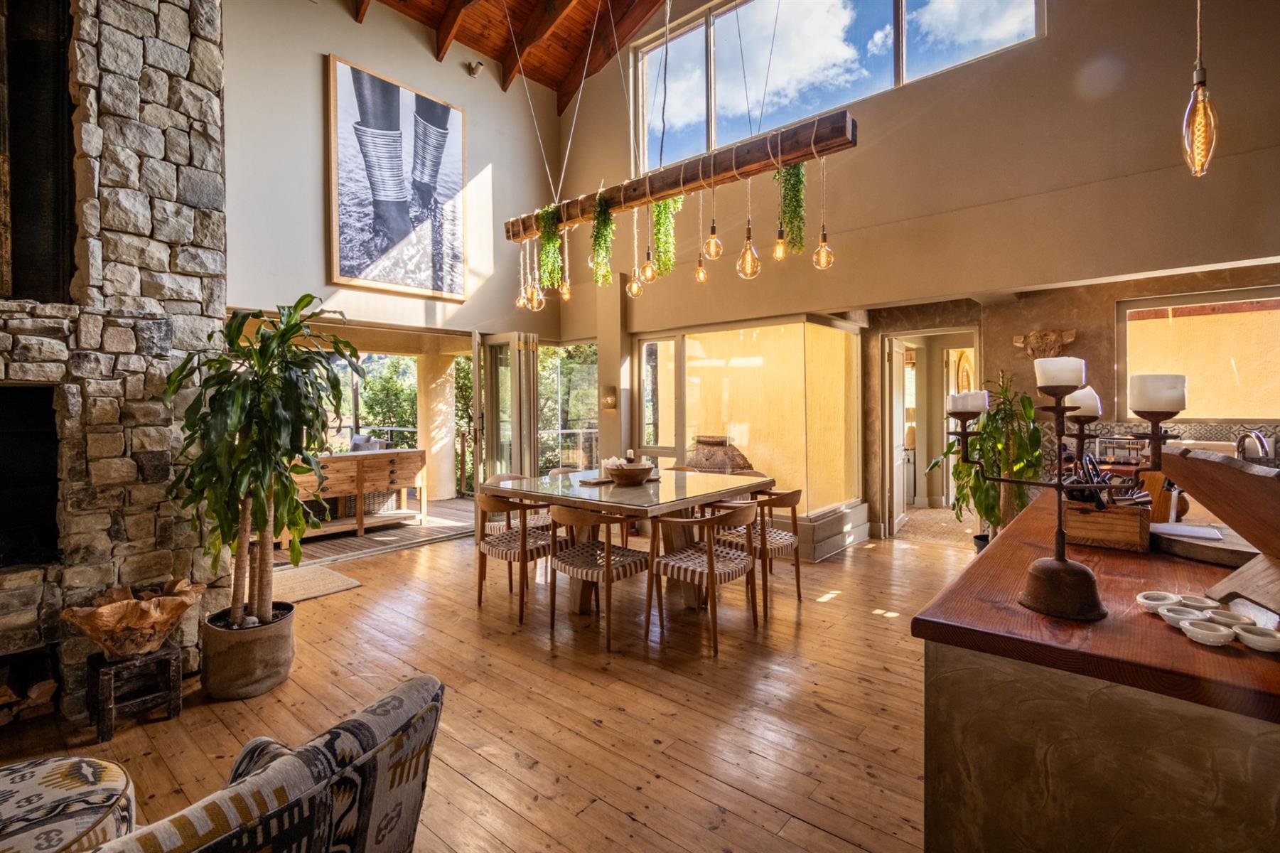 Large entertainment decks overlook wide river and mountain views that stretch from sunrise to sunset over the Drakensberg. Alfresco dining features include a long dining table, built-in gas and lava barbeque counter, a jacuzzi deck, plus a fire pit deck, creating natural gathering spaces after a day outdoors. Wines can be chosen from the naturally seasoned wined cellar.