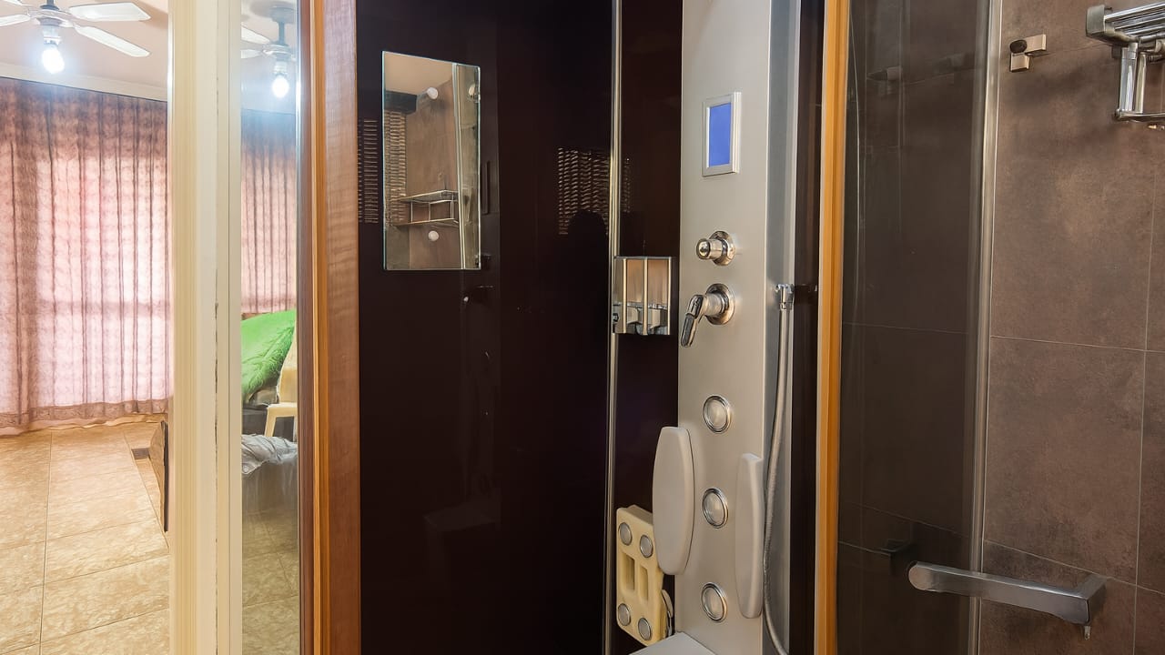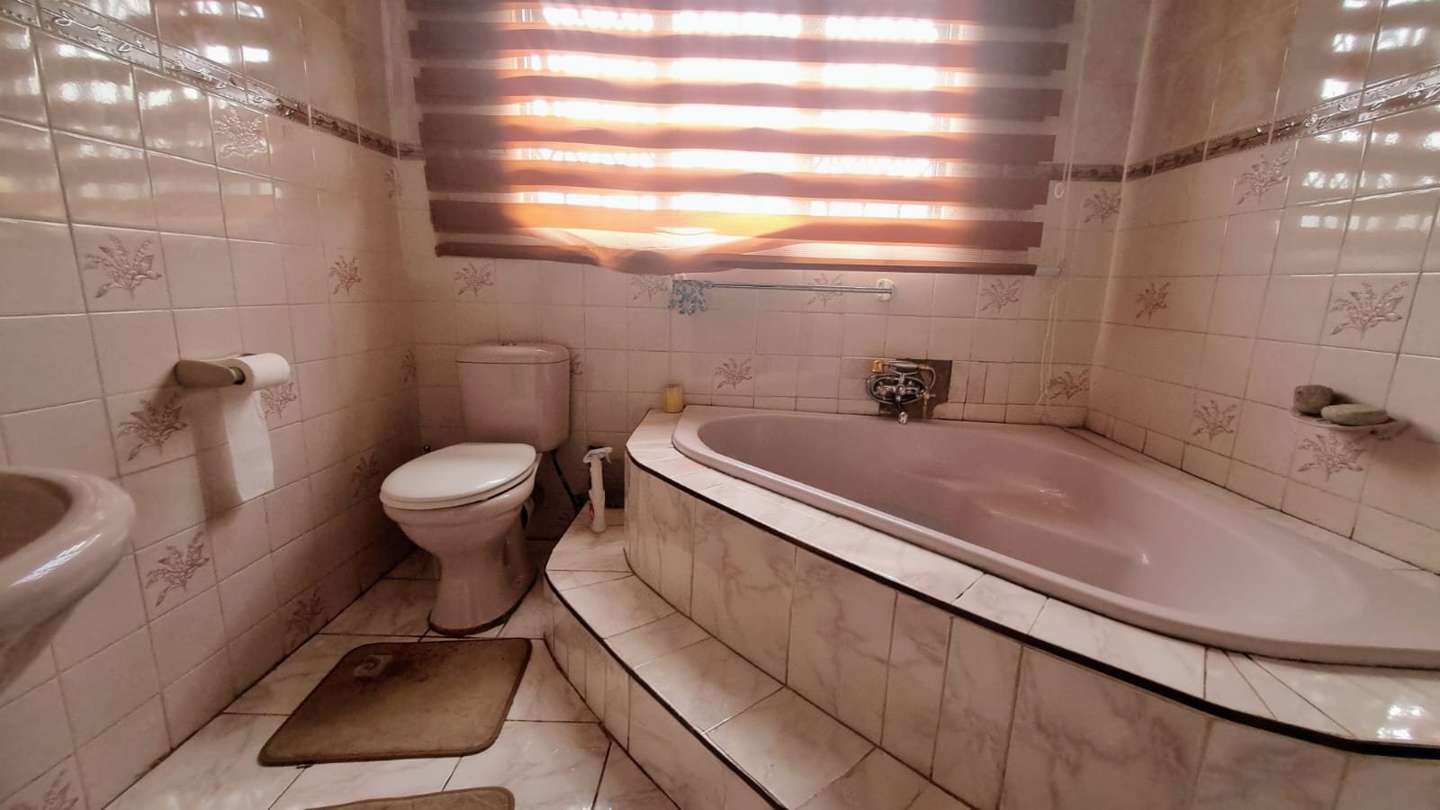Inside, you'll find four spacious bedrooms, each with built-in cupboards and large windows that flood the rooms with natural light. Three bedrooms feature carpets, while the main bedroom boasts laminated floors, a large walk-in closet, and a luxurious en-suite bathroom with a large bath, basin, and toilet. The second bathroom features a modern, luxury steam shower cabin and a basin, while the third bathroom has a freestanding bath, basin, and toilet.