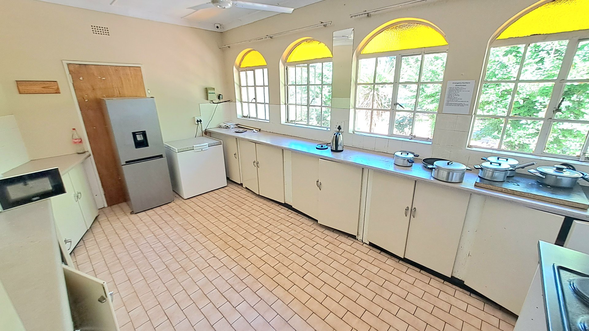 - Large communal kitchen with built-in stove, microwave and cupboards