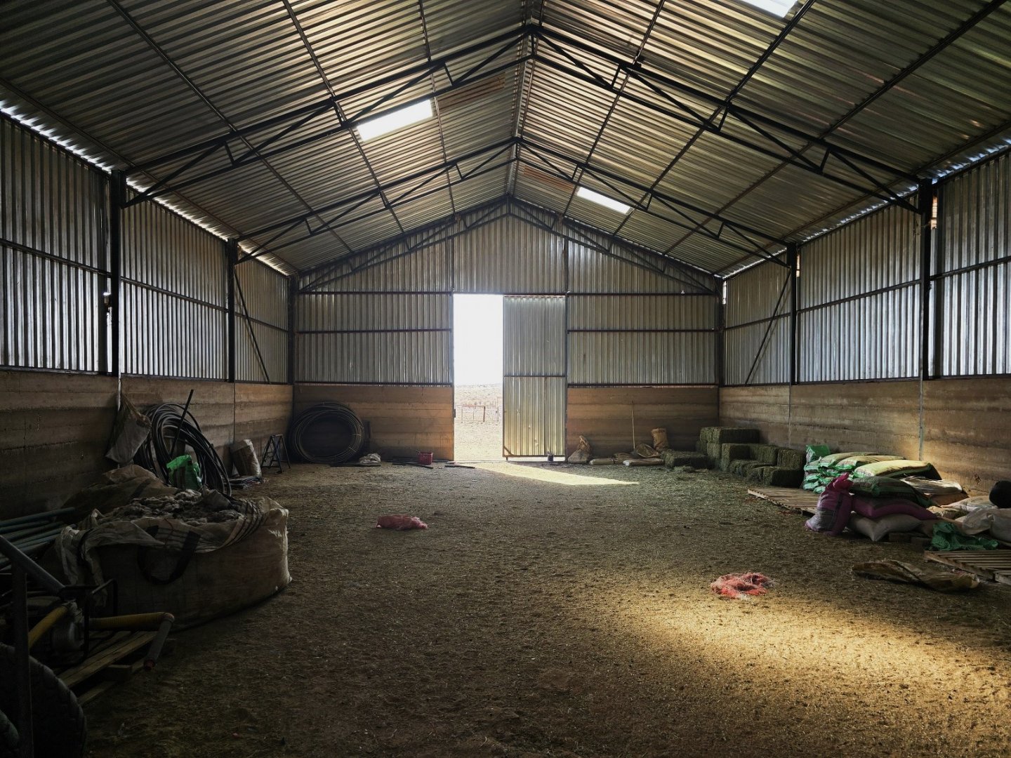 o Iron shed (351m2) with a steel structure, concrete walling, iron cladding, and ground flooring.
