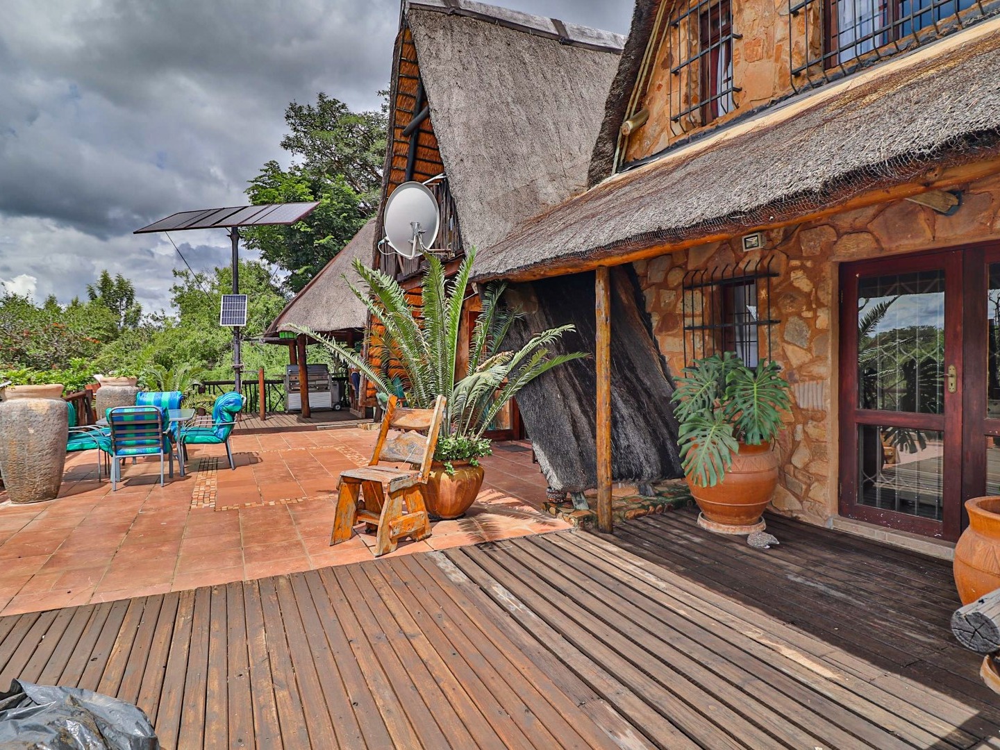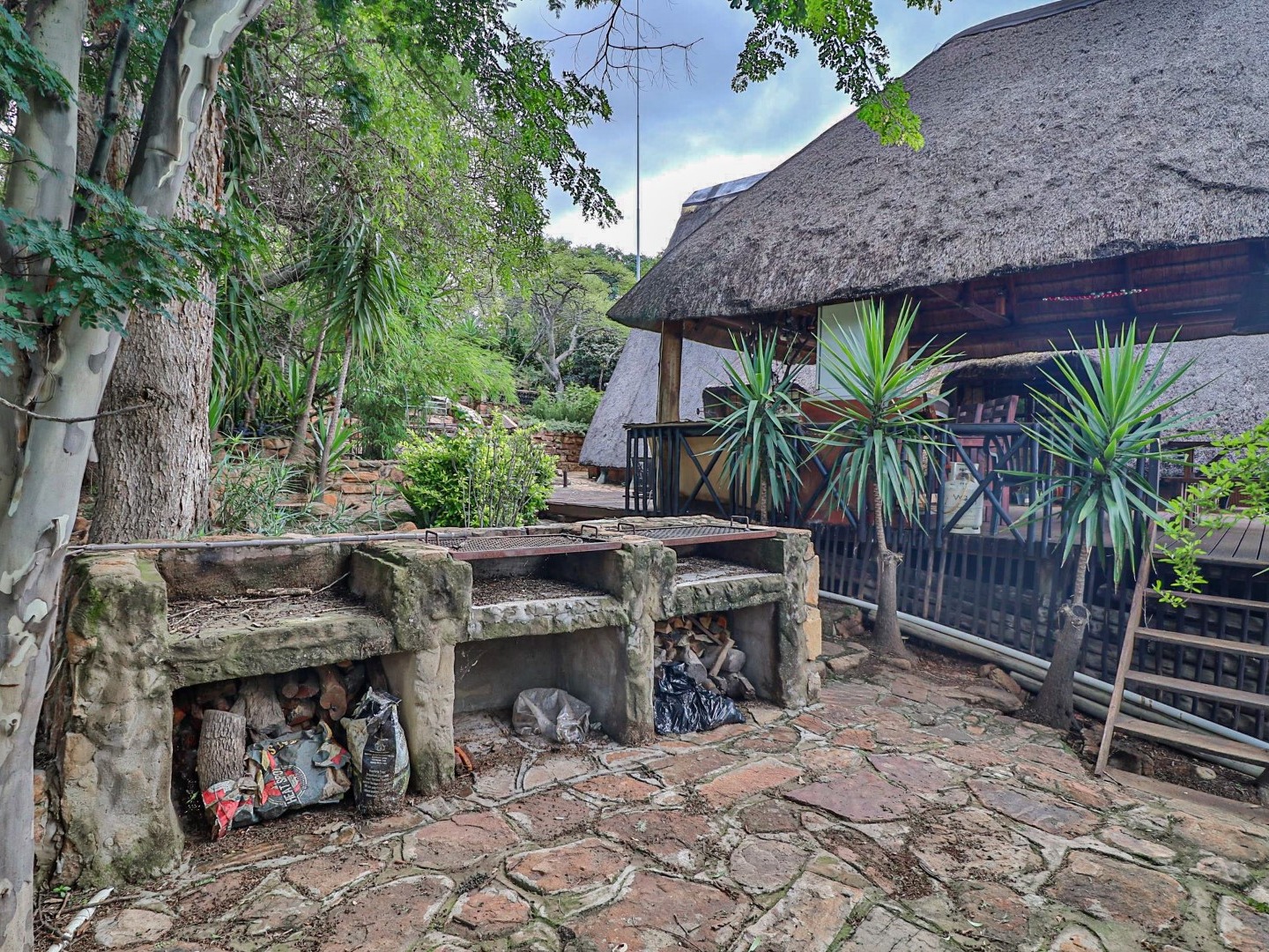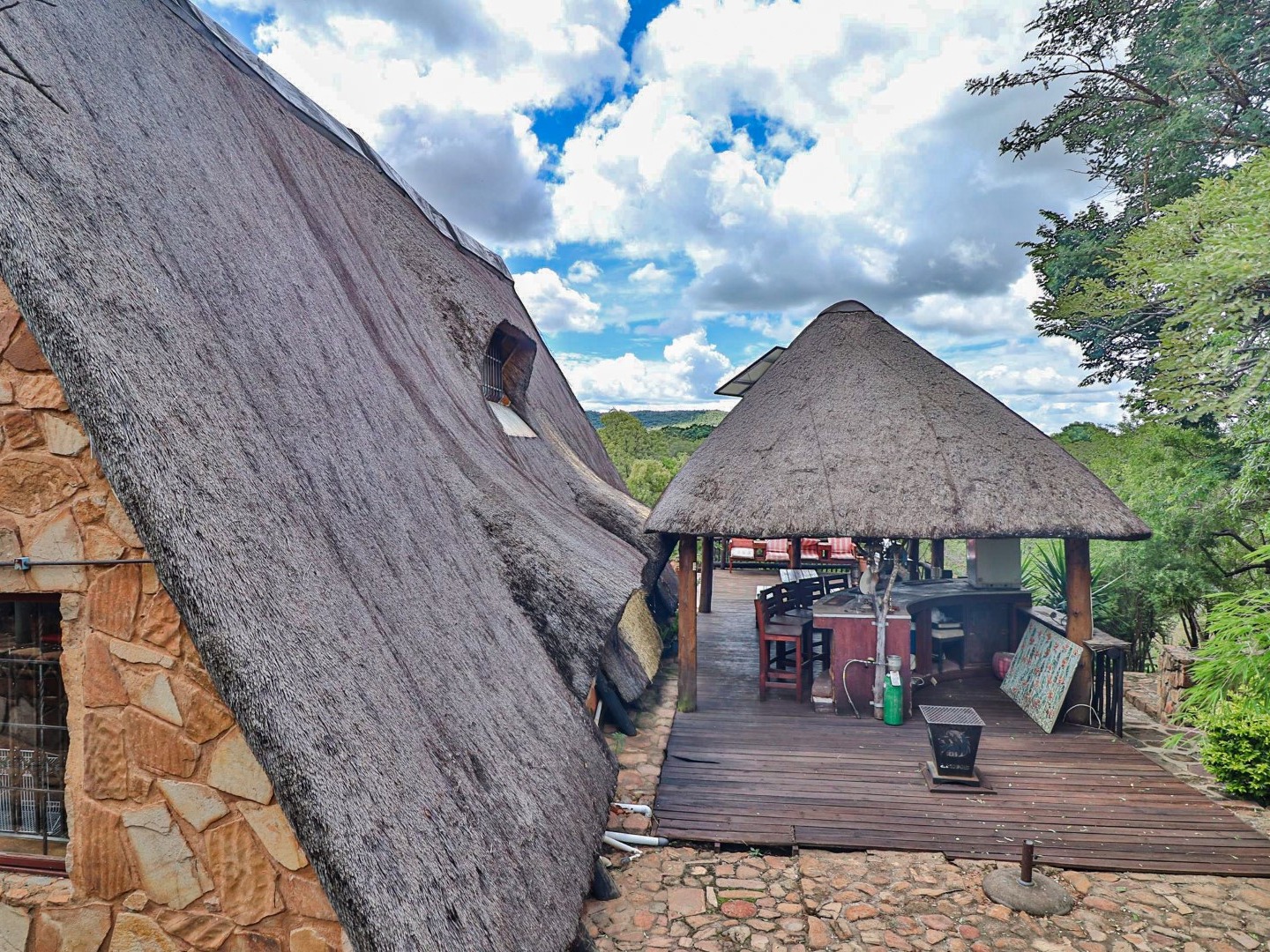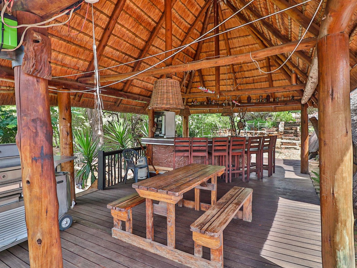 Entertainment Area: Relax in the large lapa/entertainment area with a solid wood bar counter and chairs. The stone-built double braai blends seamlessly with the natural surroundings.
