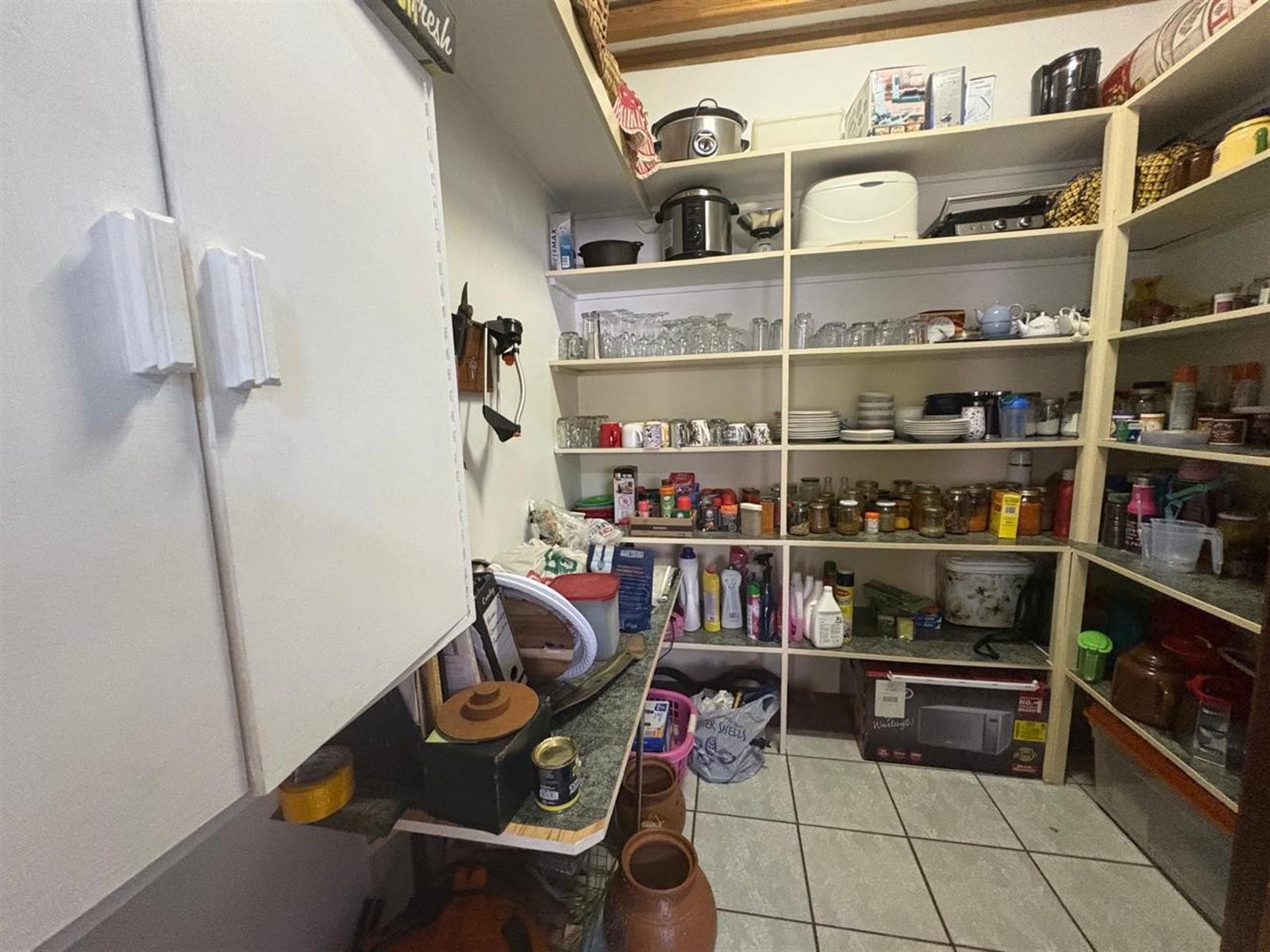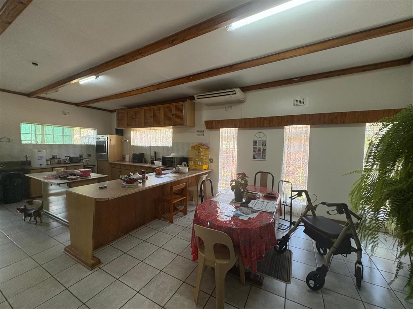 Open-plan kitchen & dining area featuring air-conditioning, gas stove, built-in oven, large pantry, and scullery