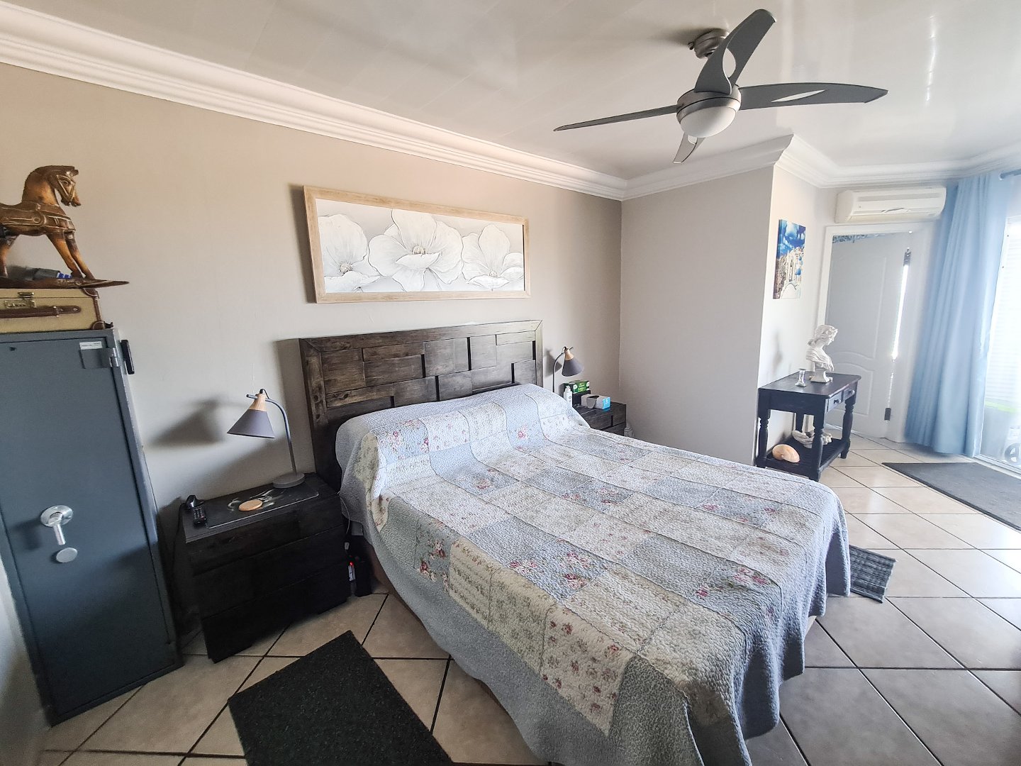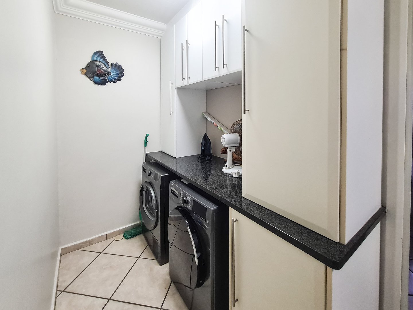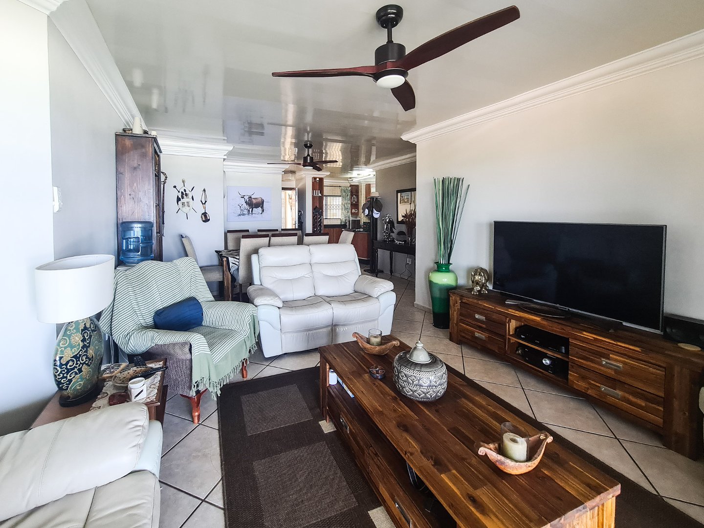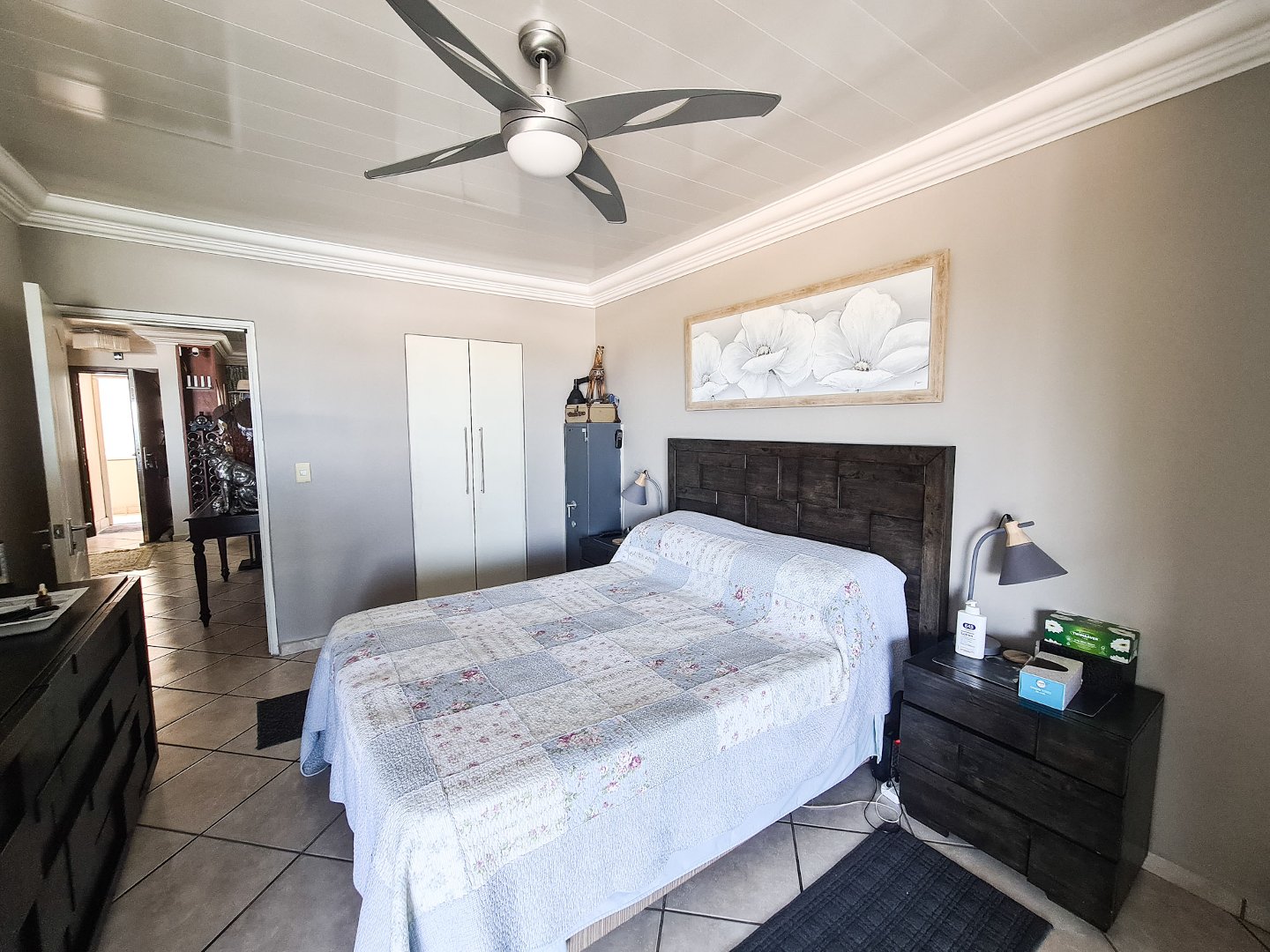 There are three well sized bedrooms, two of which open onto the balcony, and all have built-in cupboards. Embrace sustainable living with solar panels and an inverter, ensuring uninterrupted power.
