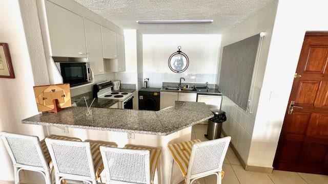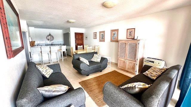 The open-plan kitchen and living space opens onto a spacious balcony, perfect for soaking in the ocean views and beach activities.