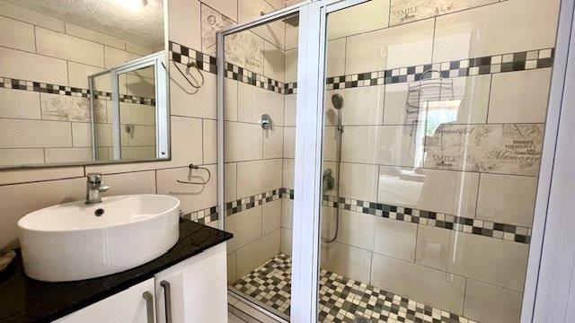 The main bedroom features an en-suite bathroom with a newly upgraded luxurious double shower.The main bedroom has a sliding door that leads out onto the spacious covered patio with awesome sea-views, creating a seamless indoor-outdoor living experience.
