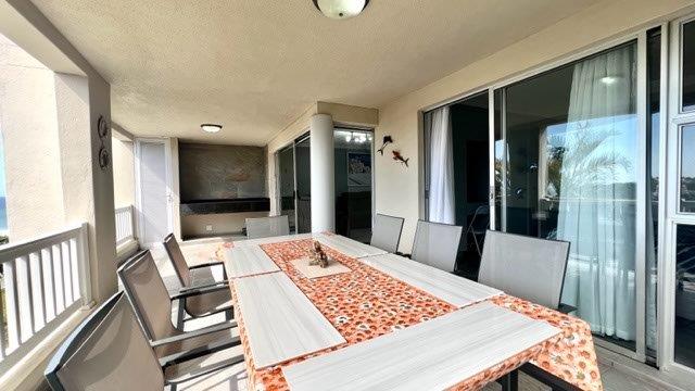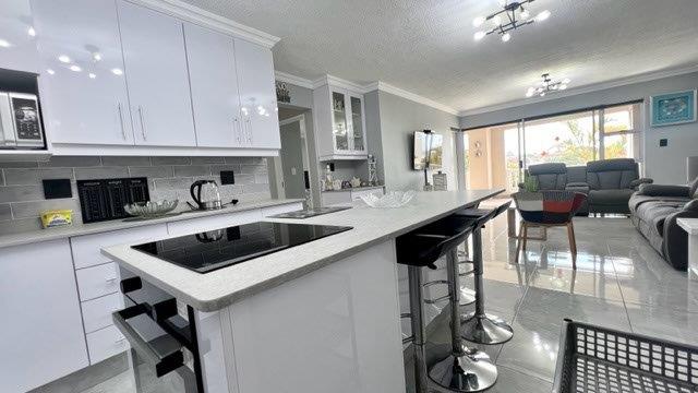 The kitchen leads into the living area which leads onto a spacious covered balcony with breath taking sea -views.