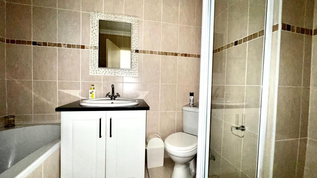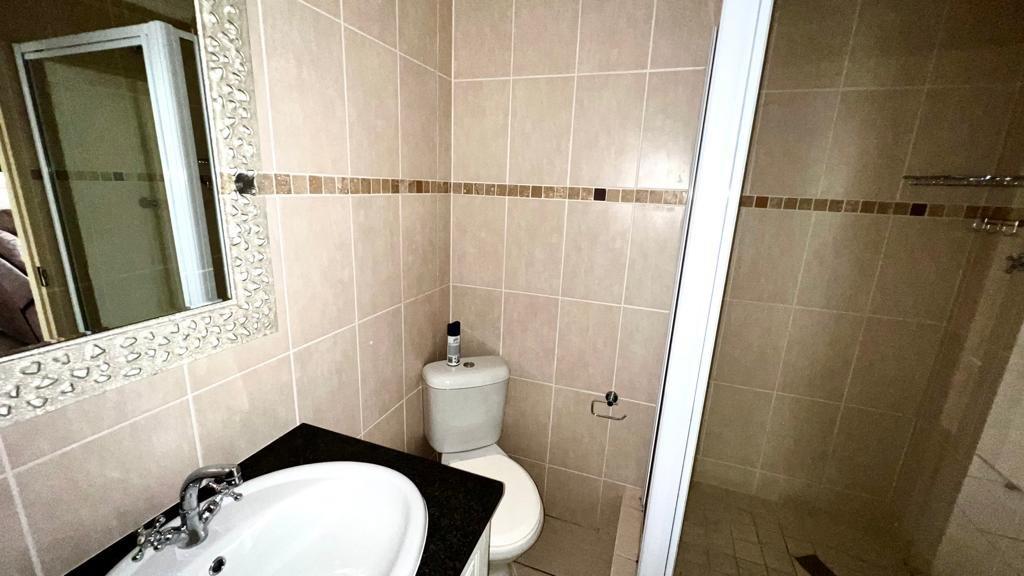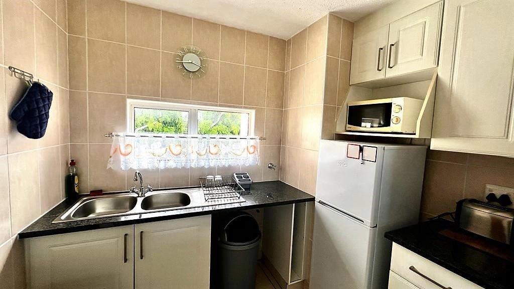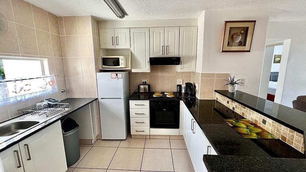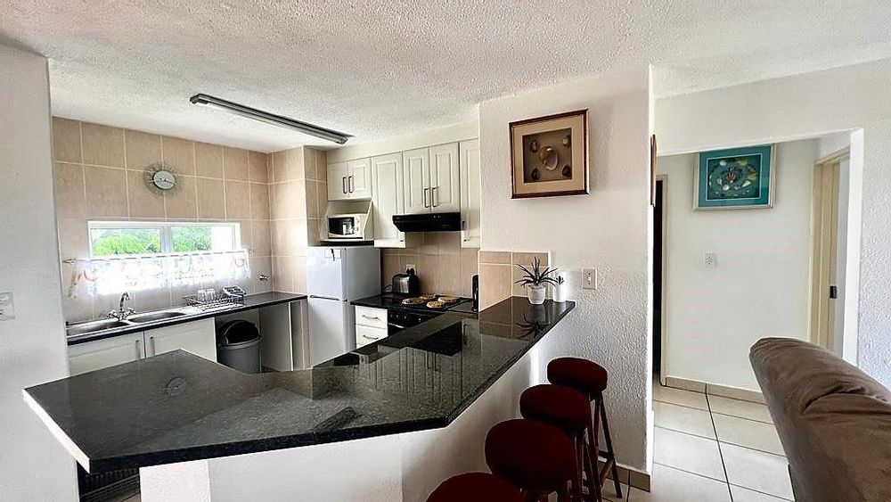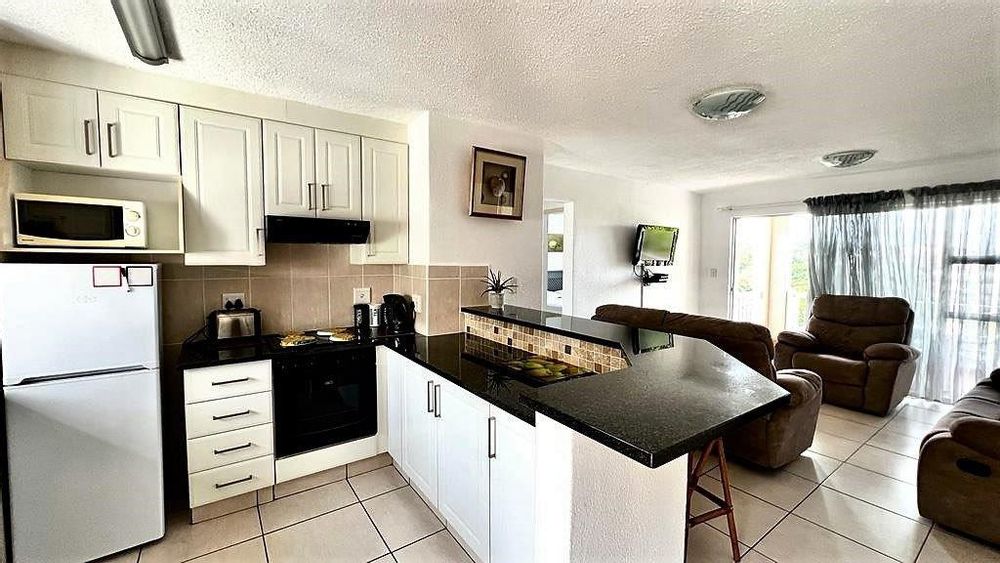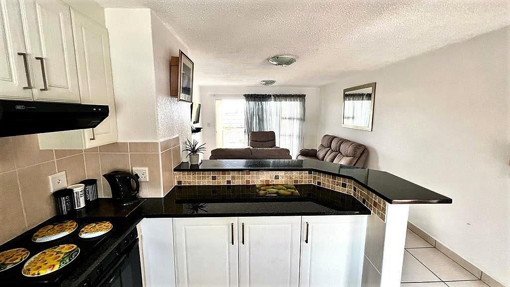 This apartment boasts an open plan, newly renovated, kitchen with granite tops, ample cupboard space, breakfast counter and connection for washing machine or dishwasher, this leads into the living area open onto the balcony with scenic garden views.