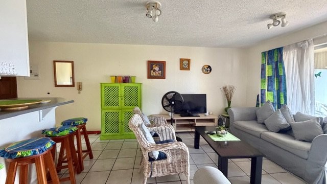 The apartment is wheelchair-friendly and sold fully furnished and equipped, ready for immediate occupation. Inside, the open-plan layout includes a practical kitchen with a breakfast nook flowing into a spacious lounge. Sliding doors open onto a patio where you can relax and enjoy the coastal atmosphere.