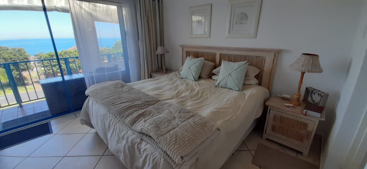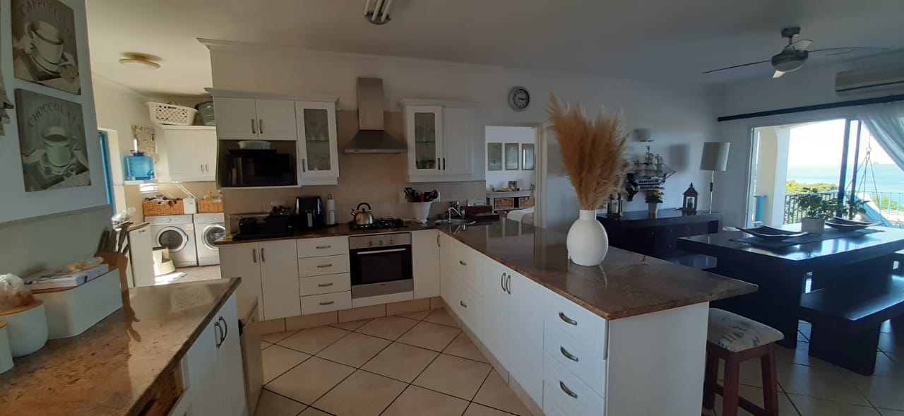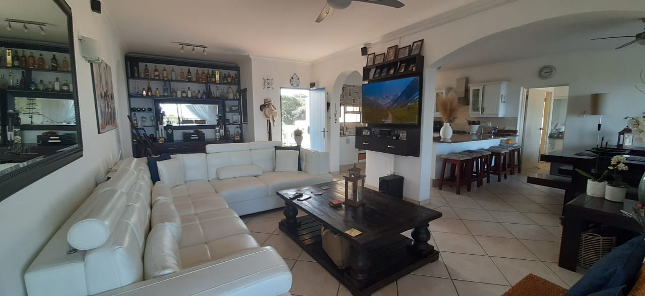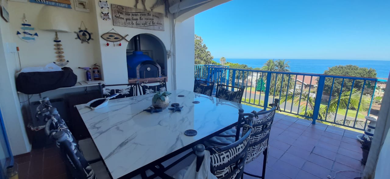 This exceptional penthouse is ideally located in a popular, well-maintained complex in Uvongo and offers outstanding space, style, and value. The modern open-plan kitchen features granite countertops, ample cupboard space, room for all appliances, and a large separate scullery. It flows seamlessly into the spacious lounge and dining areas, perfect for comfortable living and entertaining. The lounge, dining room, and two of the four bedrooms open onto a large patio with built-in braai and pizza oven, offering beautiful sea views. A section of the patio is fitted with PVC sail covers for all-weather enjoyment. The unit offers four well-sized bedrooms, including two en-suite, plus an additional bathroom. One bedroom enjoys its own private patio. A built-in inverter provides essential backup power, while the double lock-up garage with cupboards ensures secure parking and extra storage. The complex features a communal pool, kiddies’ pool, clubhouse, children’s play area, and braai facilities set among large trees. A well-priced, standout penthouse in a sought-after coastal location—don’t miss this opportunity.