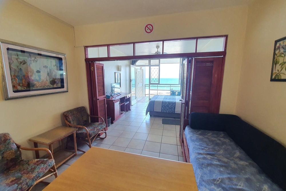 This income-generating unit offers breathtaking 180-degree sea views of Uvongo from its balcony, located just 50 meters from the renowned Uvongo beach and Pavilion restaurant. Fully furnished and ideal for self-catering, the unit comprises two bedrooms, a lounge, kitchen, bathroom with separate shower and bath. Accommodating up to 6 guests, it features a main bedroom with a double bed, a second bedroom with two single beds, and a sleeper couch in the lounge.
