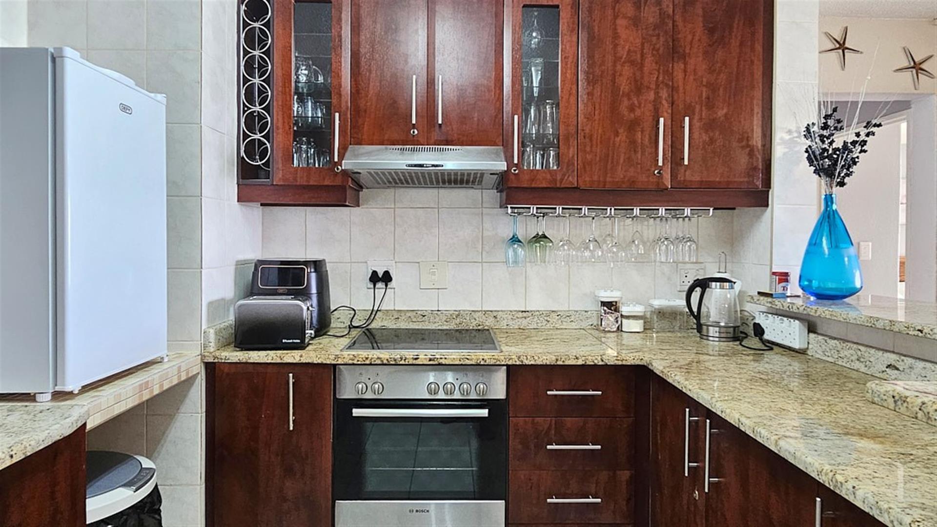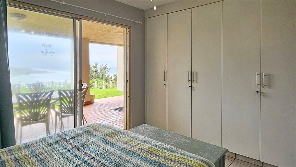 The main bedroom opens with a sliding door to the same patio with the ocean RIGHT THERE! It is en-suite to a bathroom with a large shower. There is a well placed, new washing/drying machine in this bathroom ( and it doesn`t look out of place at all ). When you go to sleep at night, you will be able to hear the gentle drum of the ocean. When you open your eyes in the morning, they will be feasting on blue ocean views. The other 2 bedrooms are spacious and share the second, supremely modern, full bathroom. IT HAS TO BE SAID: While one of the bedrooms have a queen size bed in, the other has bunker beds from a different world... German engineering indeed! They have been designed and specially made of stainless steel ( because rust is a problem so close to the ocean ). They are absolutely beautiful and practical with drawers at the bottom... most splendid indeed!!! The apartment is optimally located in the most sought after security complex on the South Coast. The complex has fully integrated, filtered borehole water. There are 2 swimming pools with communal braai areas, tennis quarts, a laundry and exceptional security. The complex is extremely well maintained with on site management. The apartment comes with an under cover parking with plenty of visitor`s parking. DIRECT ACCESS TO THE BEACH!!! Give me a call!!