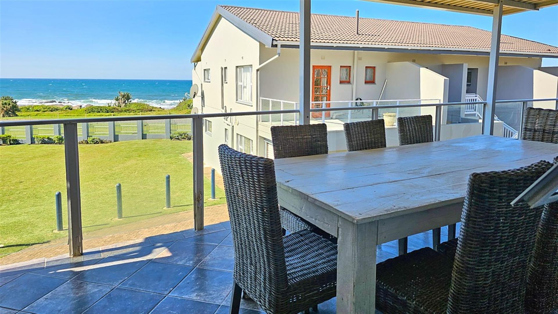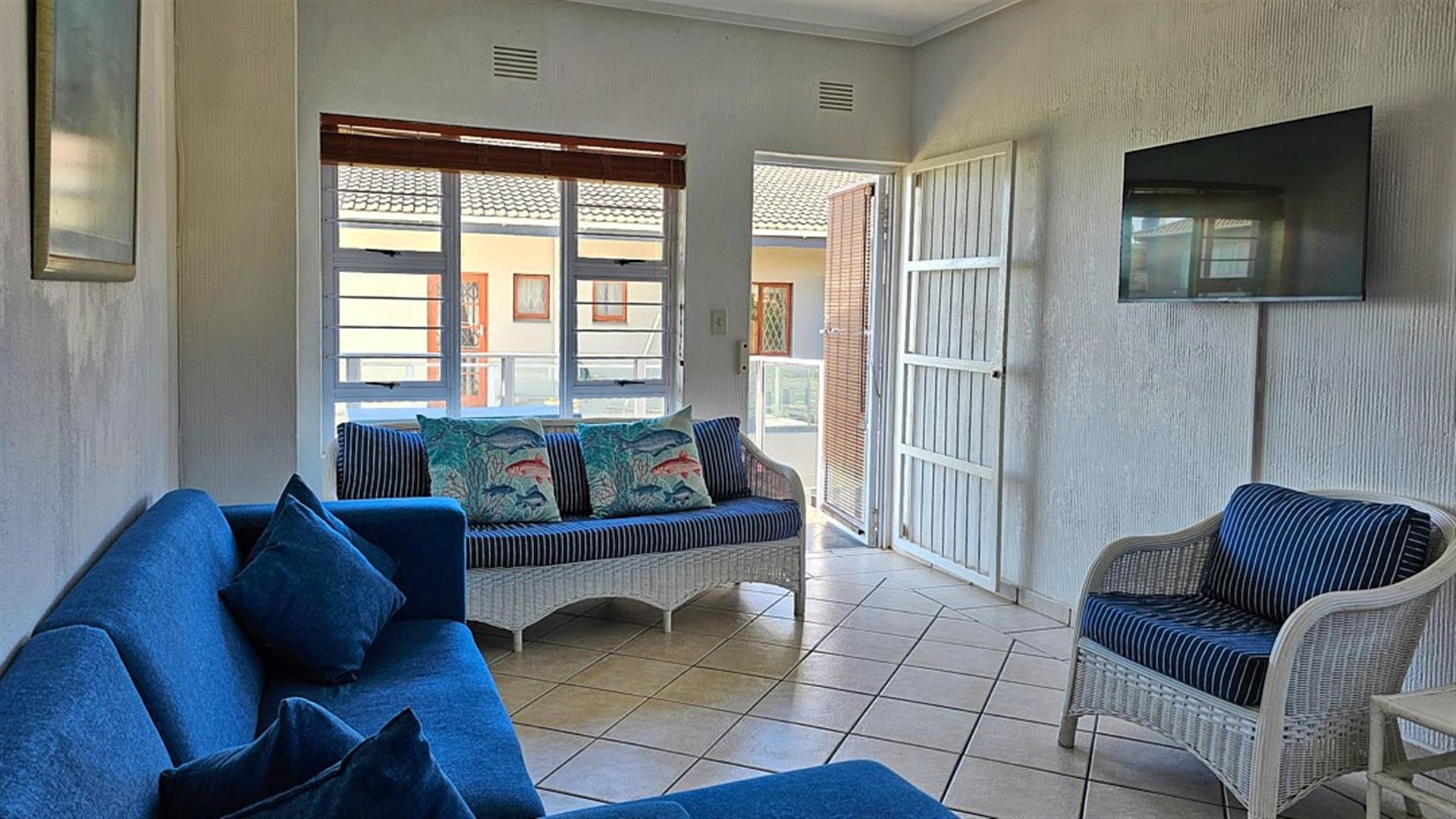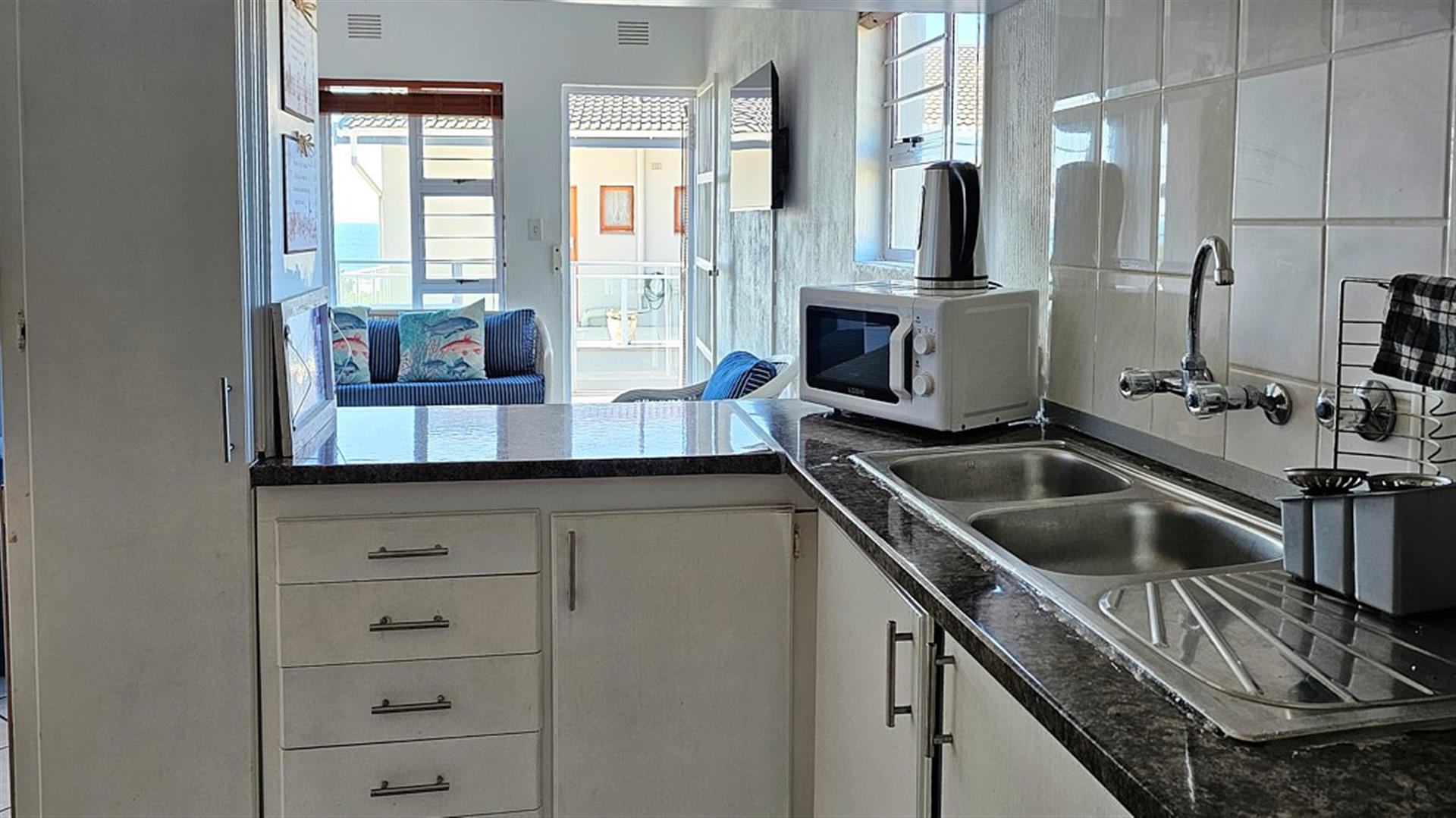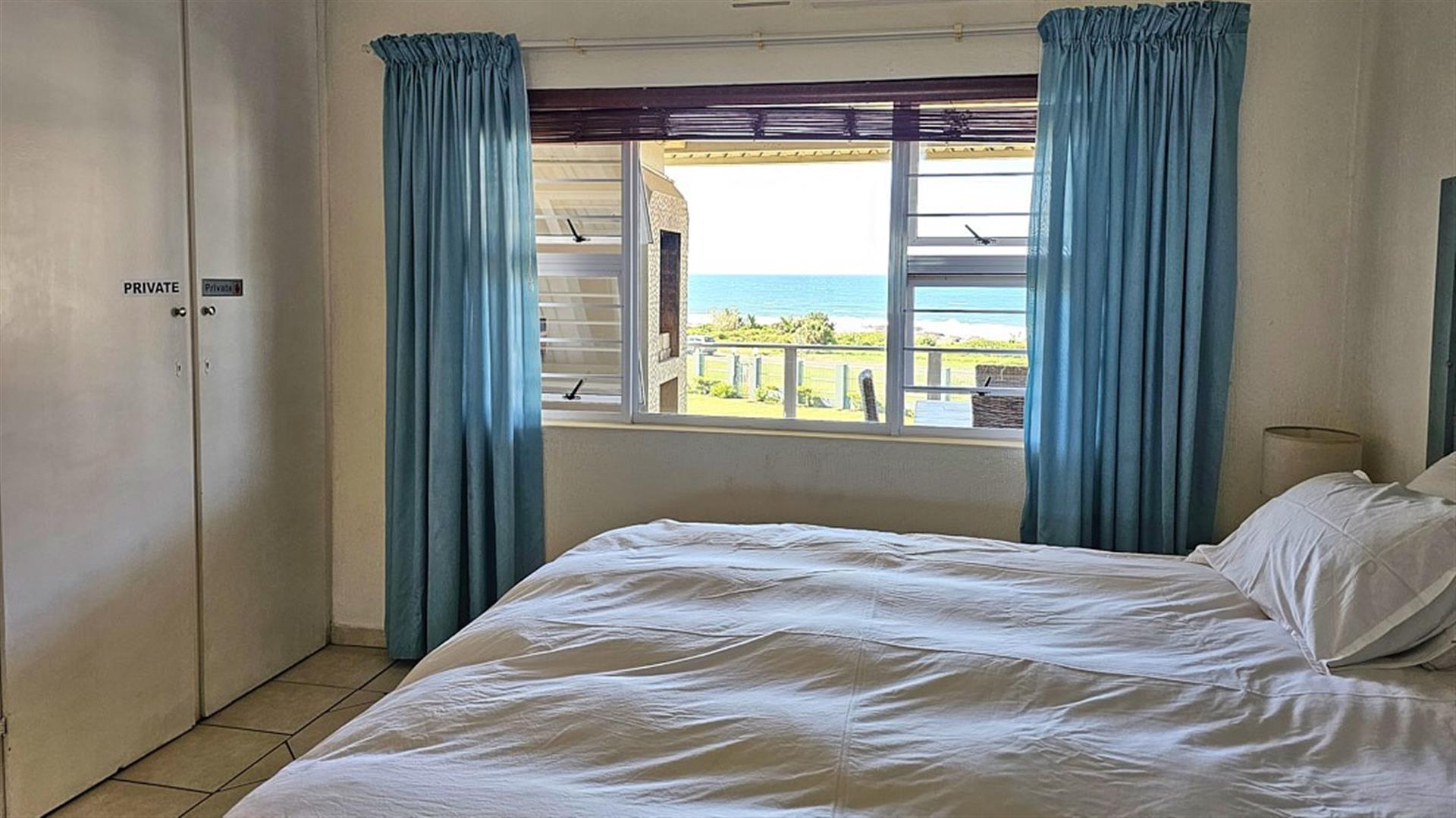 INVESTMENT BEACH Apartment JACKPOT!! AND PET FRIENDLY TOO! As you enter the PRISTINE, LIGHT open plan living/ dining/ kitchen area the intensity of the ocean takes your breath away. SEA VIEWS TO DIE FOR.....AND MORE SEA VIEWS TO LIVE FOR!!! Absolute BEACH BLISS! The apartment oozes a holiday vibe that is hard to find. Professionally decorated with quality furniture, the blue and white theme accentuates the closeness of the ocean. Filled with natural ight, the lounge area opens to an absolutely HUGE balcony, from where you can admire the ocean all day and night long. The florescent white of the waves will keep you enthralled as you relax before bedtime on the balcony. This balcony is a perfect entertainment area when you have friends over, with a built in REAL braai... what a bonus indeed!! The kitchen is spacious and light, shimmering white with same said, stunning sea views. It has all the appliances that you could possibly need. Beautiful!